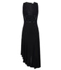 Il vestito è smanicato con scollo a V e si distingue per i dettagli in vinile che scolpiscono la figura con linee di ispirazione bustier. La gonna ha taglio asimmetrico, esaltato da studiati drappeggi. Un piccolo logo gioiello illumina il punto vita.