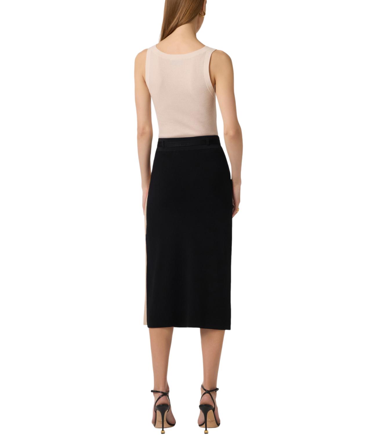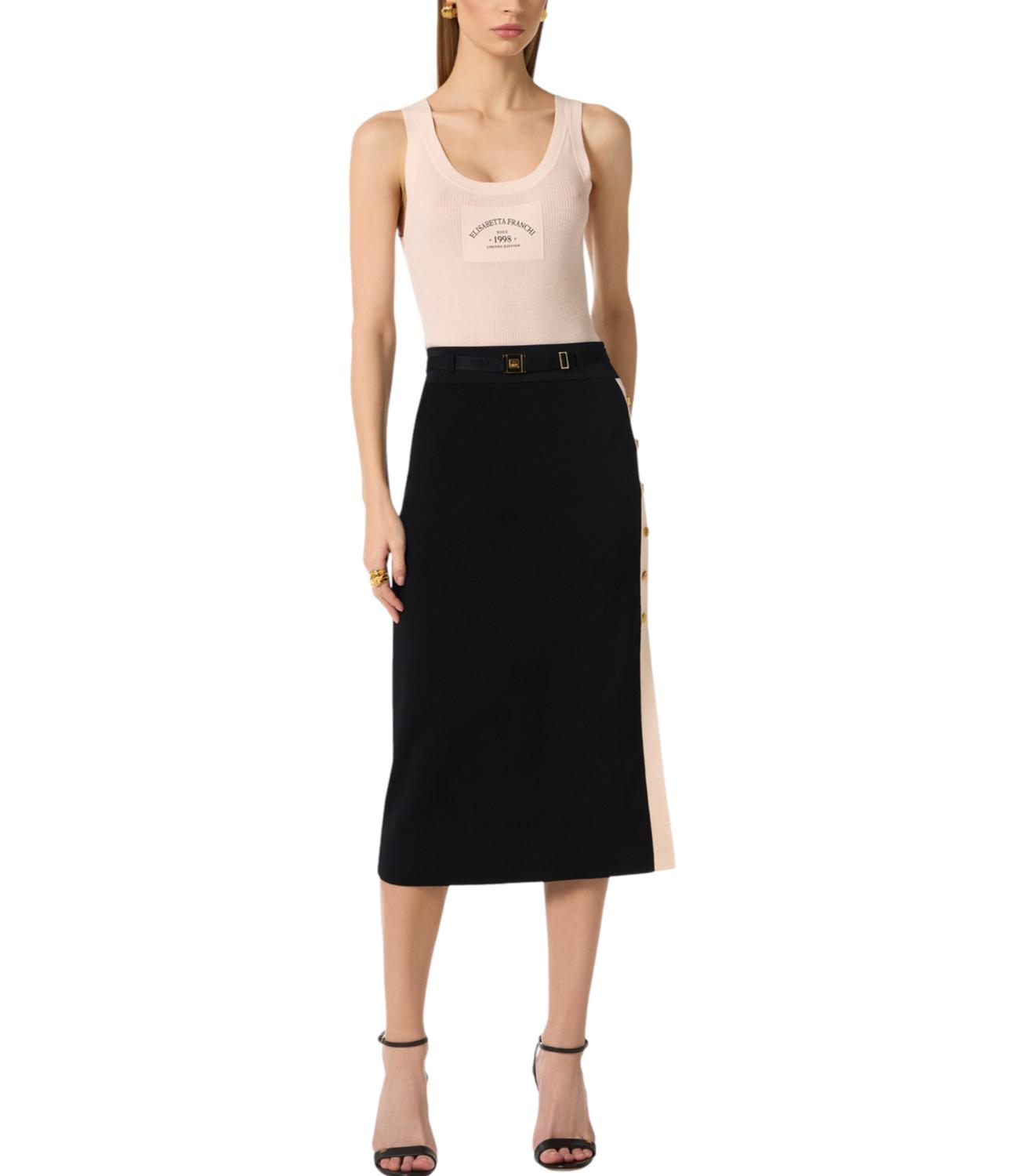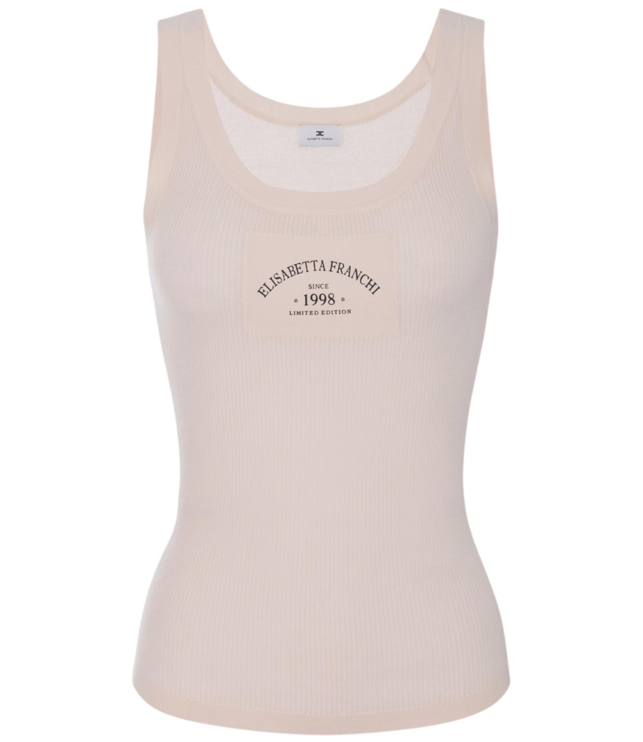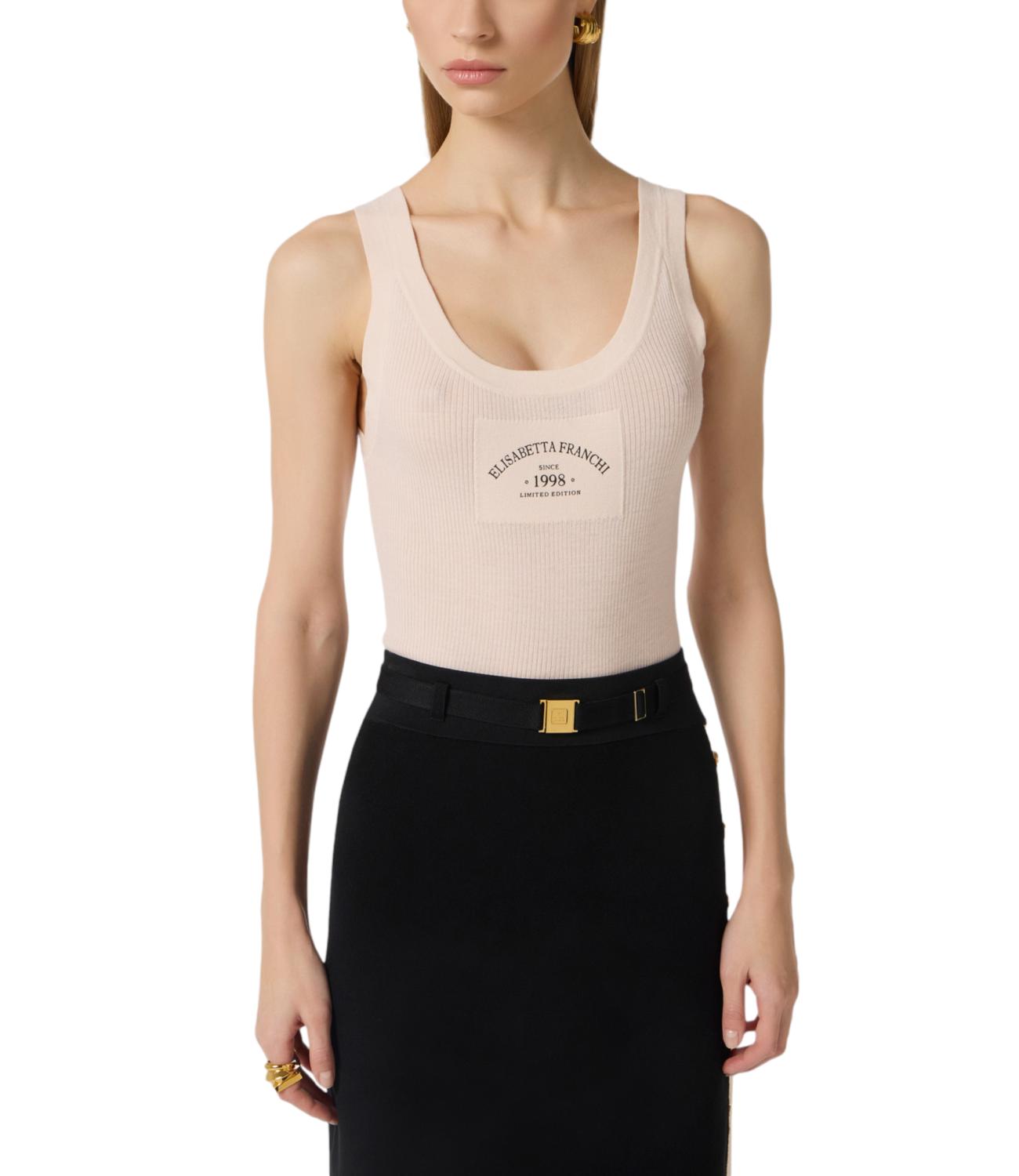 Top in maglia con scollo rotondo. Ha lavorazione a costine e si distingue per l'intarsio in maglia rasata dove compare la stampa con logo. Vestibilità aderente.