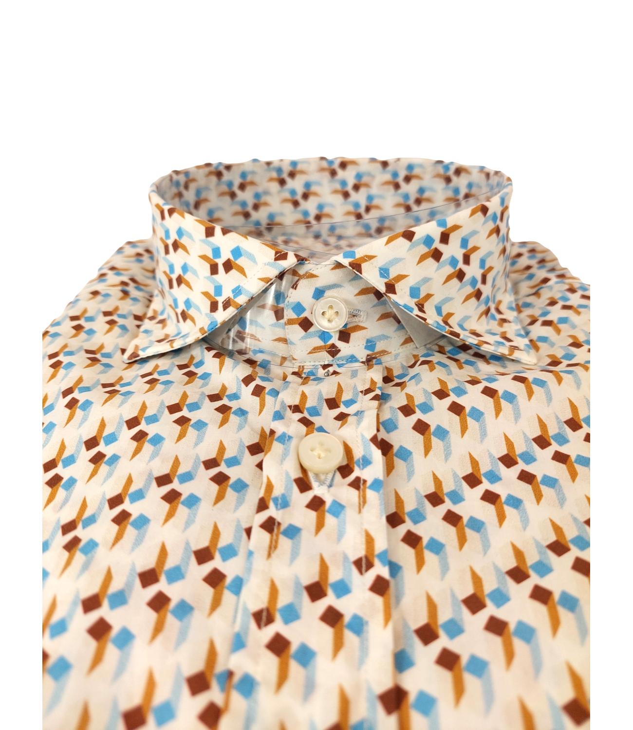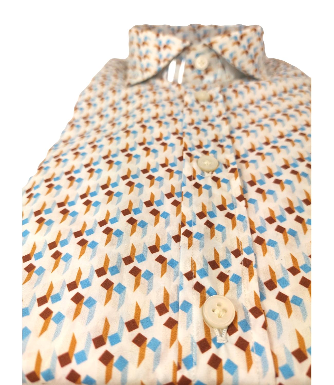 Camicia in cotone linato BASTONCINO con fantasia bianca marrone e celeste con bottone in madreperla