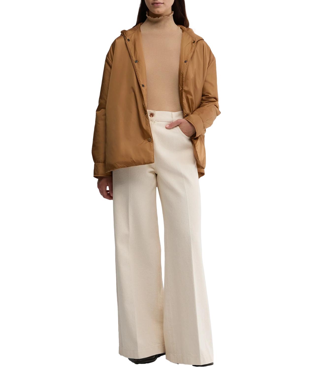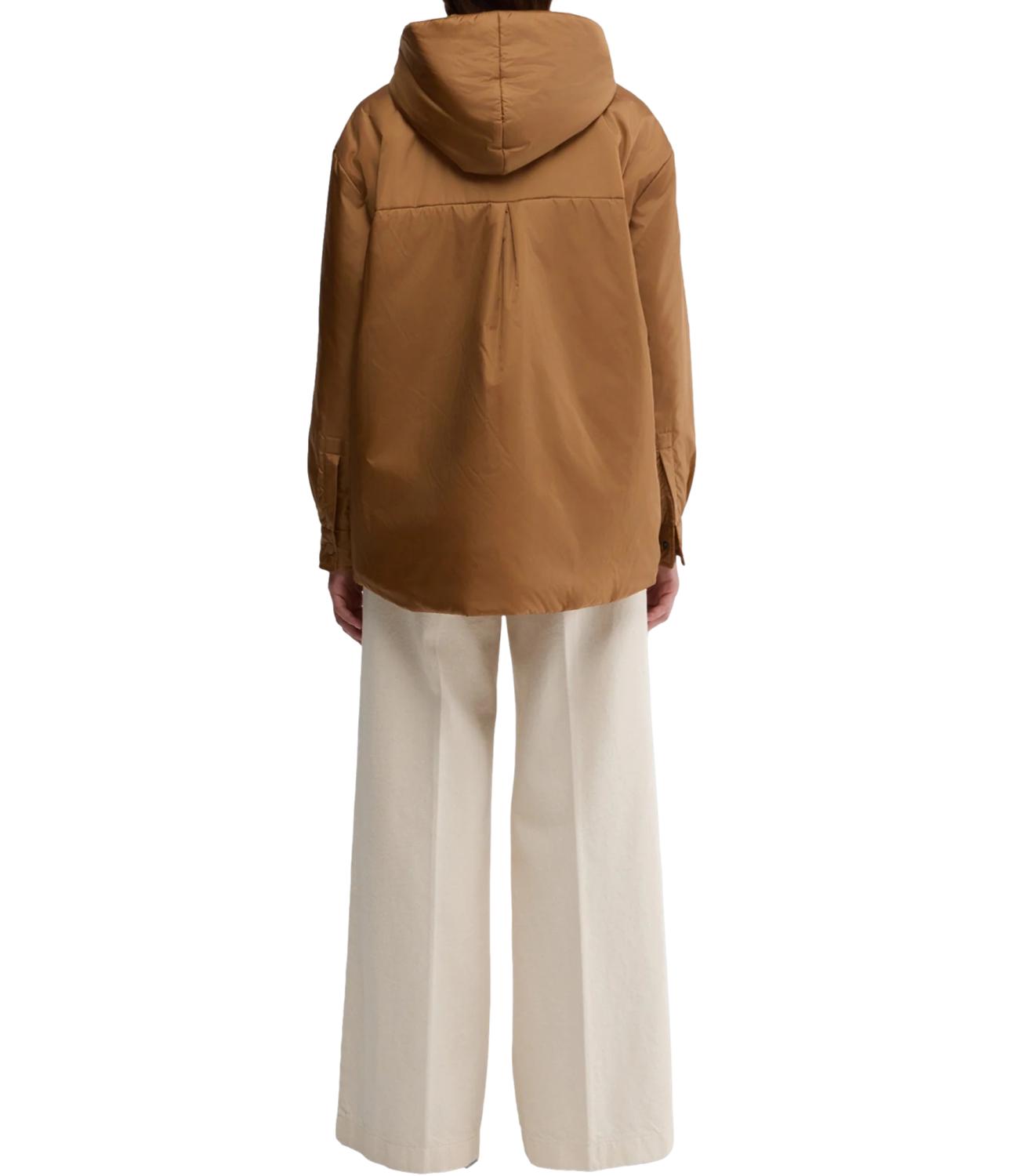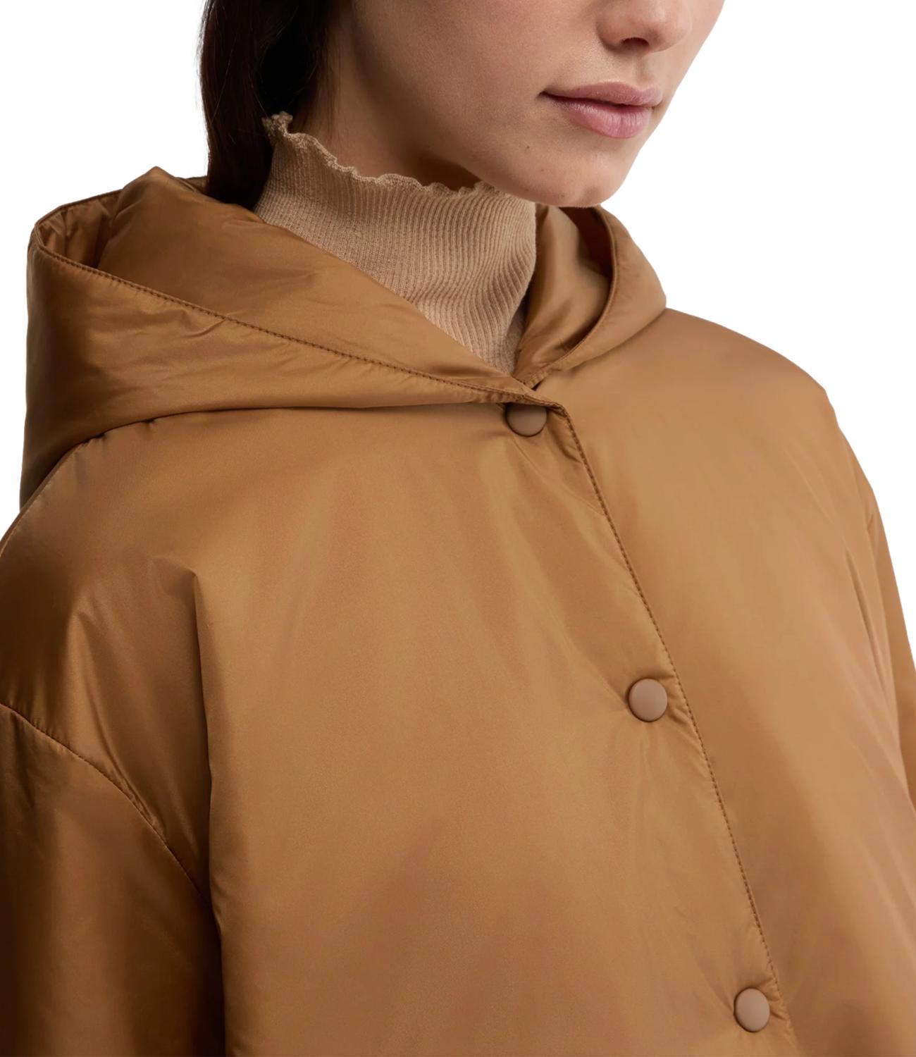 Giubbotto in nylon leggero e morbido, imbottito con ovatta thermore peso medio. Cappuccio fisso, chiusura con bottoni a pressione a vista, tasche inserite in cucitura fianchi, etuchetta personalizzata con loso aspesi a micro iniezione.