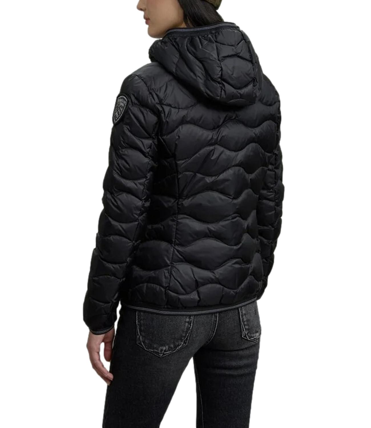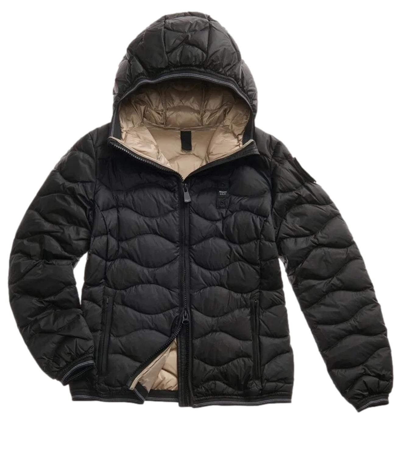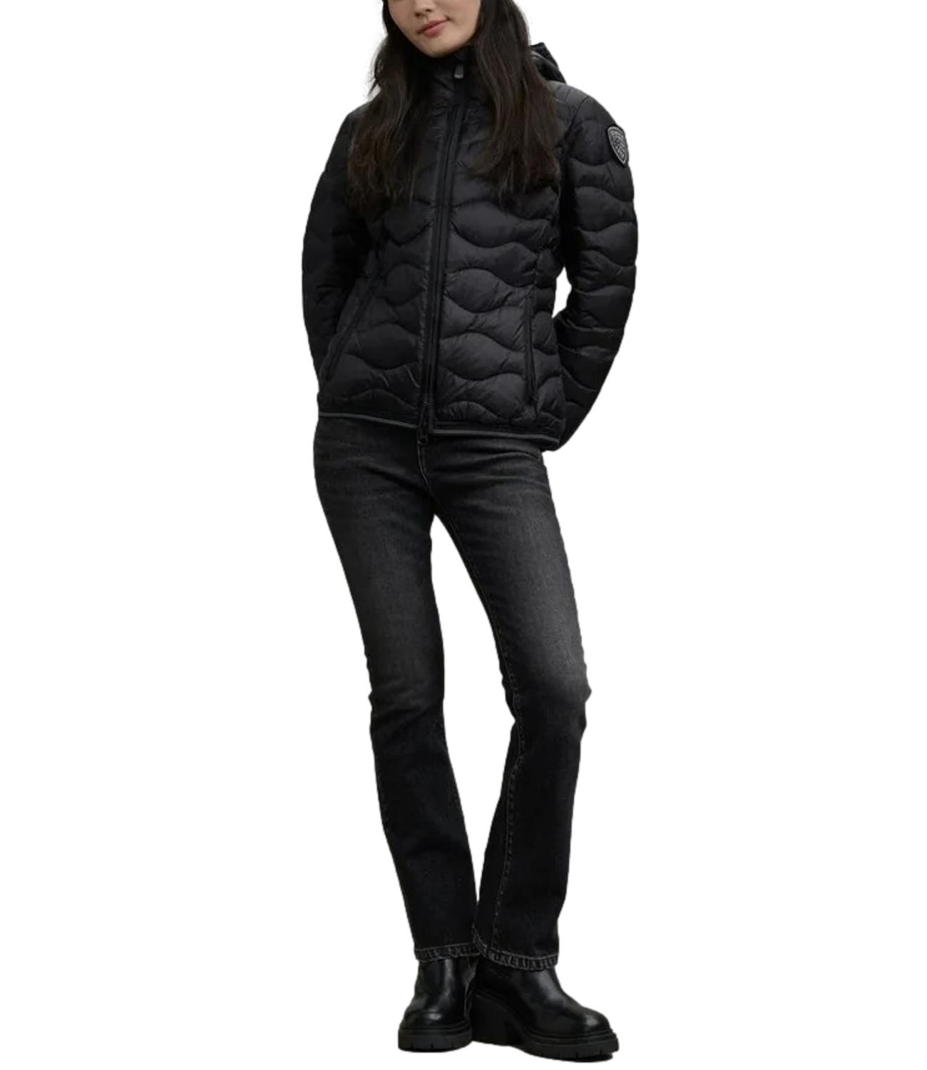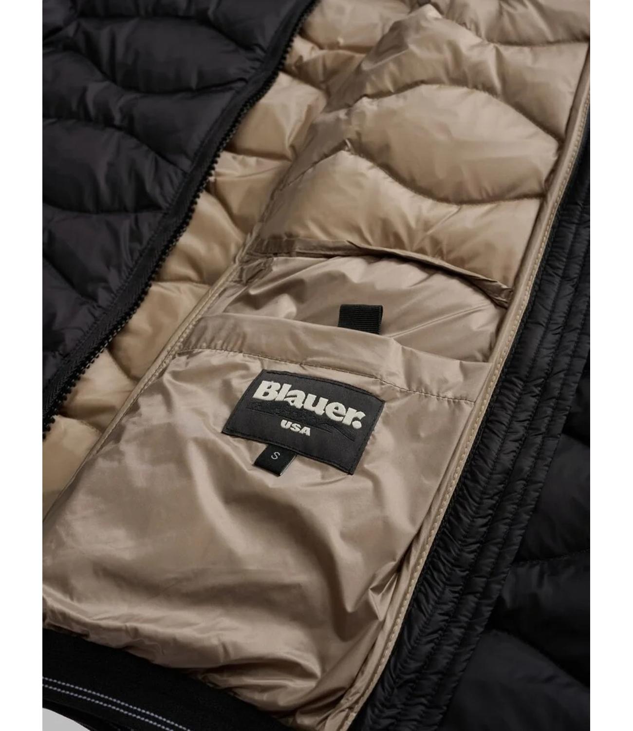 Piumino idrorepellente trapuntato ad onde orizzontali dal taglio svasato. Capo iconico Blauer con imbottitura naturale, calda e non ingombrante.