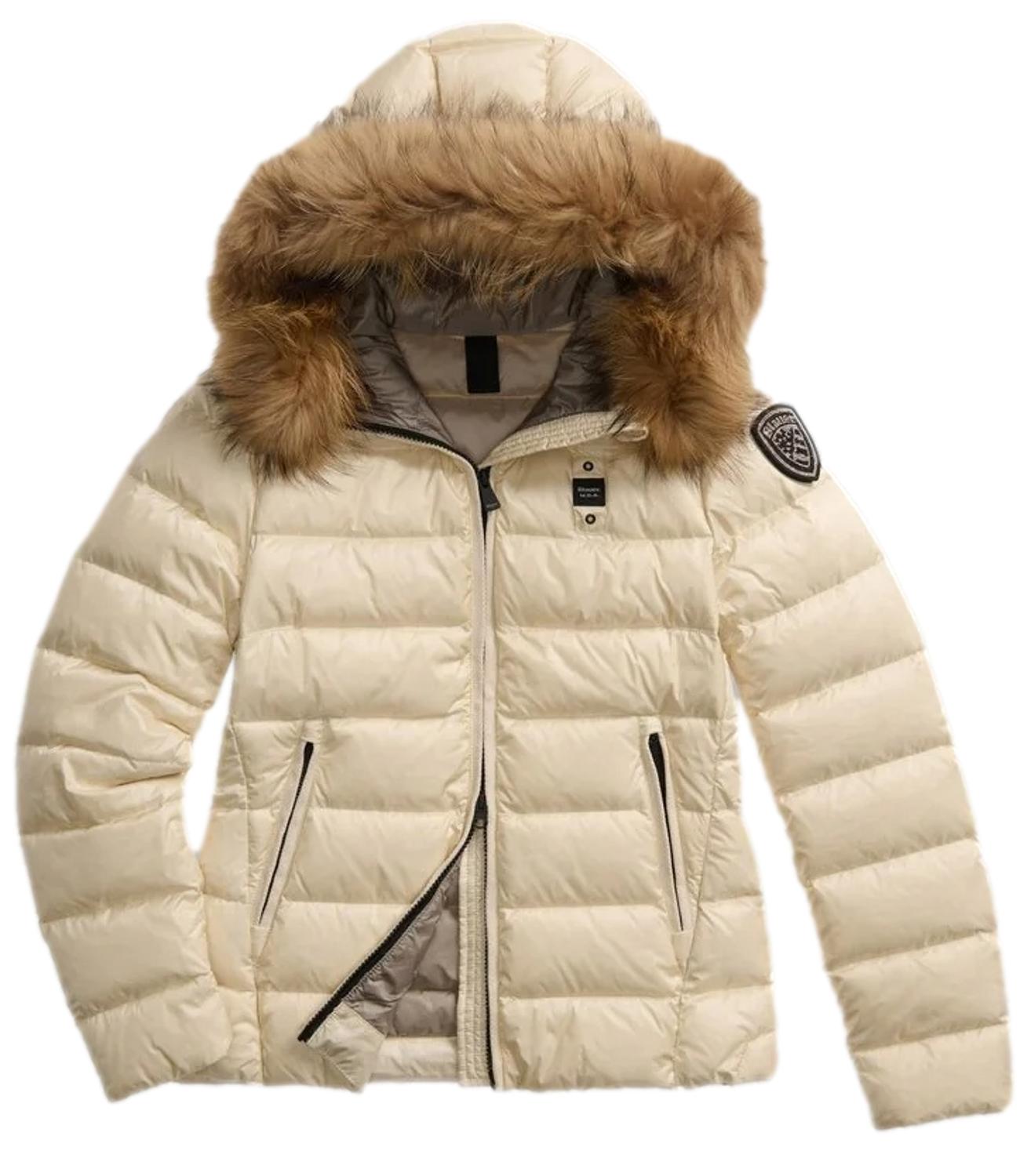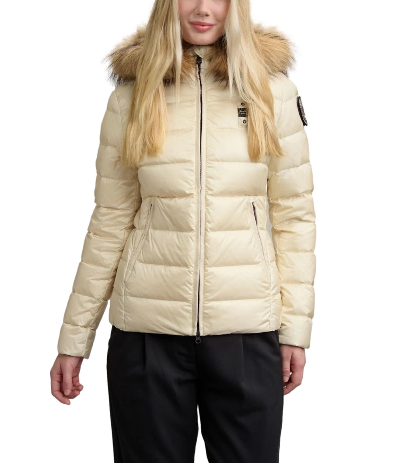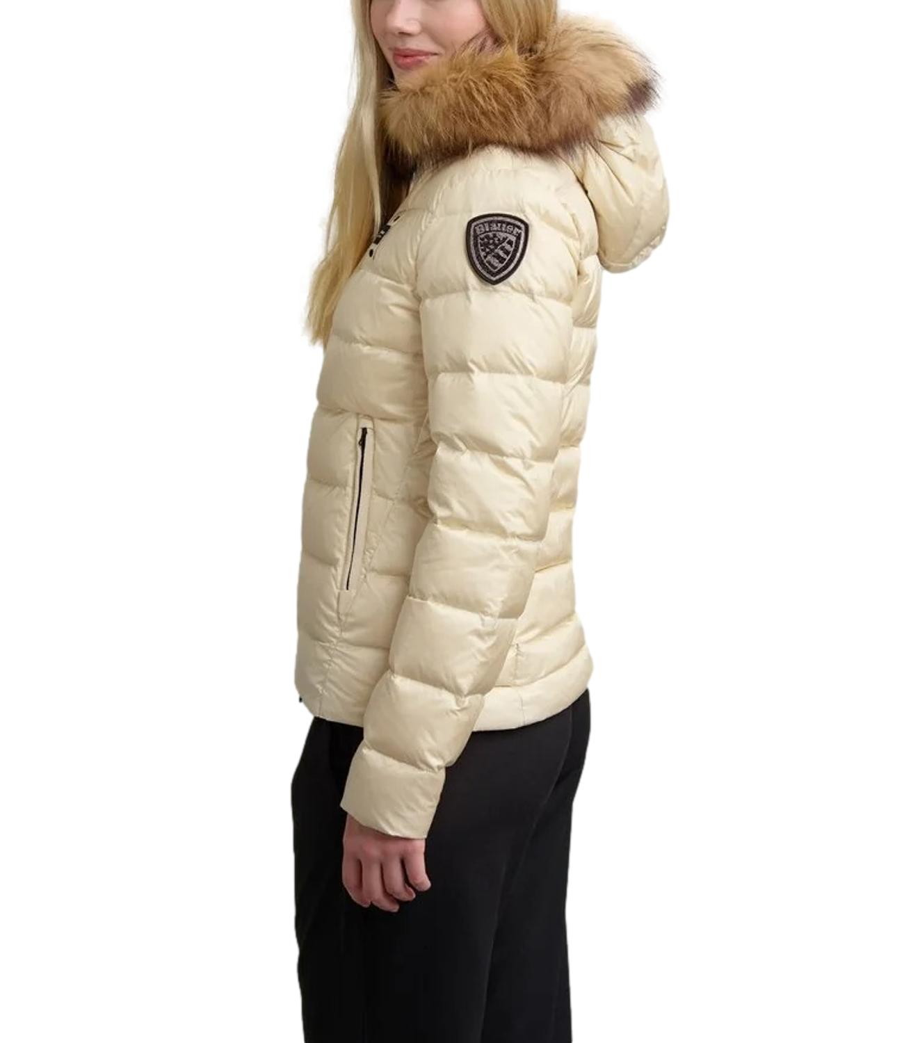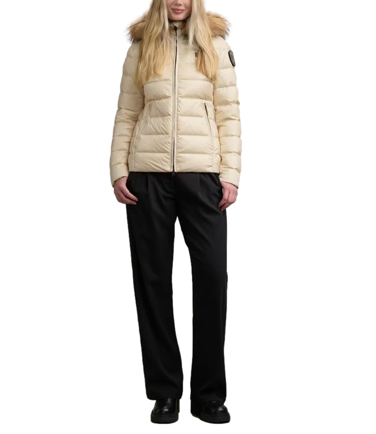 Piumino idrorepellente a righe orizzontali, leggero ma caldo, dal taglio che valorizza il punto vita e dai colori fashion. Dotato di cappuccio fisso con bordo in vera pelliccia removibile, chiusura con zip nascosta e tasche esterne e interne. Imbottitura in piuma 90/10 (165 g), foderato in nylon a contrasto, con coulisse sul fondo e dettagli logo.