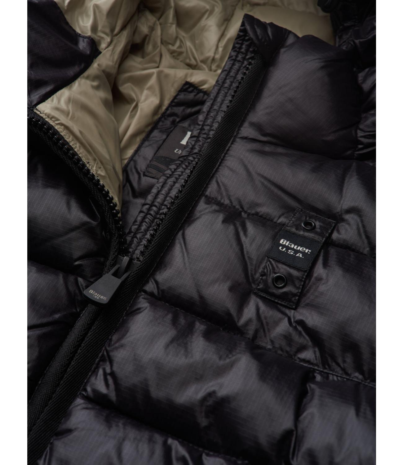 Giubbetto invernale lungo in nylon micro rip con cappuccio impunturato a linee orizzontali. Caratterizzano questo capo l'imbottitura ecologica, i colori alla moda e la vestibilità dall'effetto sfiancato.