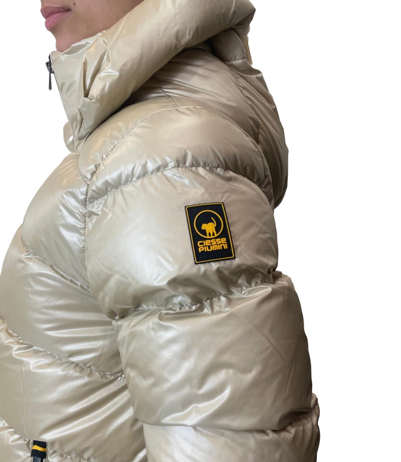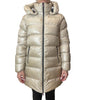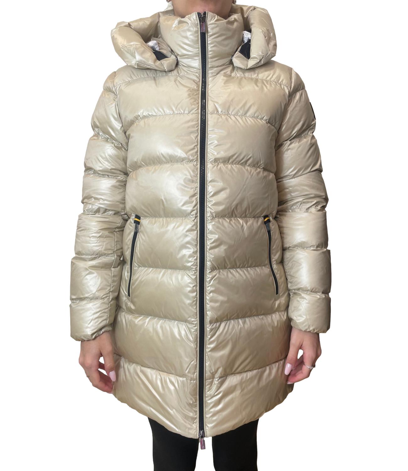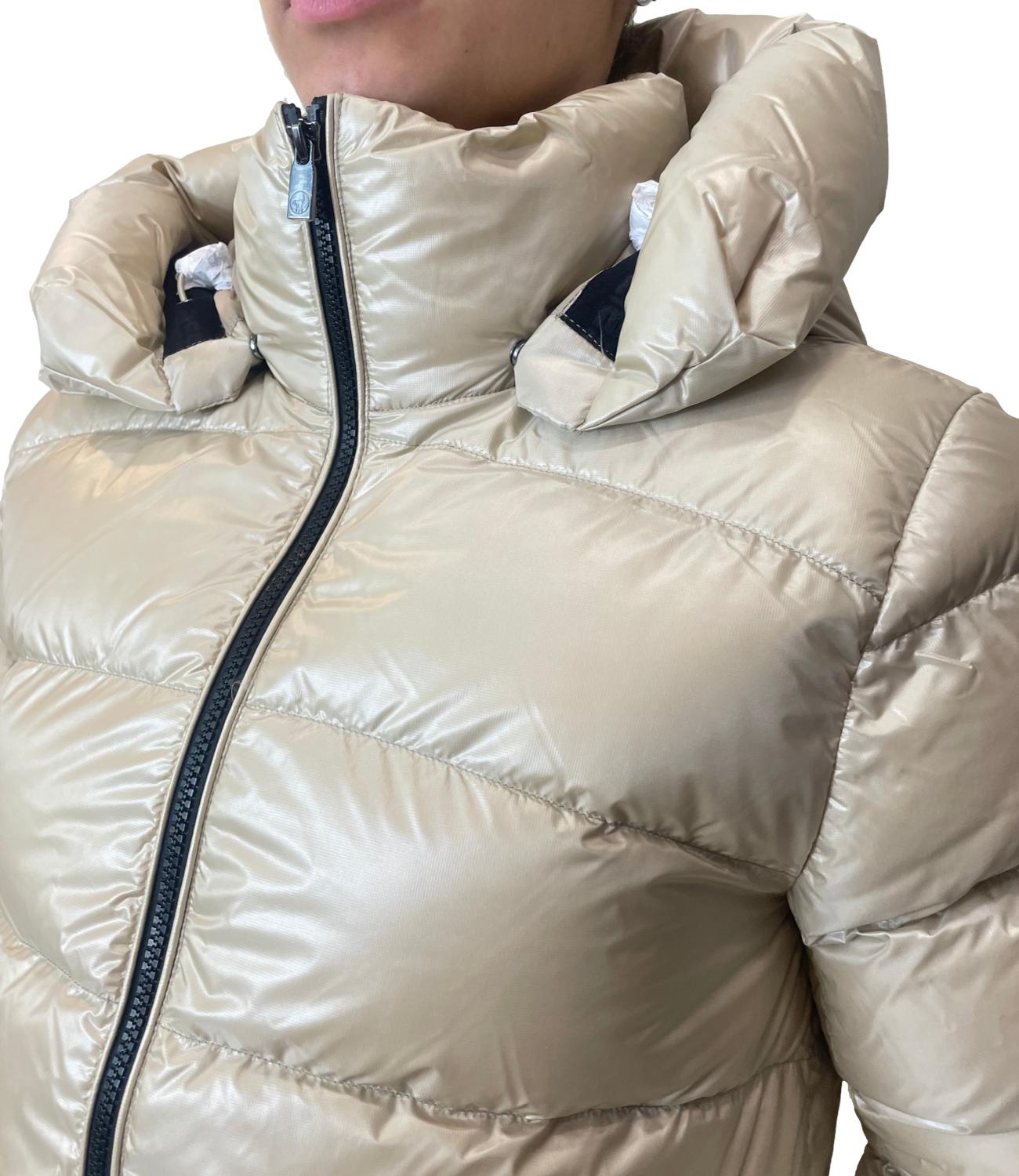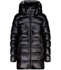 Piumino medio-lungo 200 grammi con cappuccio staccabile, realizzato in tessuto microripstop lucido a trama nera e imbottito con vera piuma certificata 800 fill power, che assicura elevate performance termiche e leggerezza assoluta.