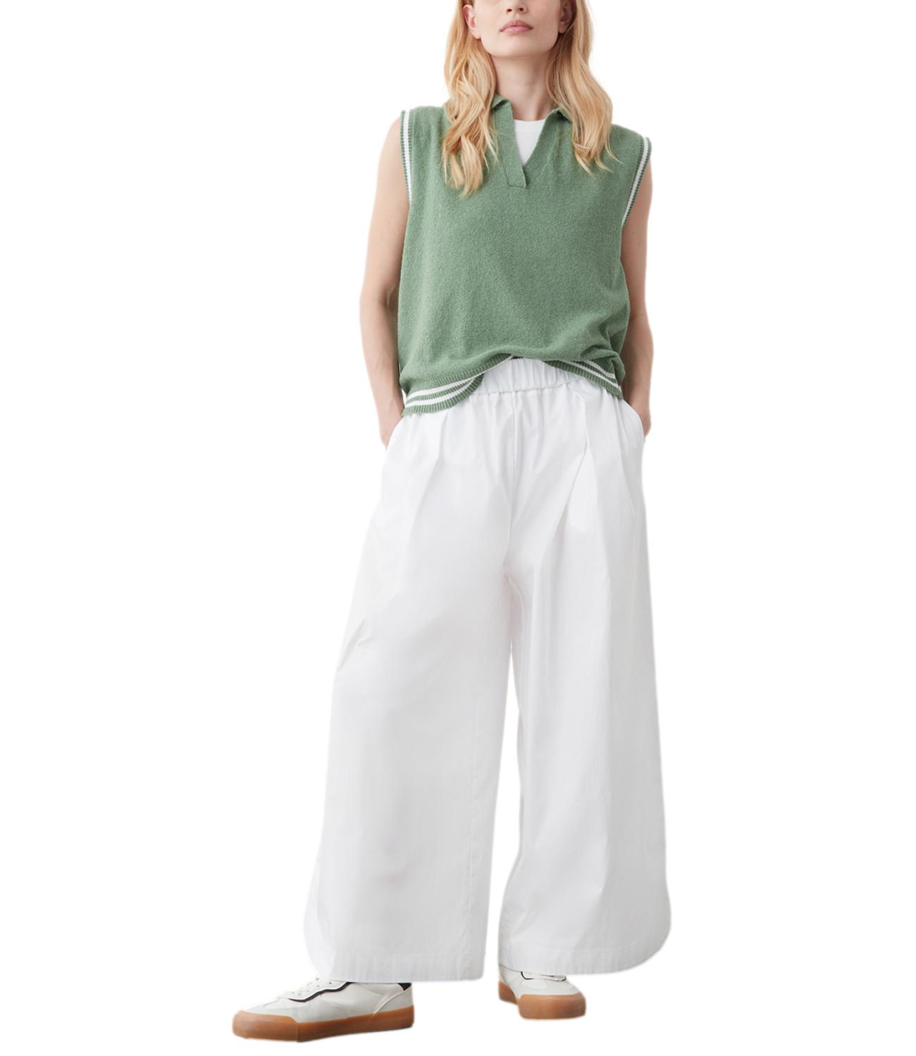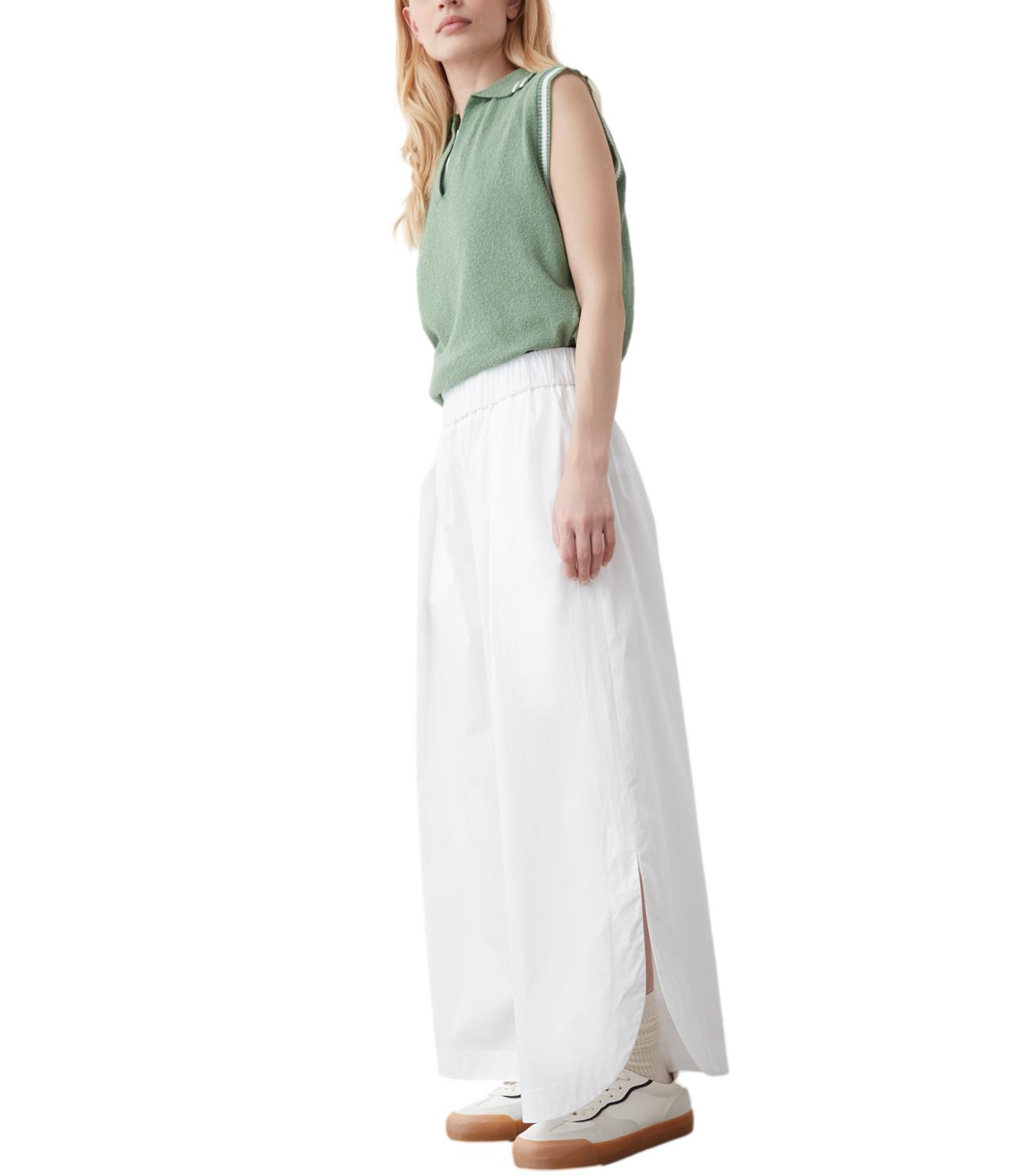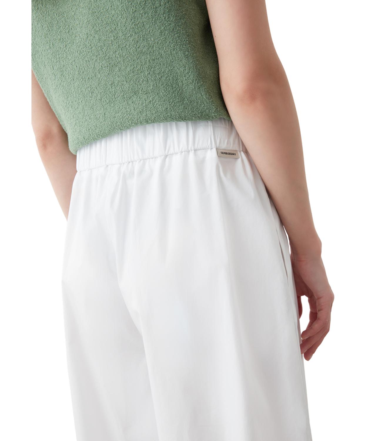 Pantaloni da donna con elastico in vita e gamba larga, realizzati in popeline di cotone per garantire leggerezza e traspirabilità. Il fondo è arricchito da eleganti spacchi laterali, che aggiungono un tocco di stile e originalità. Perfetti per le giornate più calde.