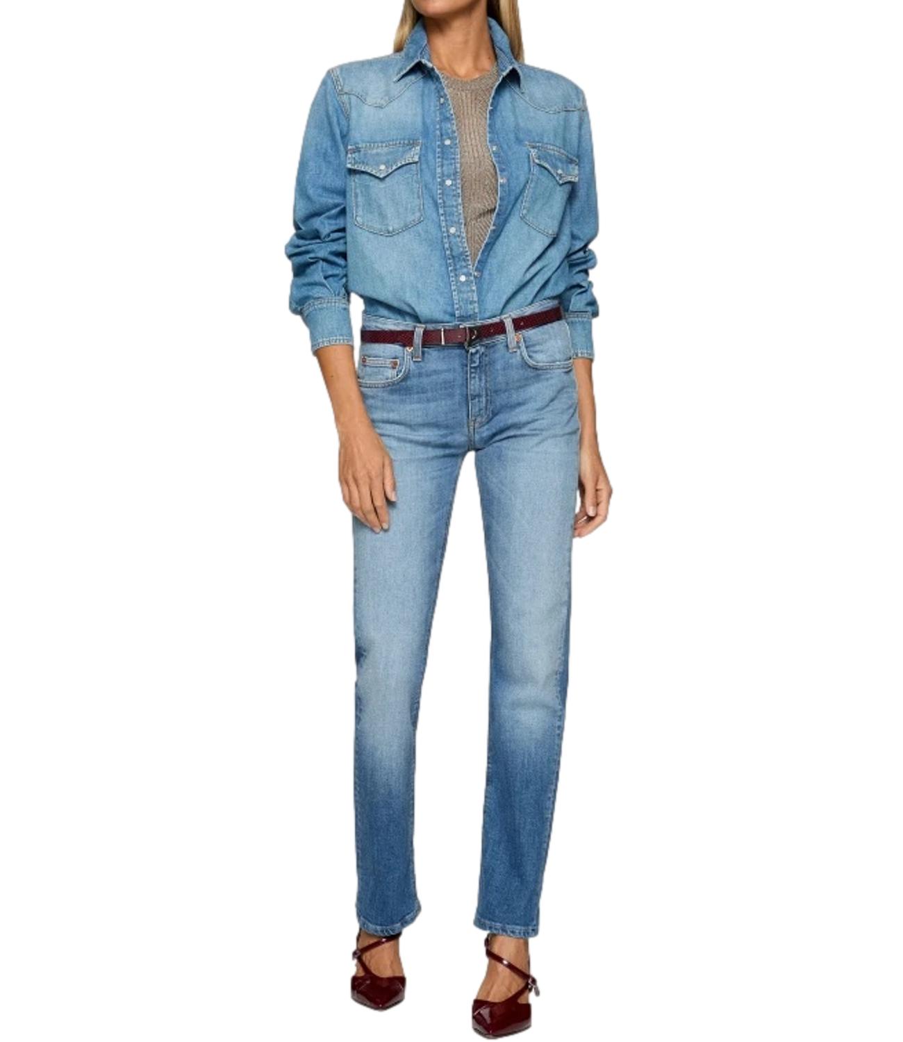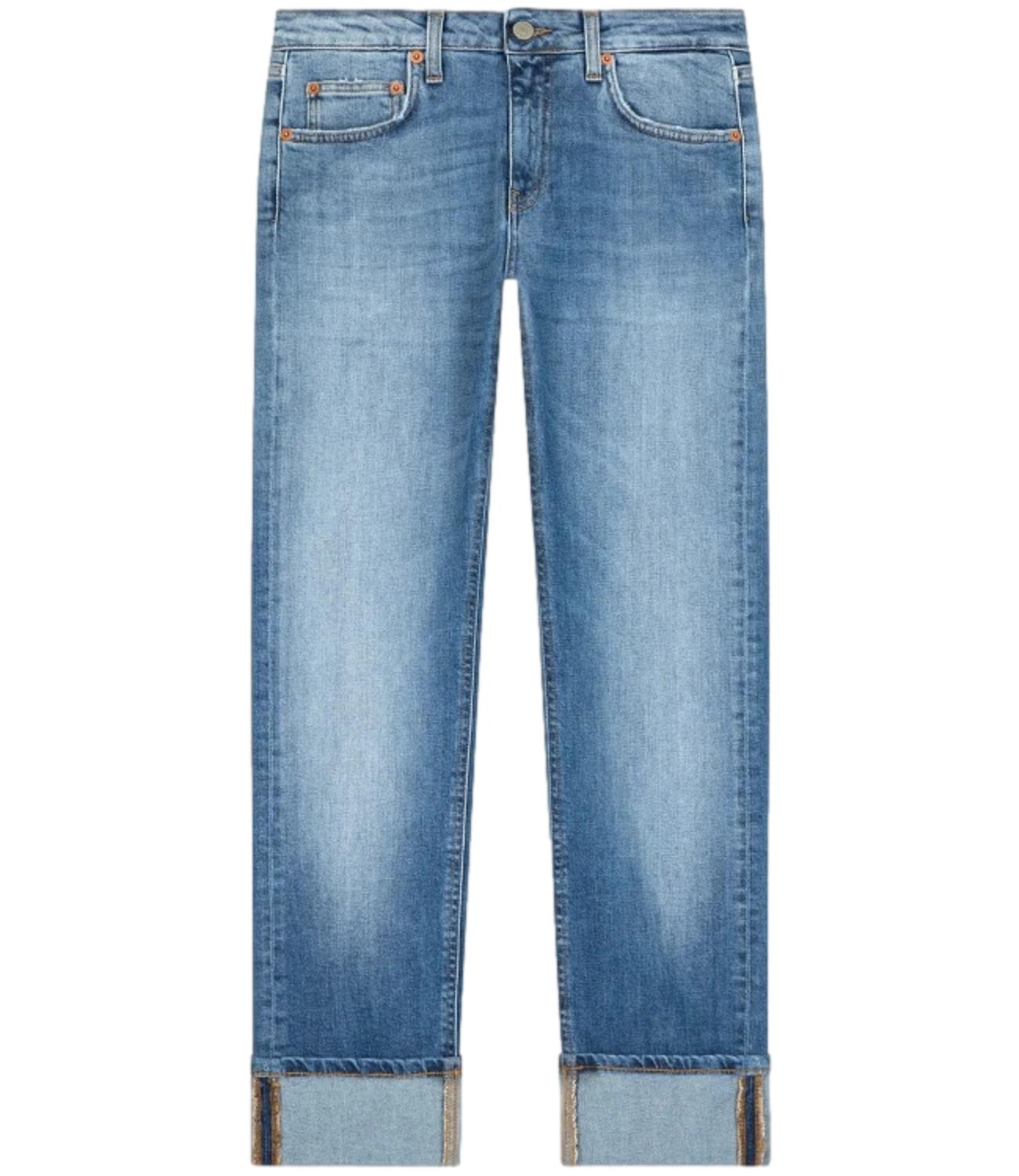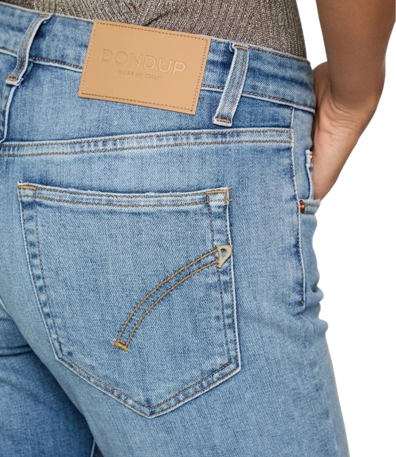 Jeans Coco cinque tasche slim fit, vita regolare, alto risvolto non fisso sul fondo. Denim stretch organico blu 11 1/2 Oz. Lavaggio medio pulito gots. Logo Dondup. Made in Italy.