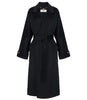 Cappotto a vestaglia in panno di misto lana double, sfoderato e dalla vestibilità over. Dotato di rever classici, maniche con risvolto e tasche applicate, si chiude con cintura che definisce il punto vita con naturale morbidezza. I bottoni in metallo dorato con logo, applicati ai polsi, insieme all'etichetta logata, aggiungono preziosi dettagli di luce.