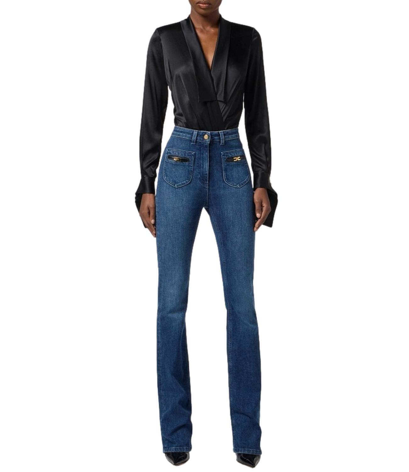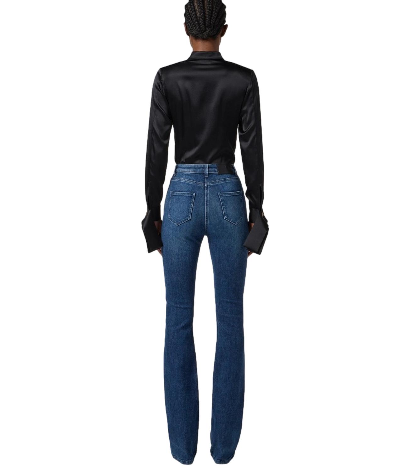 Body in raso dalla linea slim, con spalle strutturate e collo a rever sciallato. Il design è definito da volumi incrociati sul davanti, mentre i polsi con taglio foulard donano leggerezza e movimento. I bottoni smaltati con pattern snake, impreziositi dal logo, completano il capo con un tocco sofisticato.