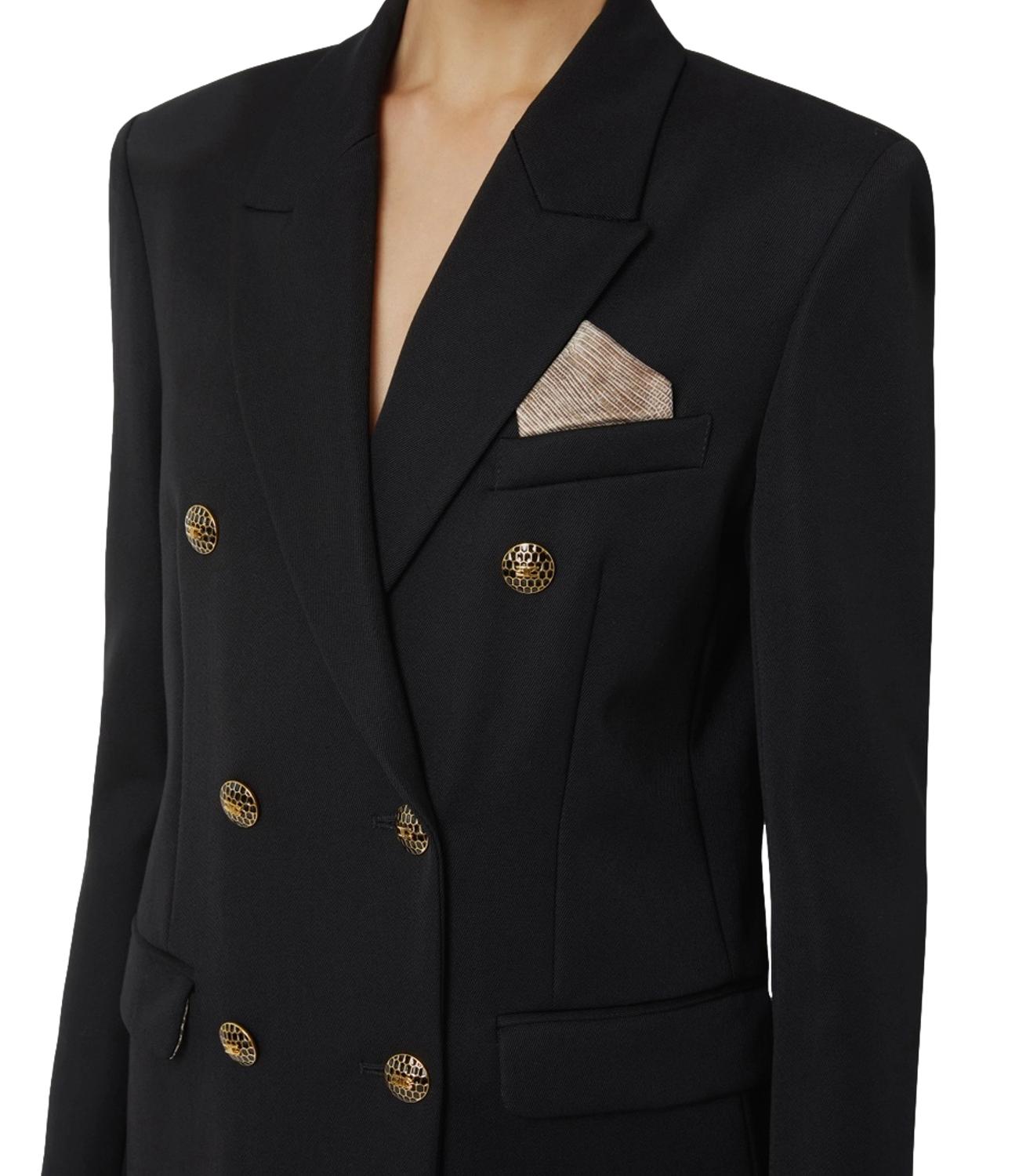 Giacca doppiopetto in gabardina di cotone dalla linea over, con spalle strutturate e rever a lancia. Le patte applicate definiscono il design, mentre i dettagli distintivi richiamano un raffinato pattern snake: dalla fodera interna ai bottoni smaltati con logo, fino alla pochette coordinata inserita nel taschino.