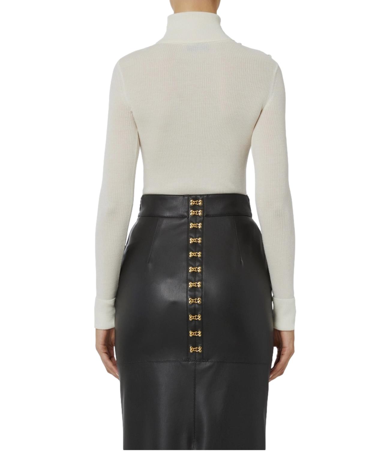 Dolcevita in maglia dalla vestibilità slim, ideale da indossare come sottogiacca. Presenta collo alto con apertura laterale e bottoni in metallo dorato con logo, maniche lunghe con risvolto al fondo e un dettaglio luminoso in catena applicato su una spalla. La stampa con lettering ispirazionale sul davanti arricchisce il design con un tocco distintivo.