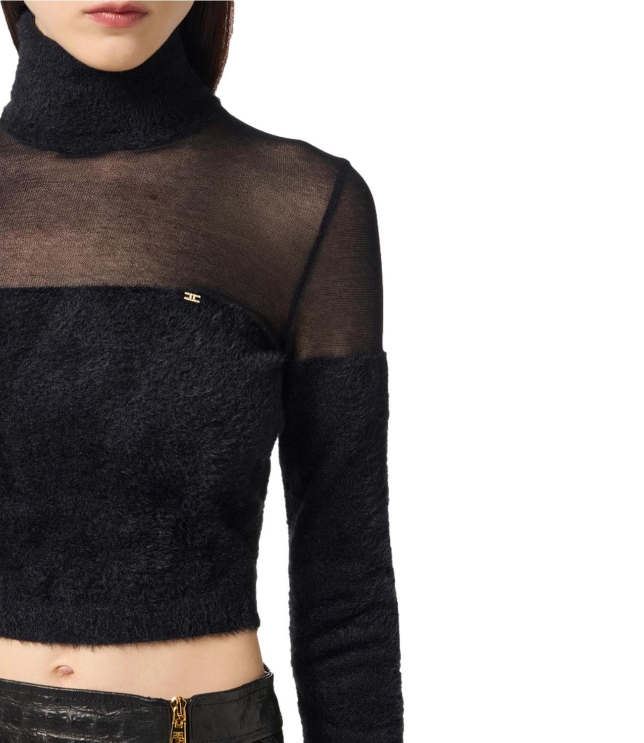 Dolcevita cropped in maglia dalla vestibilità slim, caratterizzato da una lavorazione con texture effetto pelo che lo rende morbido e ricercato. Le spalle presentano una trama garzata che crea delicati giochi di trasparenze, mentre il dettaglio logato con piccoli strass illumina il capo con una nota preziosa.