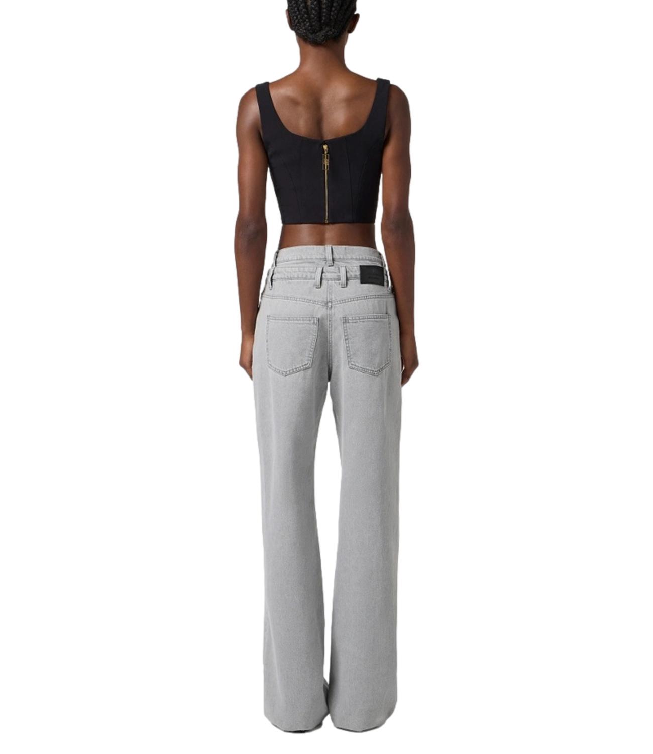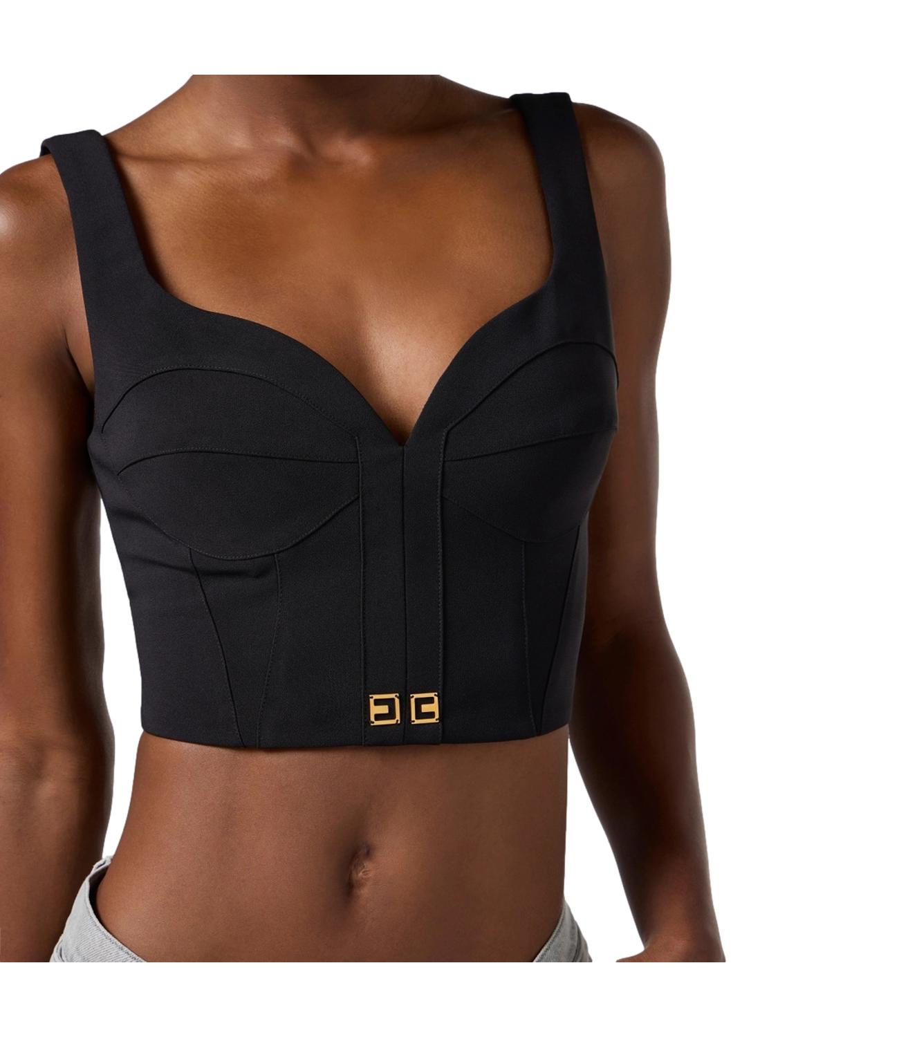 Top in crêpe leggero dalla vestibilità aderente. Con scollo a cuore, è definito dai tagli di ispirazione bustier che donano struttura a coppe e fianchi. Un doppio dettaglio con logo aggiunge una nota luminosa.
