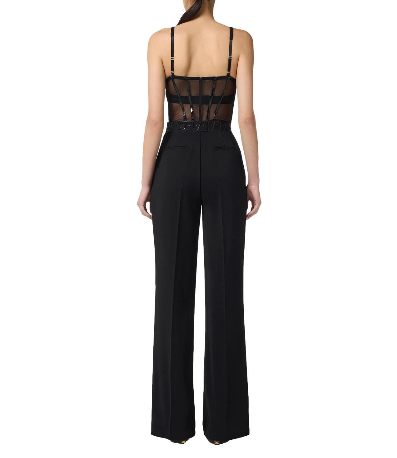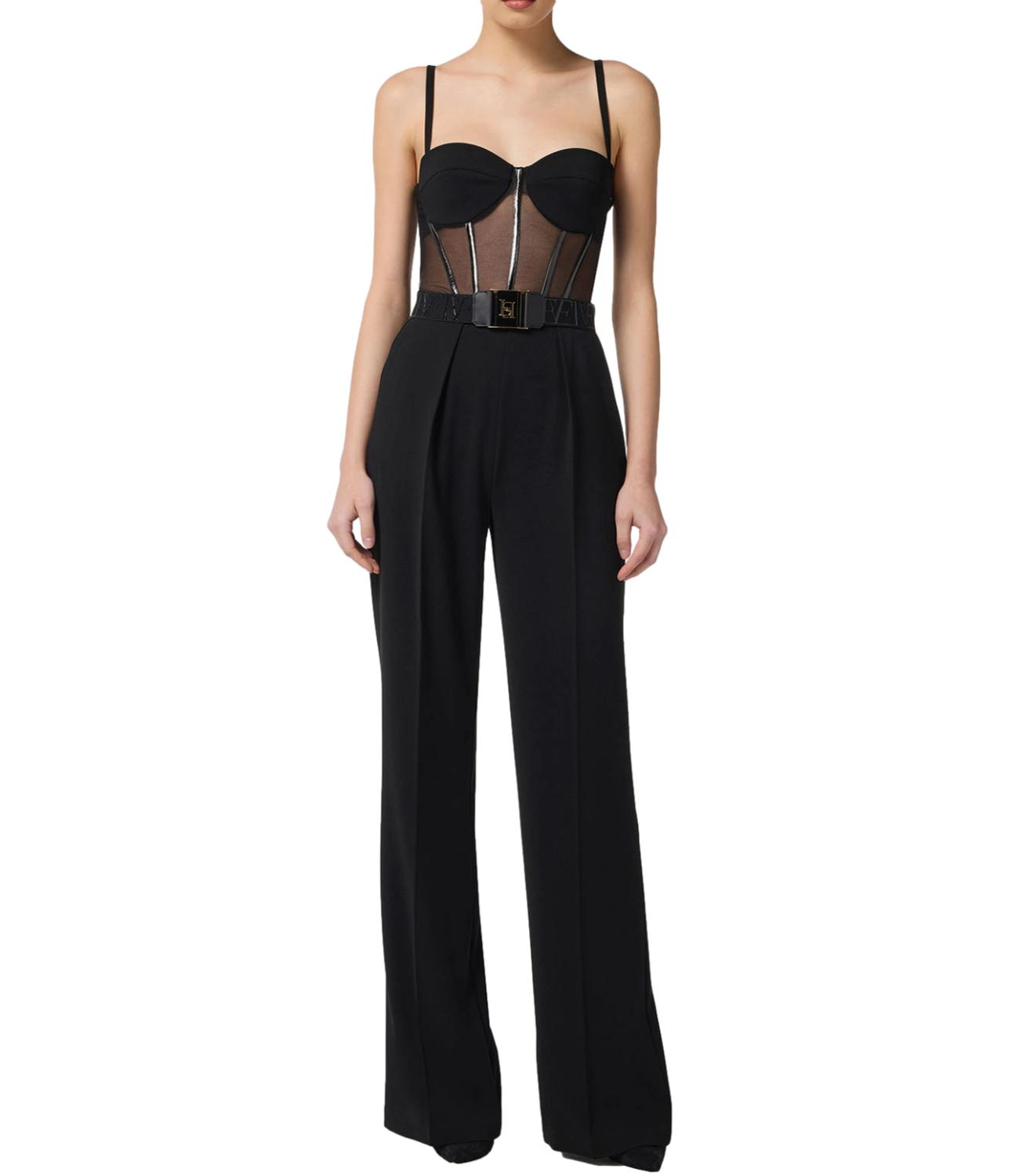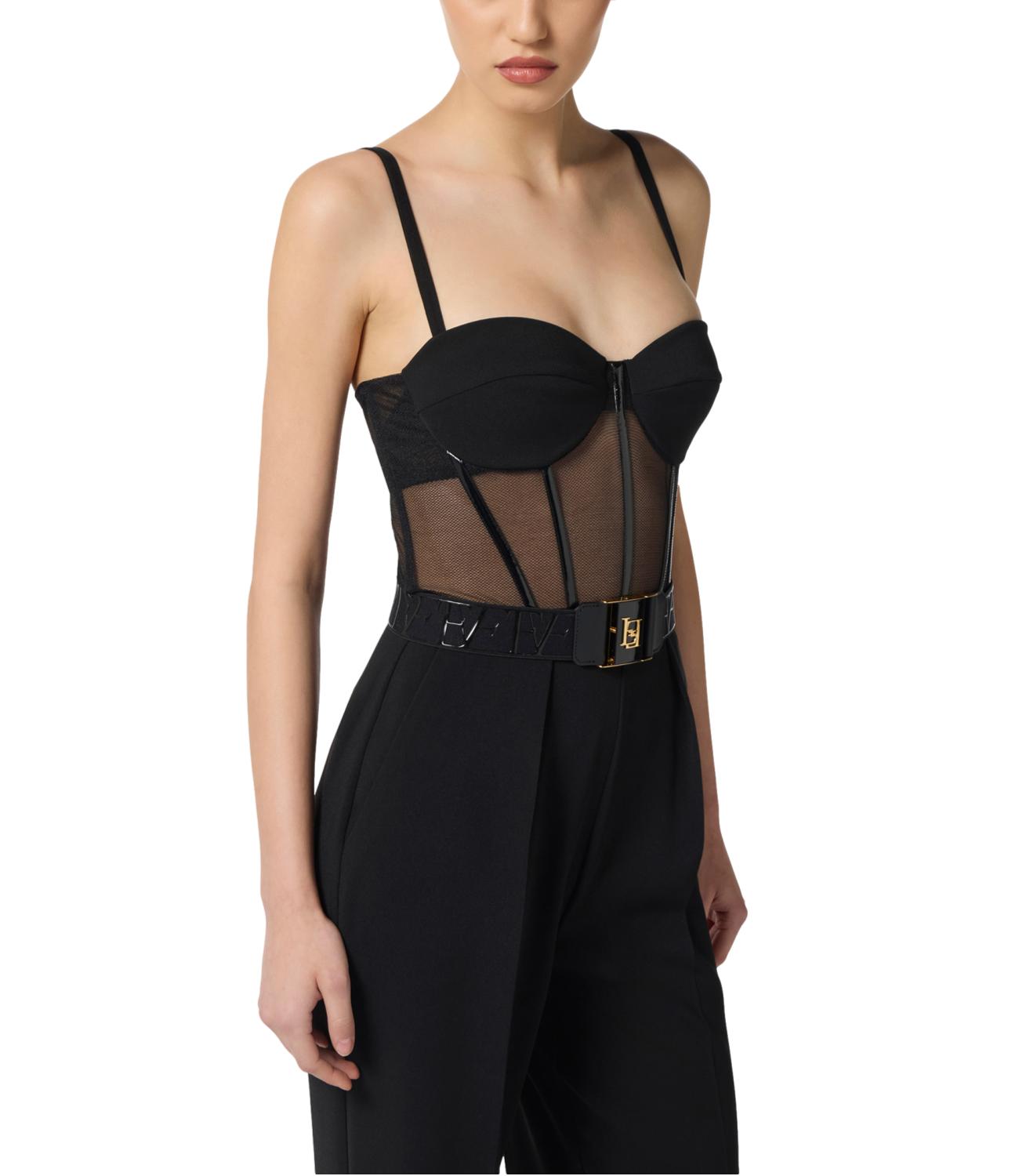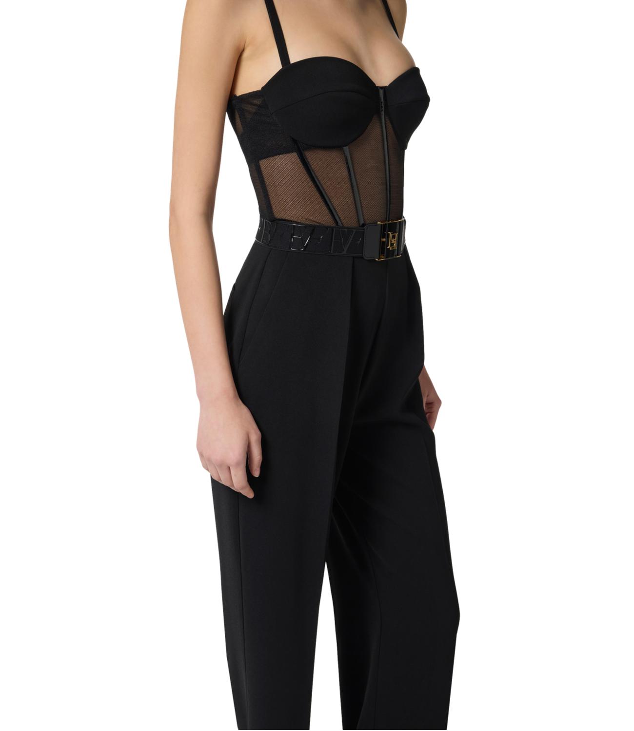 Tuta in crêpe leggero e tulle dalla vestibilità regular. Con spalline e coppe rigide dalla texture opaca, ha top con costruzione a bustier definita da luminosi dettagli in vinile. I pantaloni hanno pinces sul davanti per un contrasto definito di texture e volumi. Cintura con logo sul punto vita.