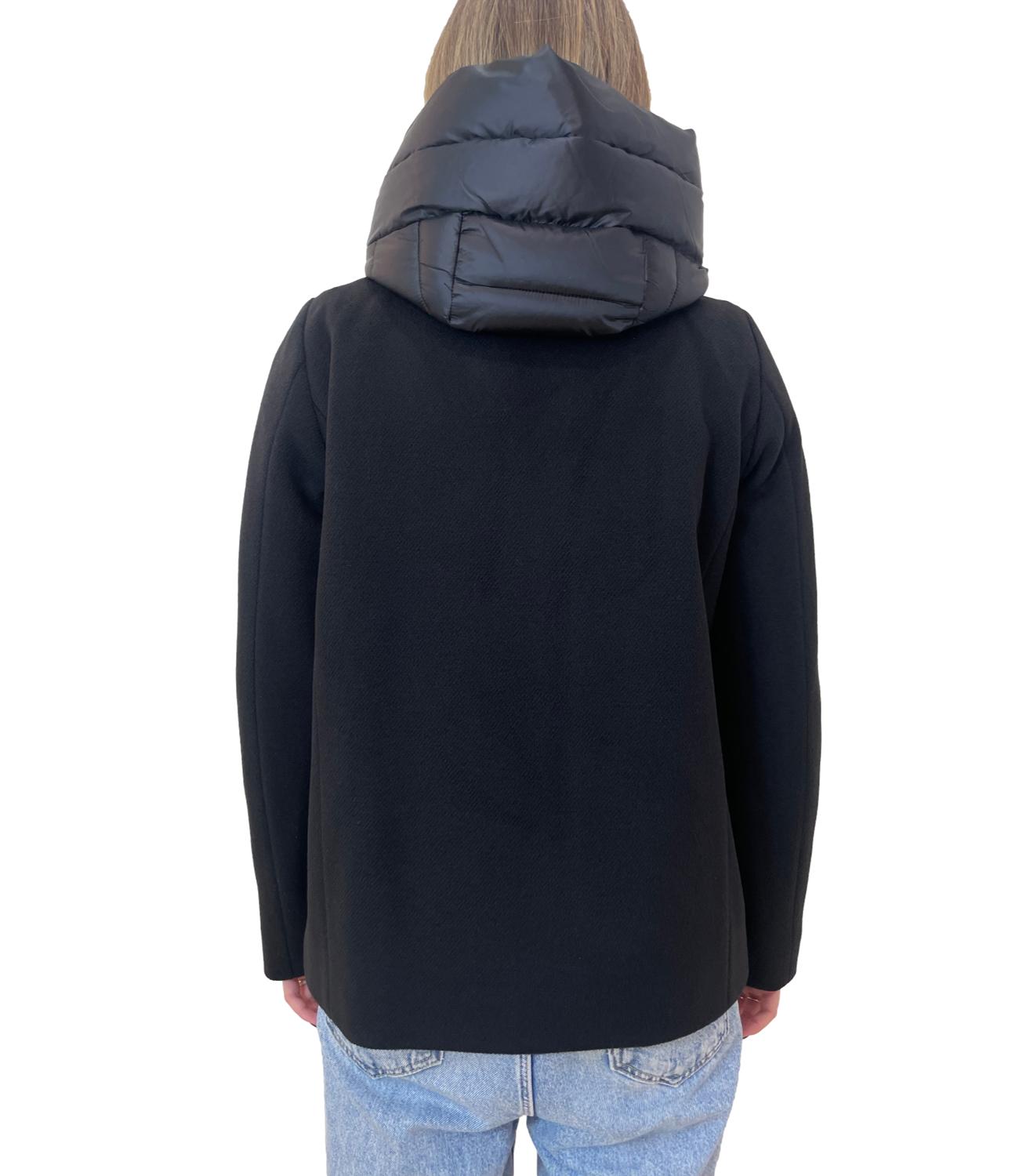 Compatto e trasformabile, questo giaccone in panno soft coniuga funzionalità e stile urbano. La pettorina e il cappuccio in tessuto antigoccia si possono rimuovere, svelando un design più essenziale.