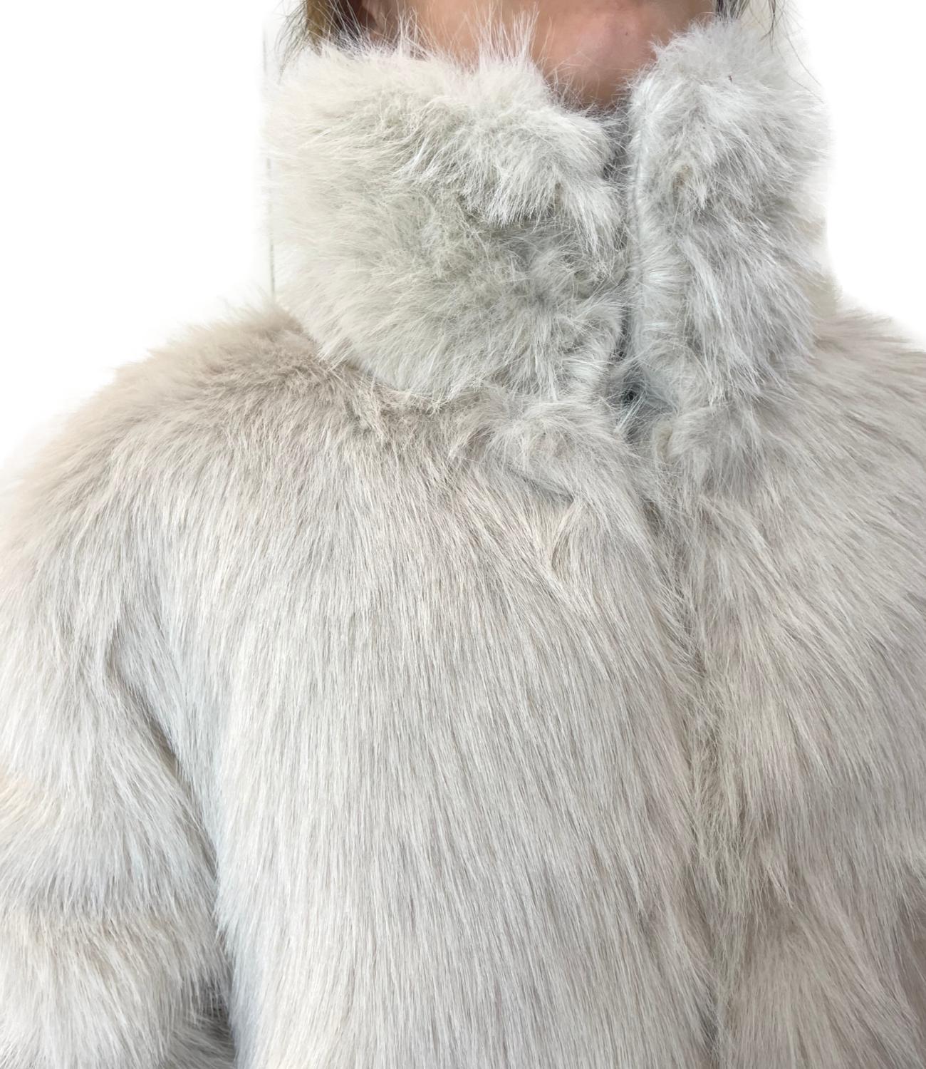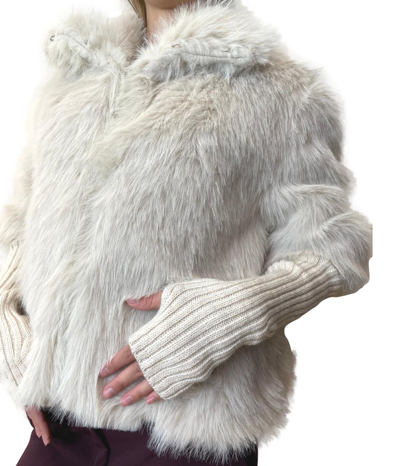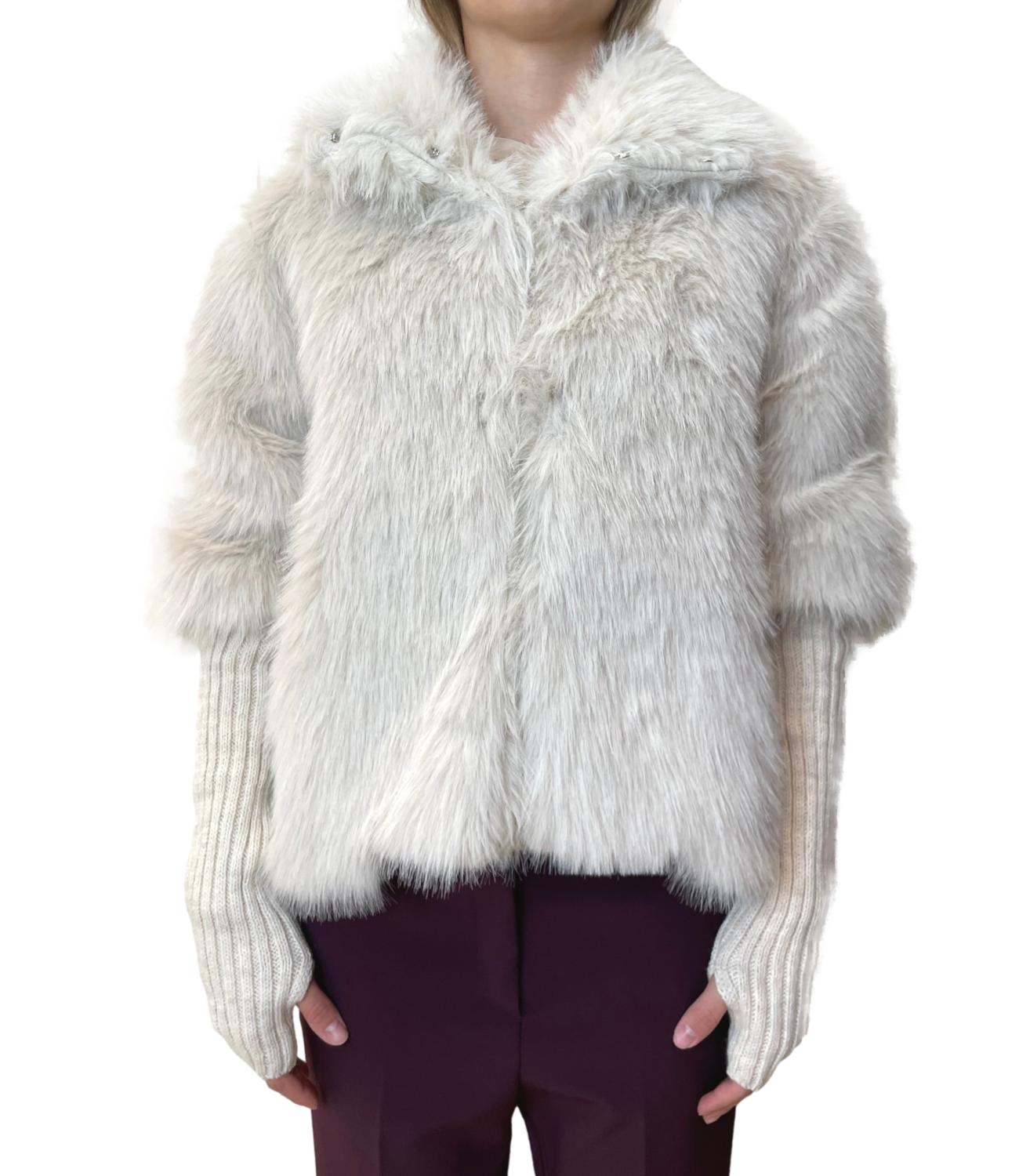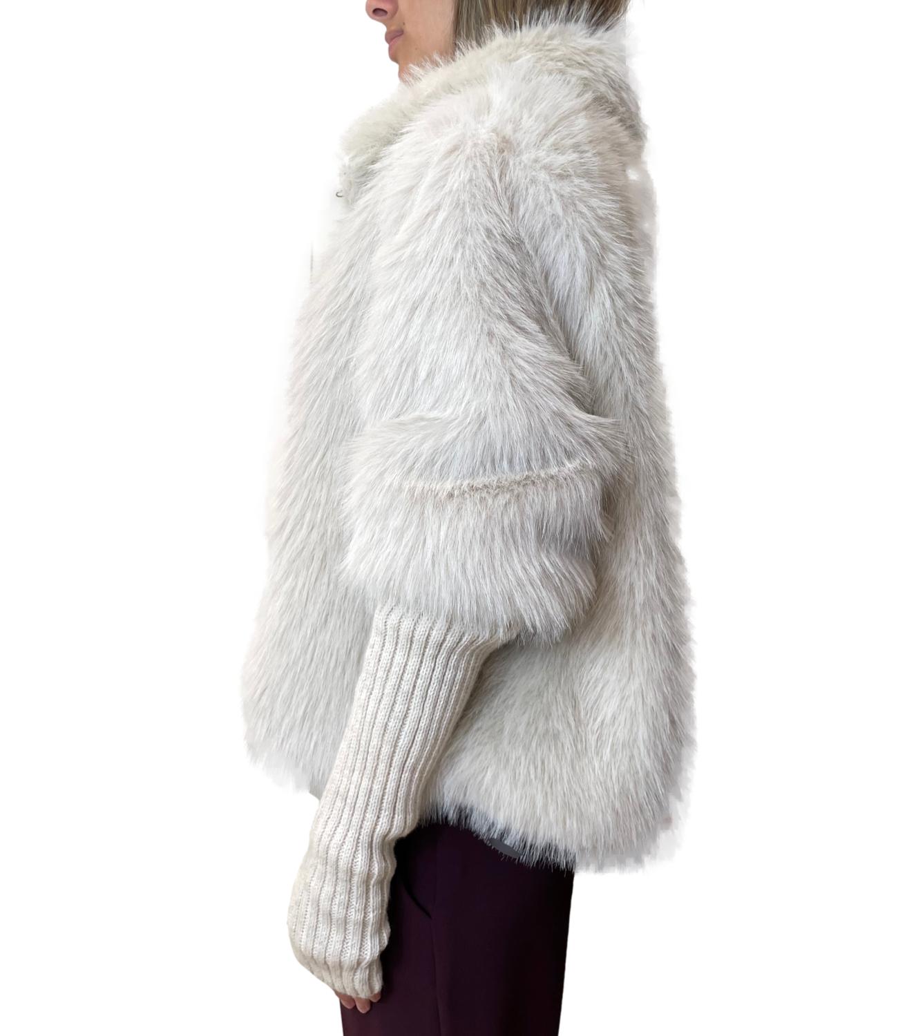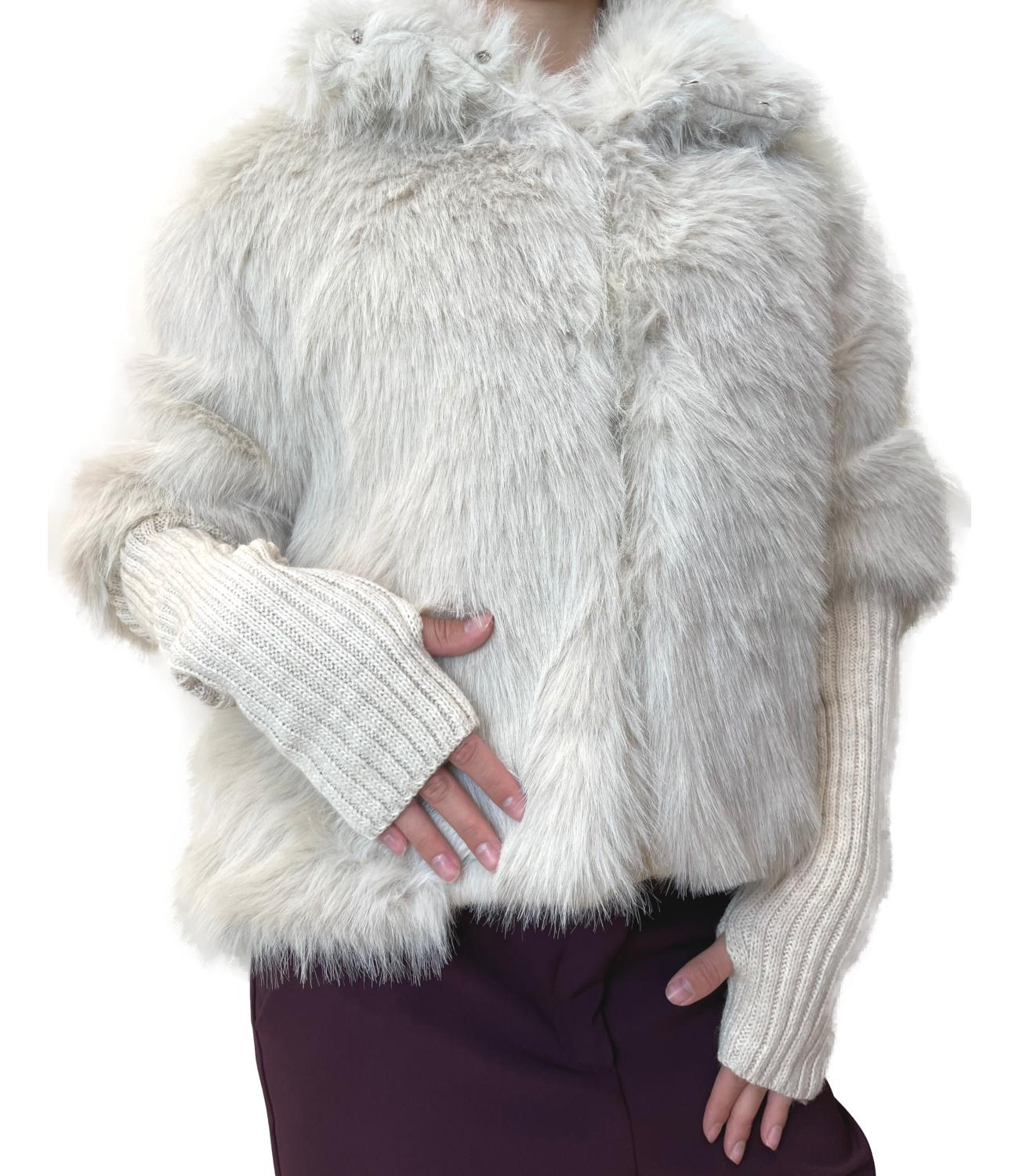 Pellicciotto con collo in ecofur, fodera in raso, maniche a tre quarti con manicotto in lana incorporato.