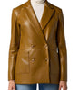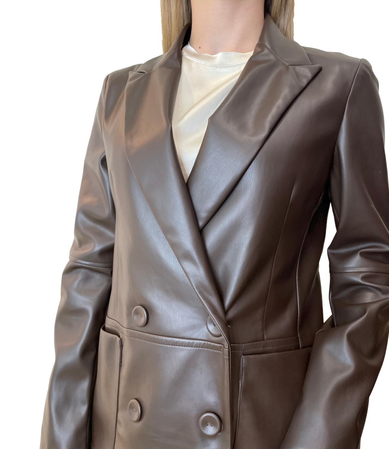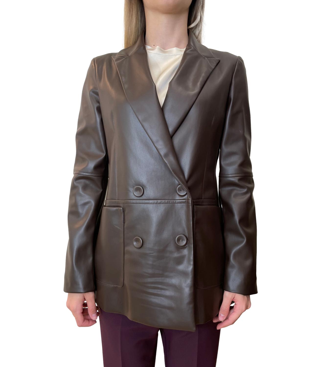 Giacca doppiopetto in ecopelle dal taglio sartoriale con rever classico e bottoni frontali. Versatile e sofisticata, è perfetta sia per look casual-chic con jeans e sneakers, sia per outfit più eleganti abbinata ad abiti o gonne.