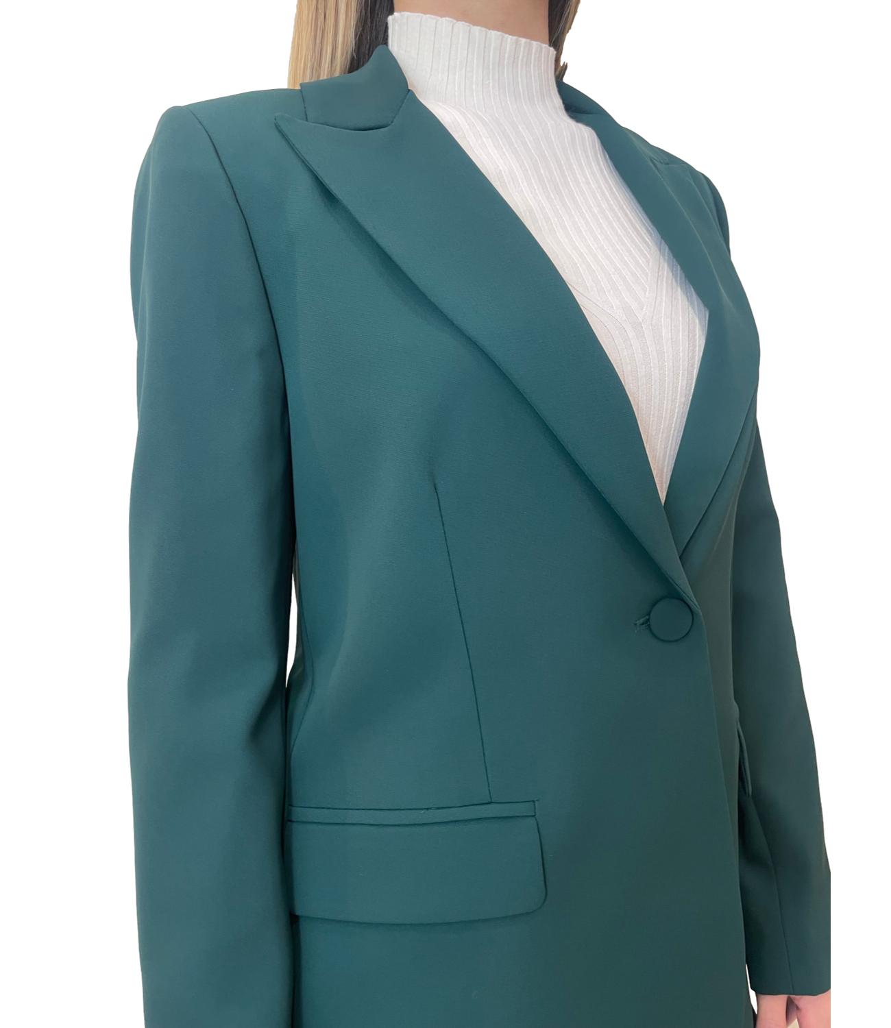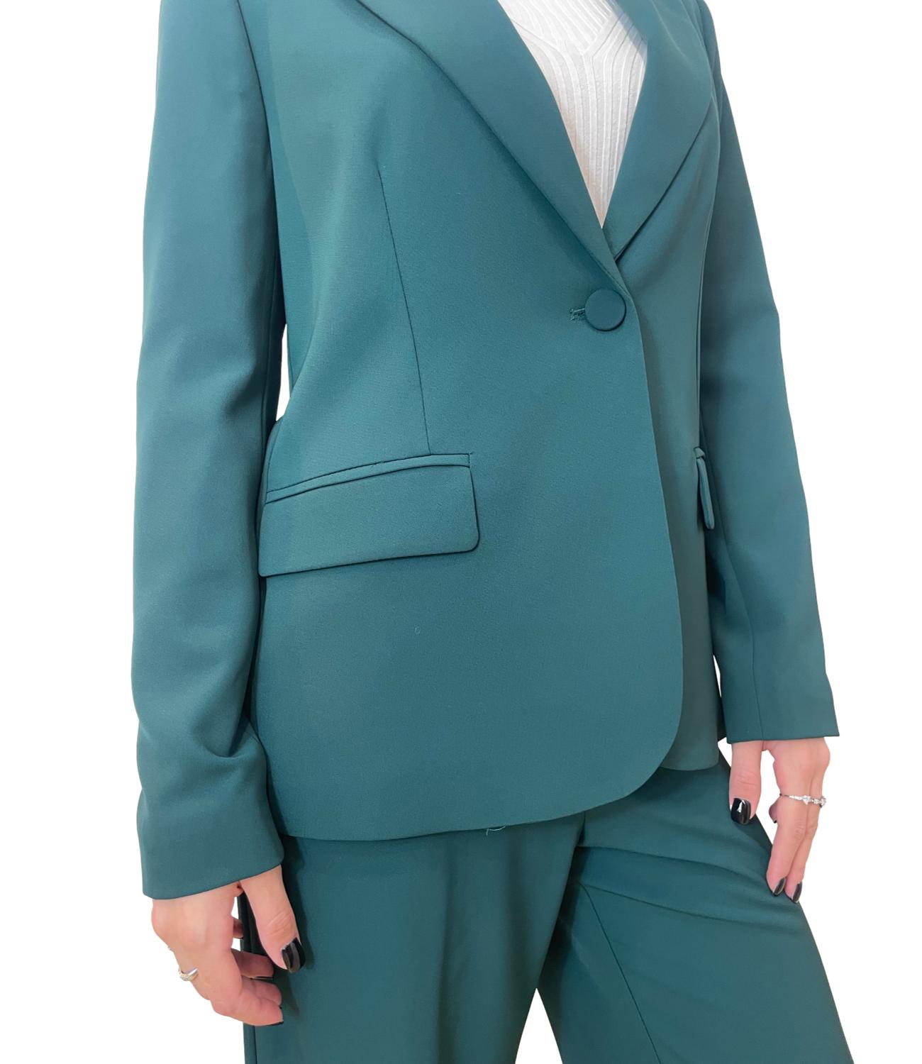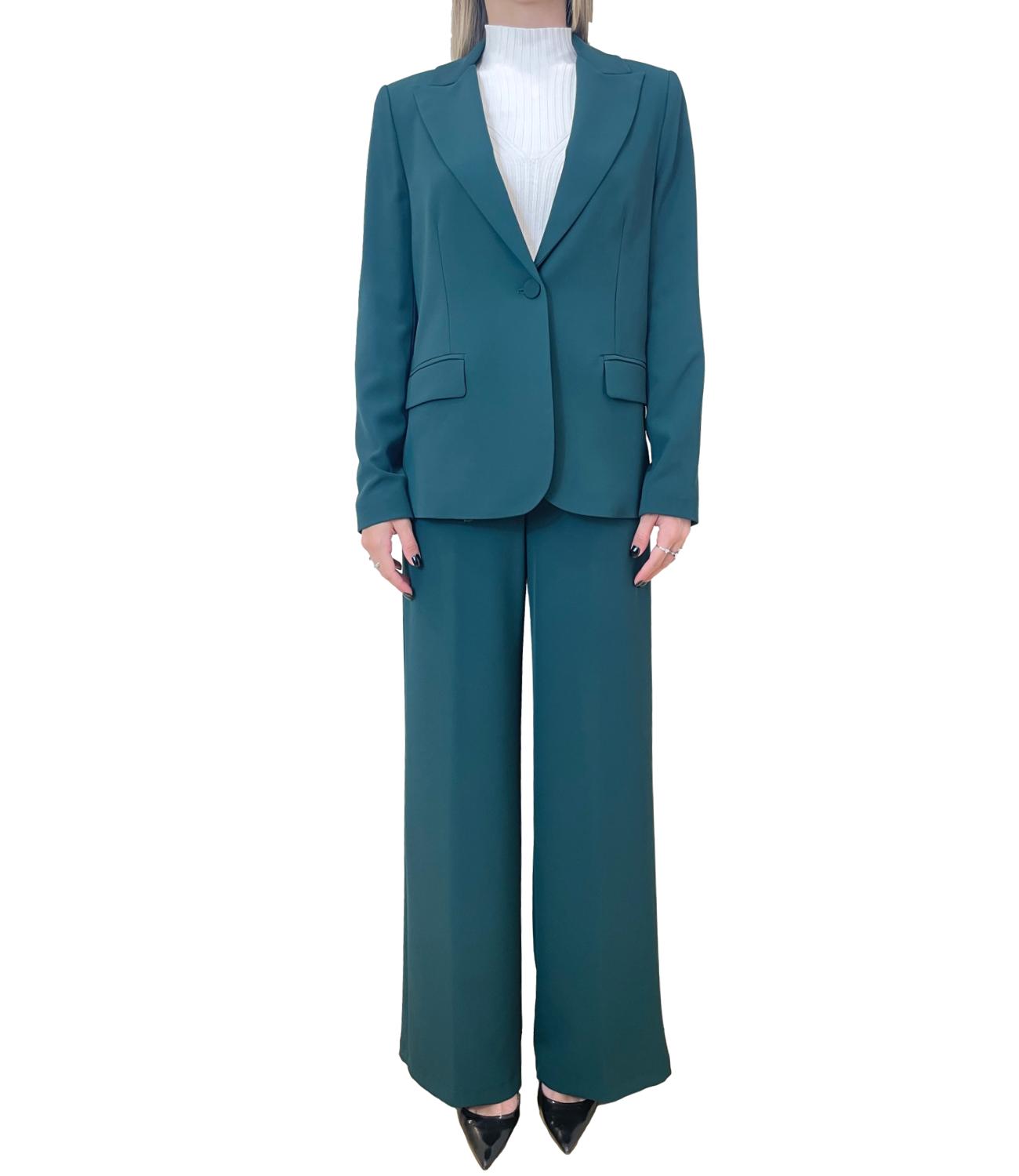 Questo tailleur è composto da una giacca monopetto con collo a rever classico, chiusura a un bottone tono su tono e tasche con patta che ne esaltano la linea strutturata e femminile.
