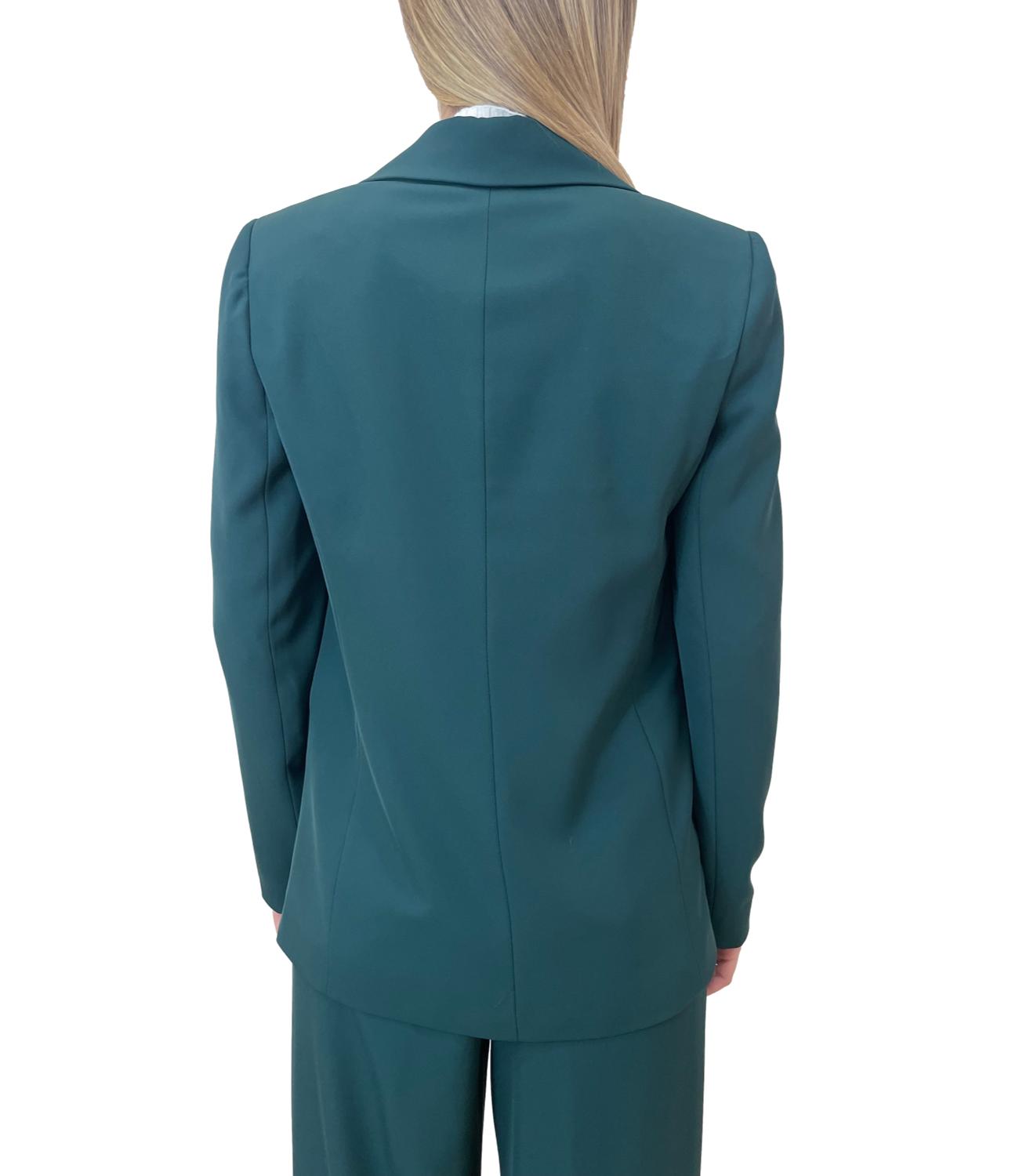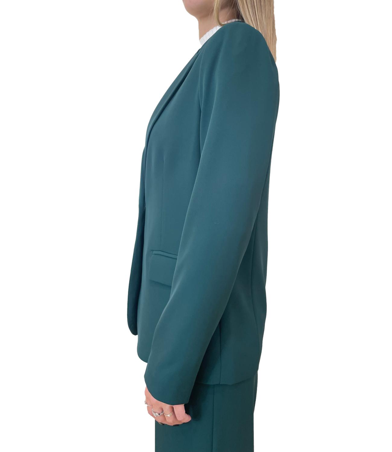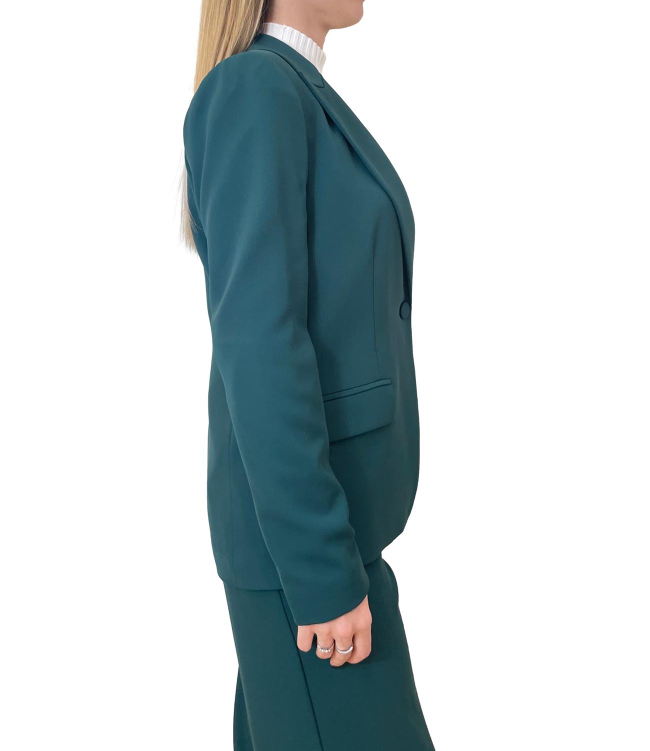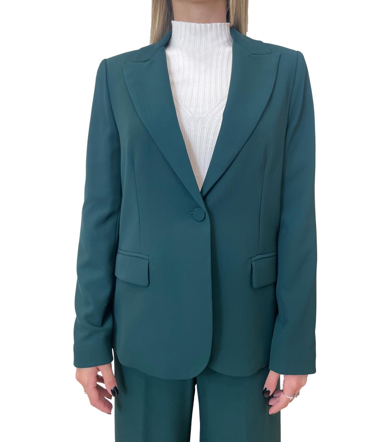 Questo tailleur è composto da una giacca monopetto con collo a rever classico, chiusura a un bottone tono su tono e tasche con patta che ne esaltano la linea strutturata e femminile.