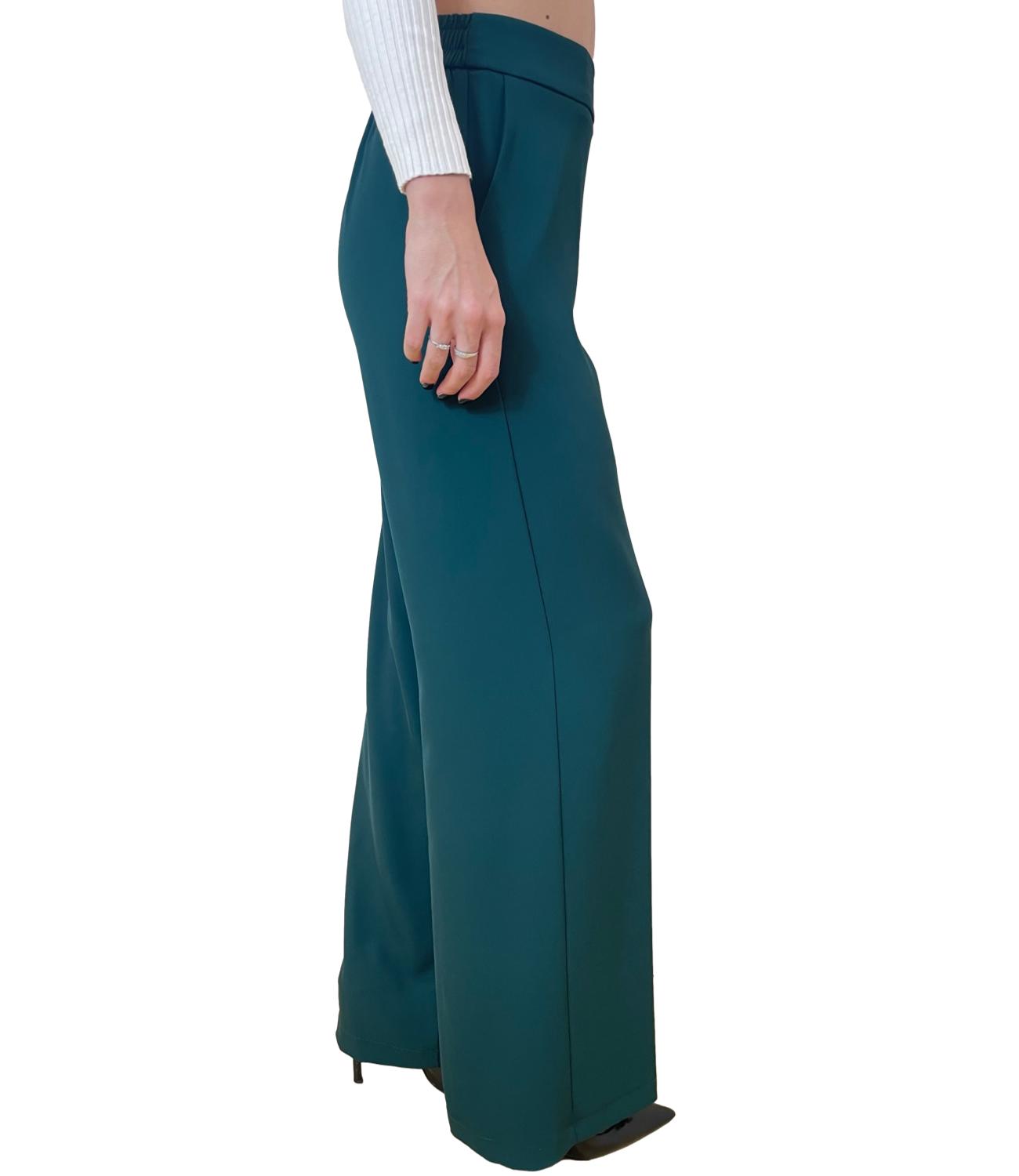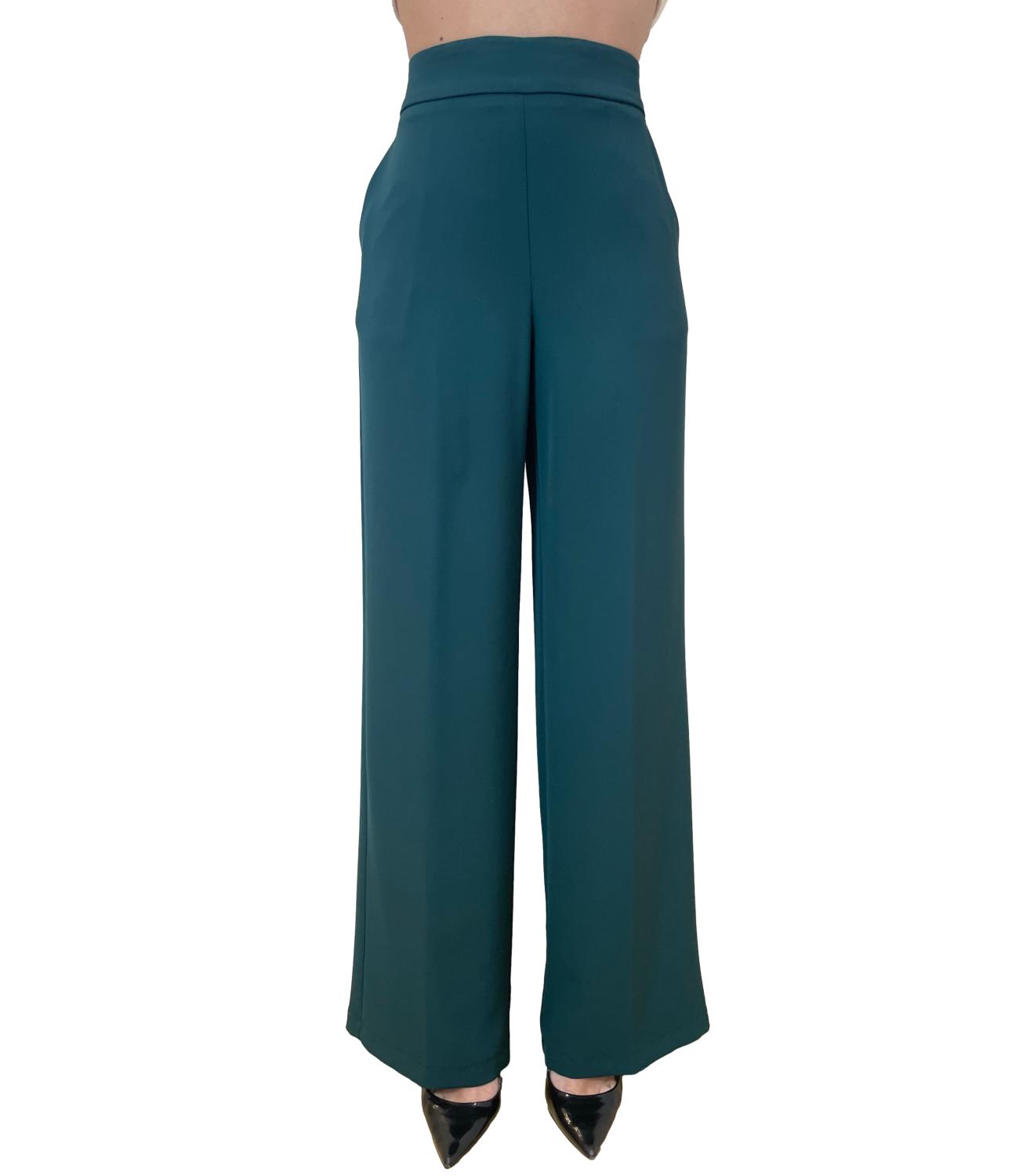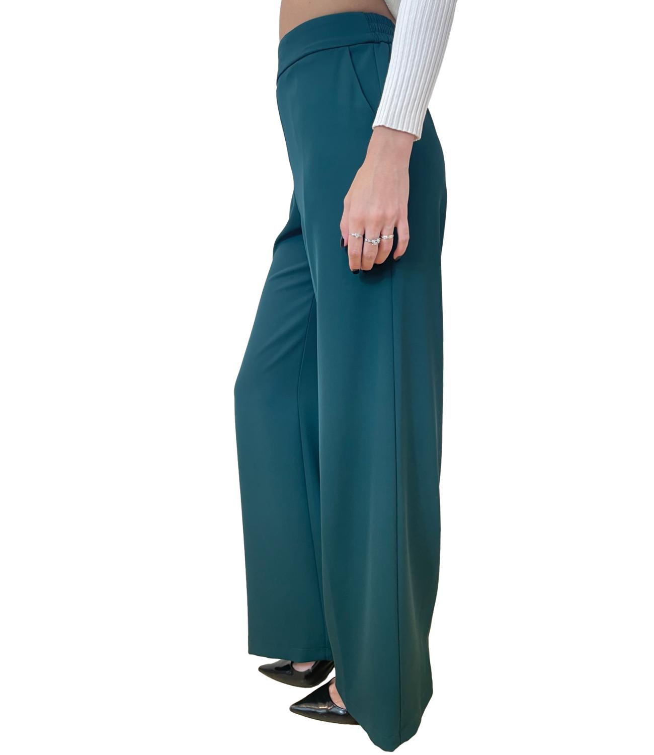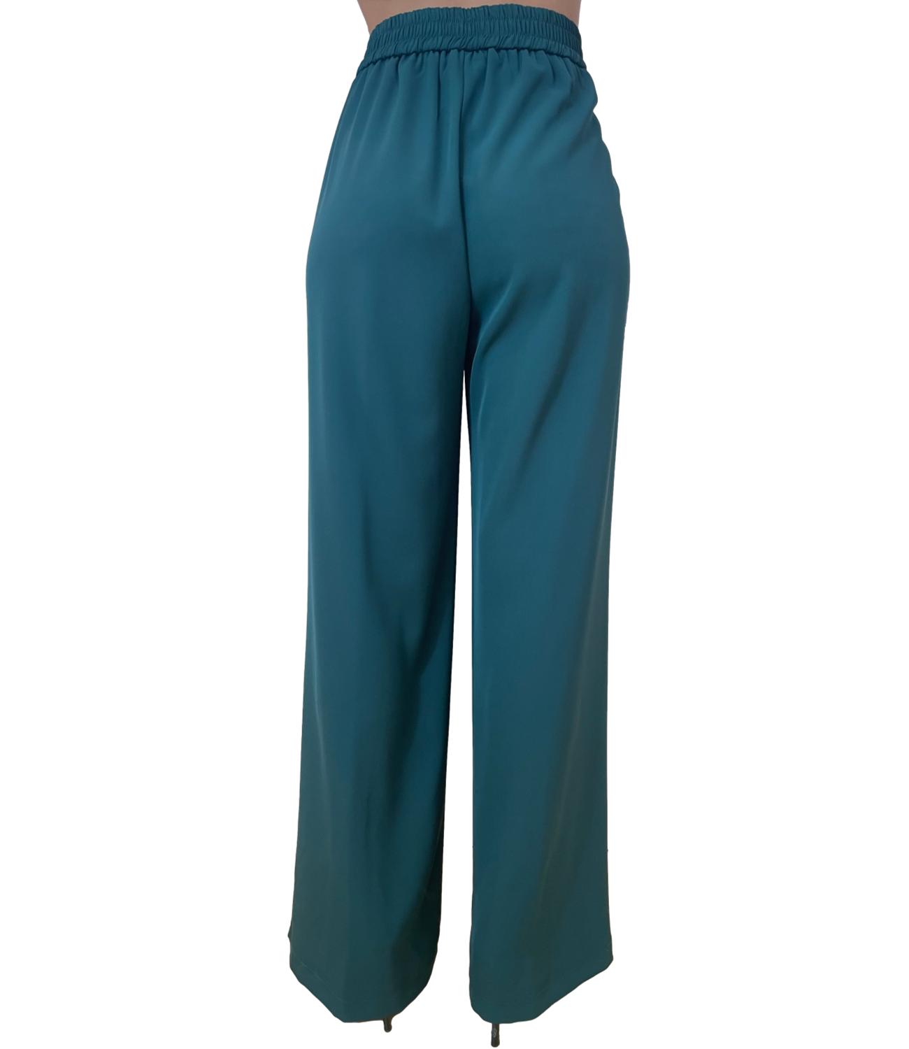 I pantaloni palazzo a vita alta completano l'insieme con una linea ampia e fluida, impreziosita da finta patta anteriore e comodo elastico sul retro, per una vestibilità perfetta. Il taglio pulito e il tessuto fluido donano comfort ed eleganza, ideale sia per l'ufficio che per un'occasione speciale.