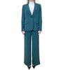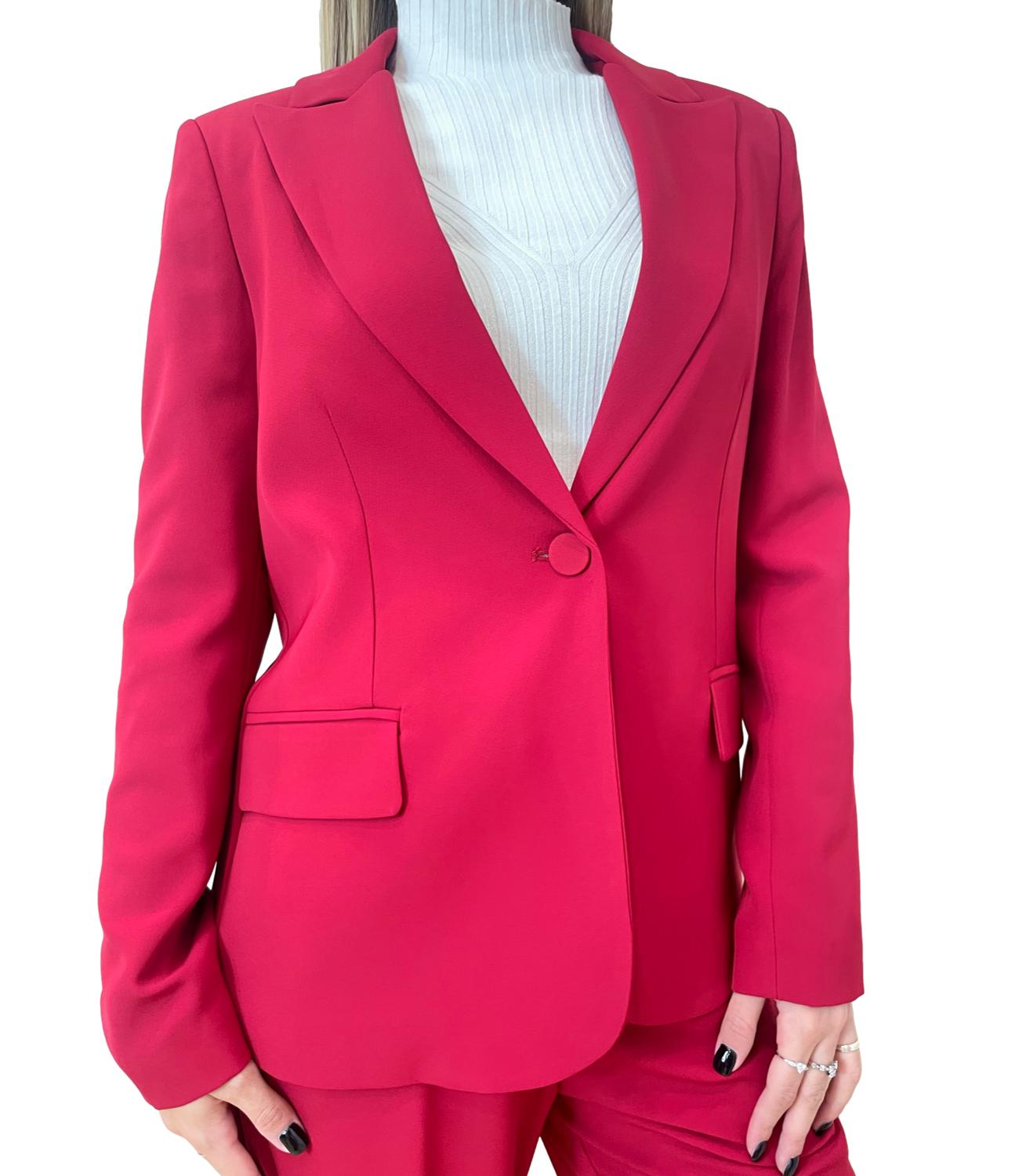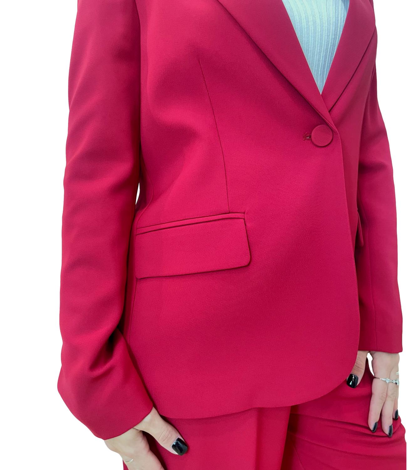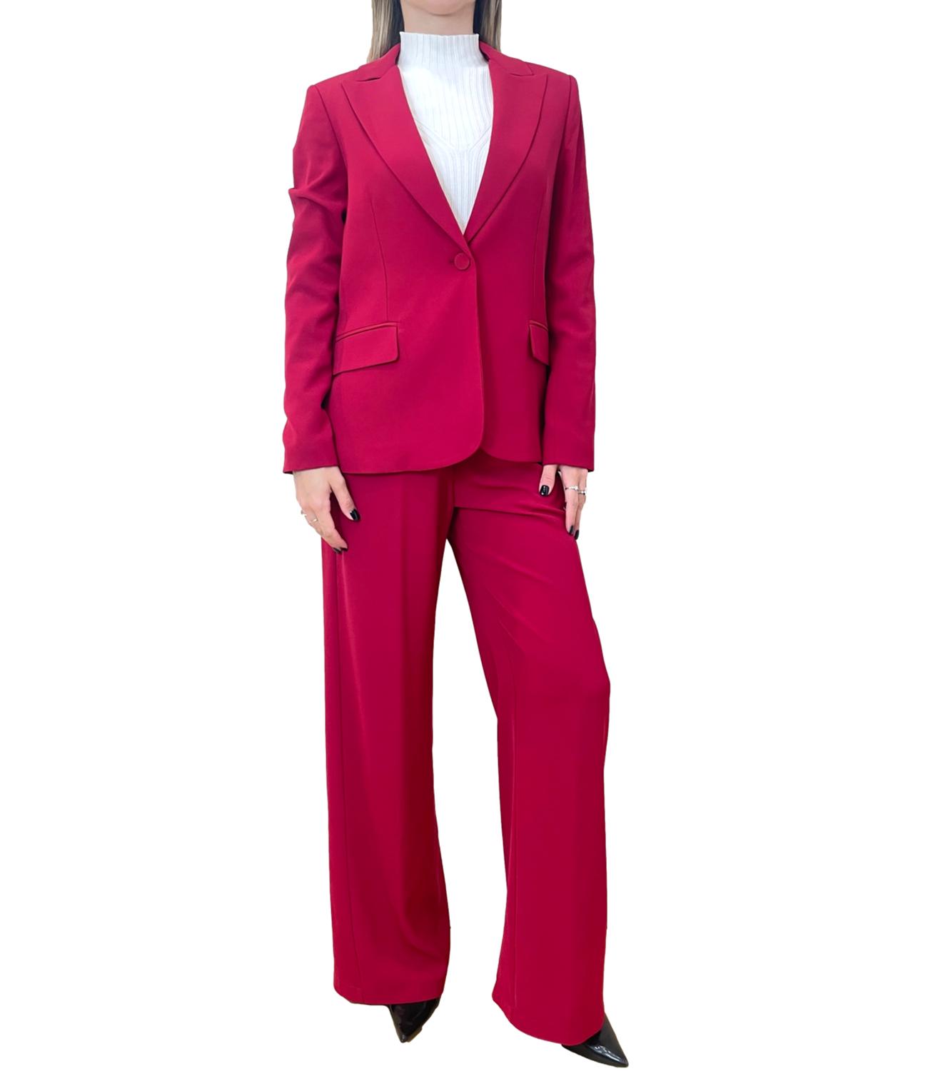 Questo tailleur è composto da una giacca monopetto con collo a rever classico, chiusura a un bottone tono su tono e tasche con patta che ne esaltano la linea strutturata e femminile.