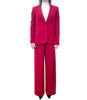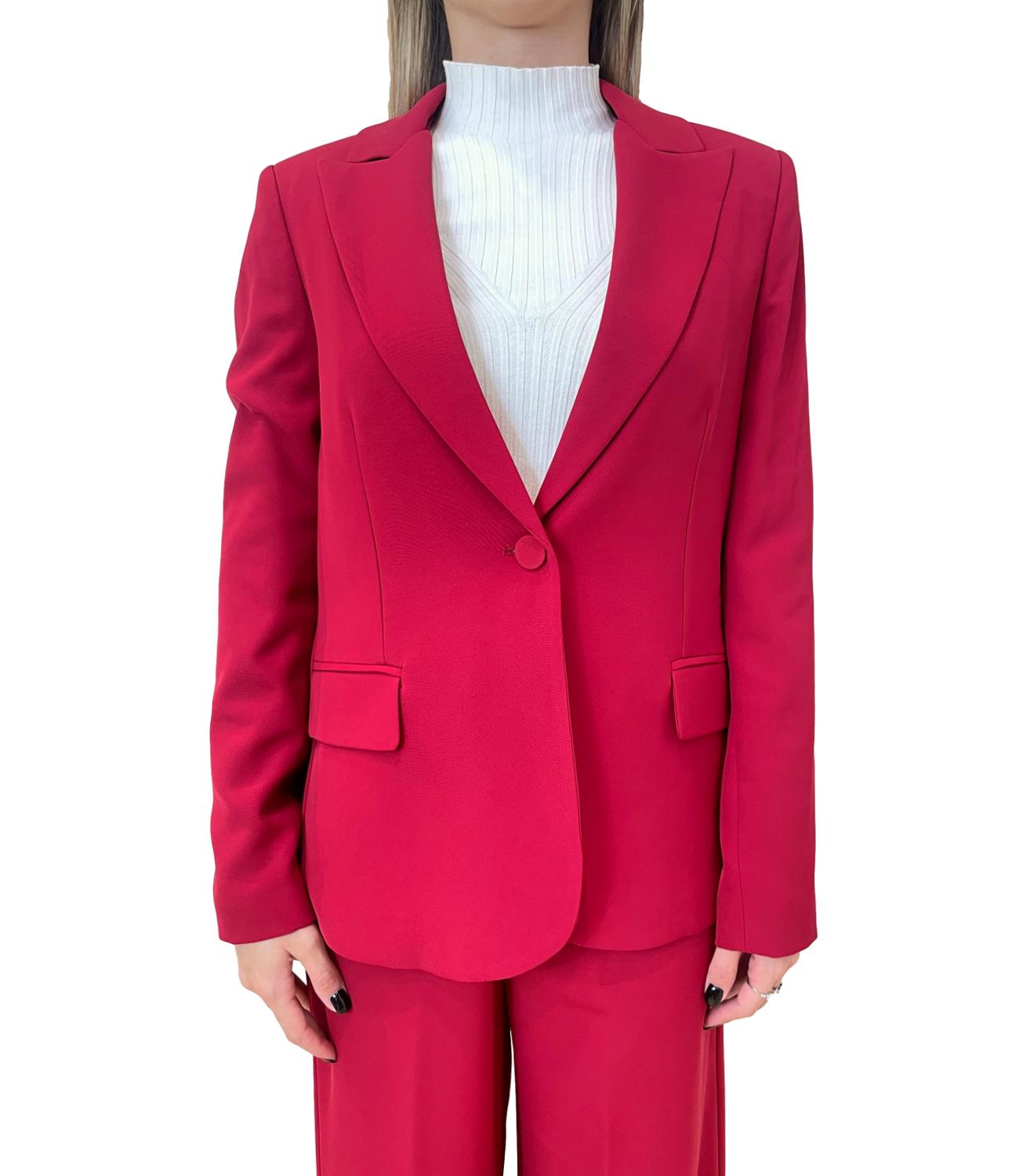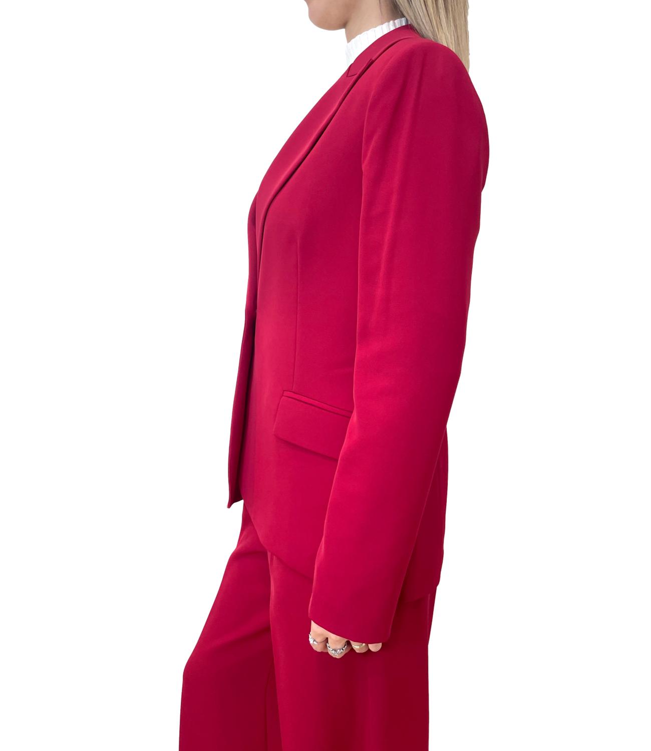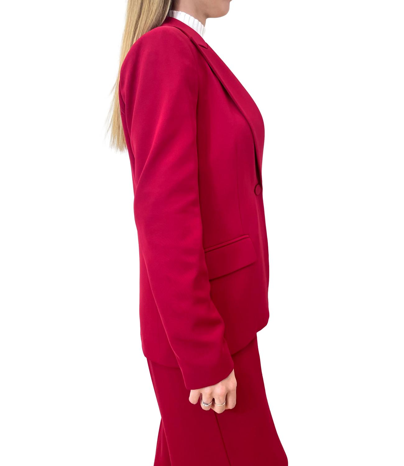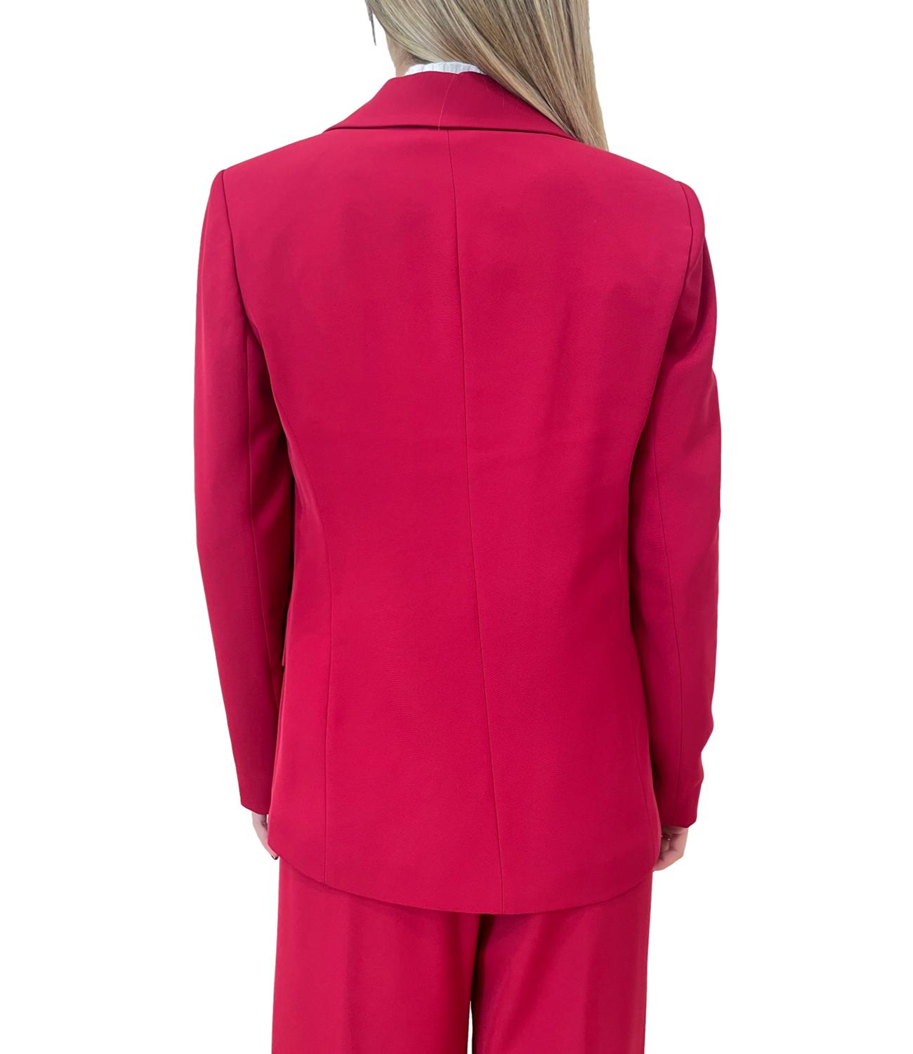 Questo tailleur è composto da una giacca monopetto con collo a rever classico, chiusura a un bottone tono su tono e tasche con patta che ne esaltano la linea strutturata e femminile.