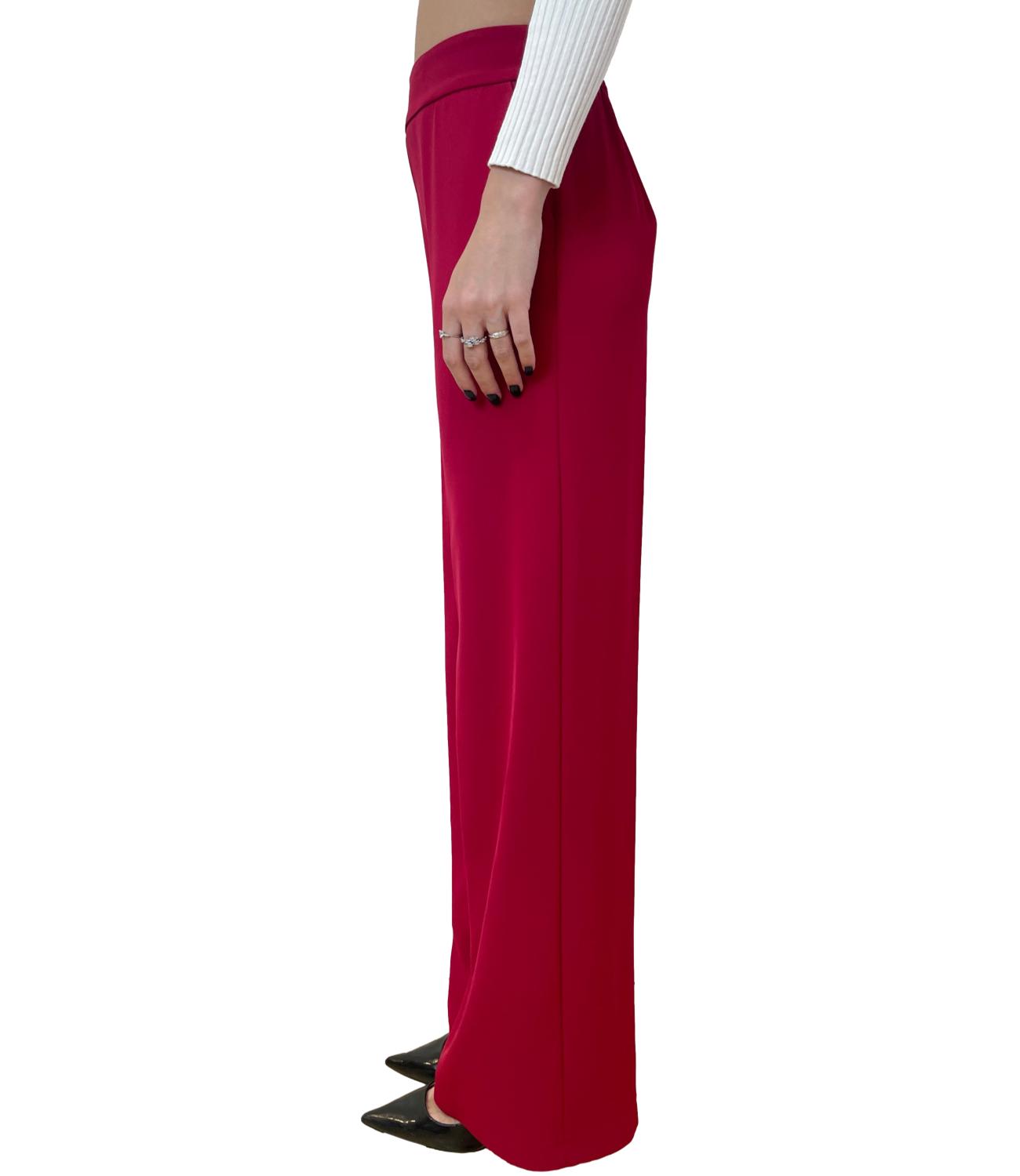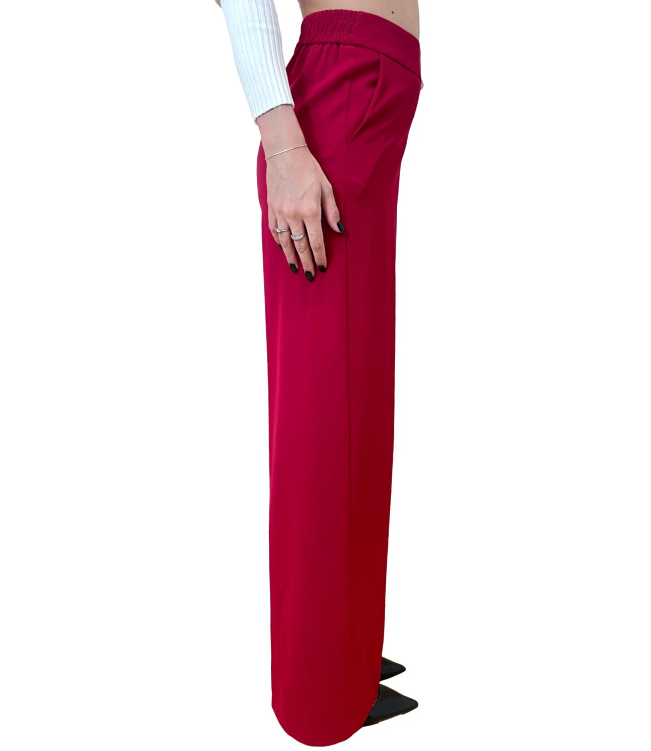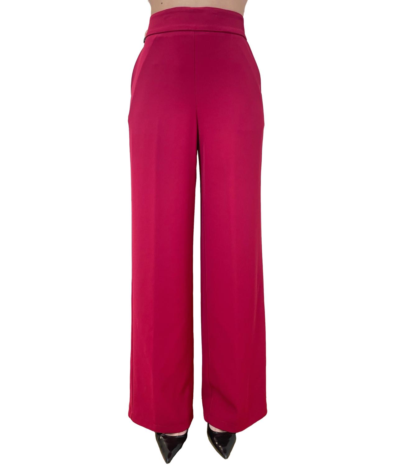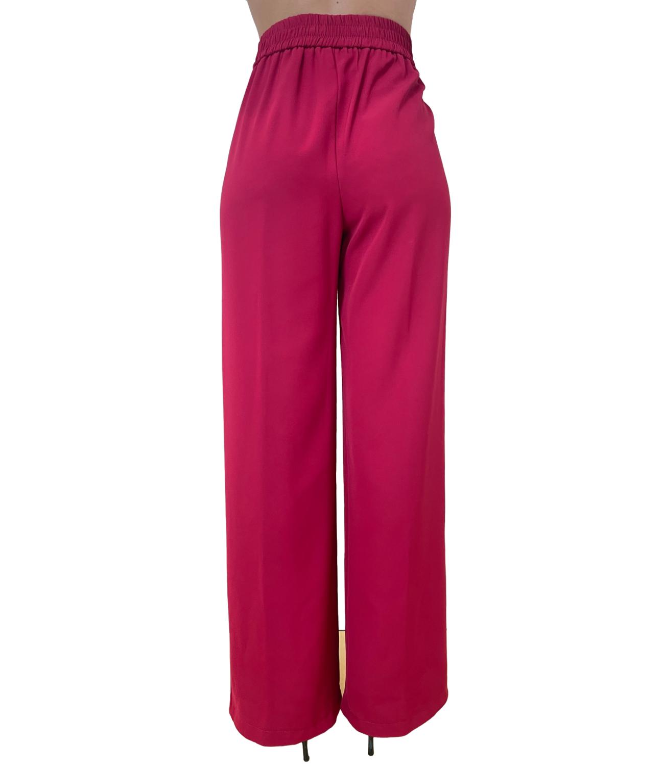 I pantaloni palazzo a vita alta completano l'insieme con una linea ampia e fluida, impreziosita da finta patta anteriore e comodo elastico sul retro, per una vestibilità perfetta. Il taglio pulito e il tessuto fluido donano comfort ed eleganza, ideale sia per l'ufficio che per un'occasione speciale.