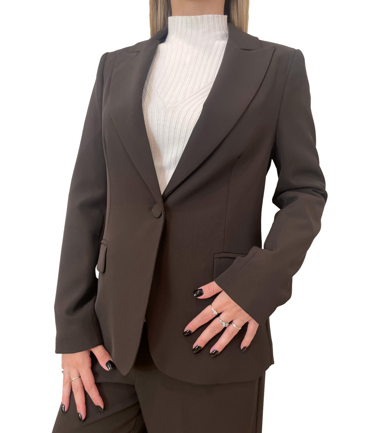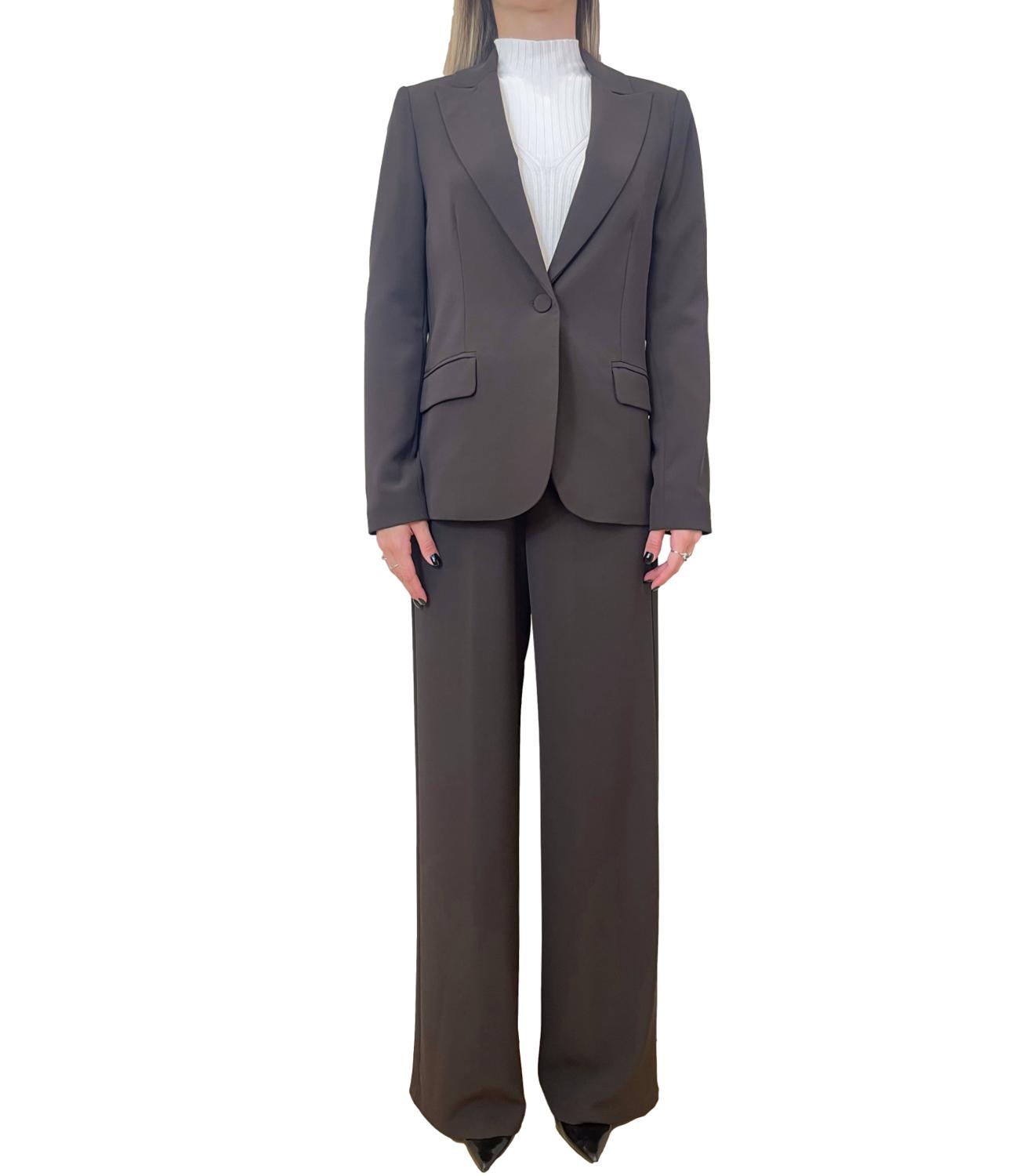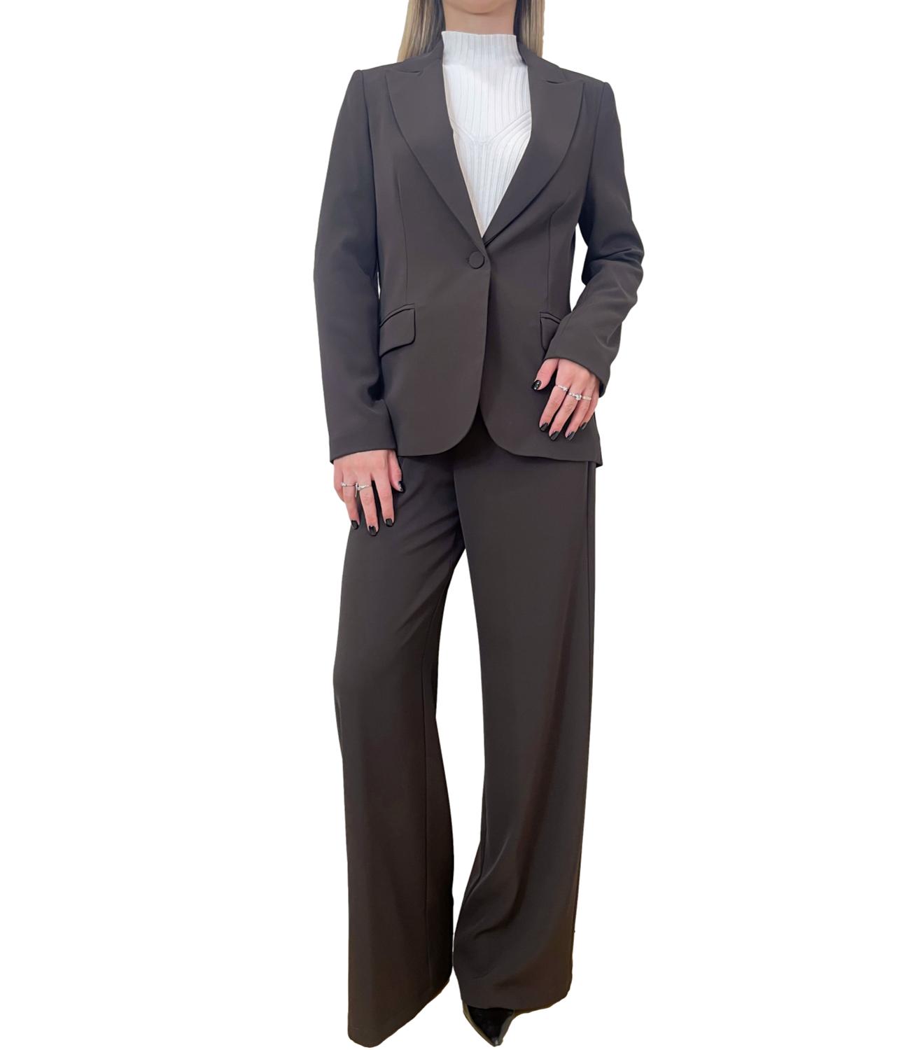 Questo tailleur è composto da una giacca monopetto con collo a rever classico, chiusura a un bottone tono su tono e tasche con patta che ne esaltano la linea strutturata e femminile.