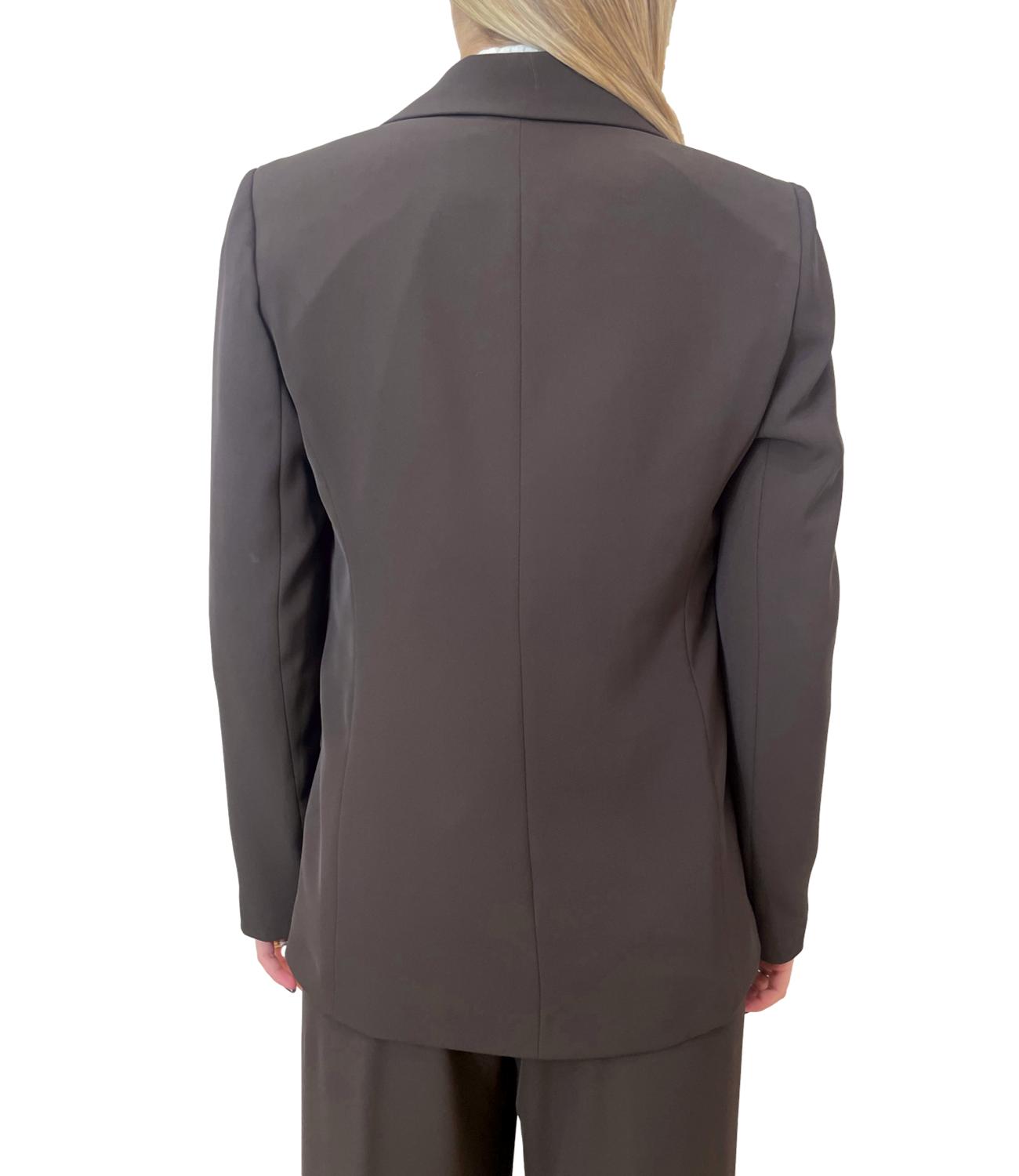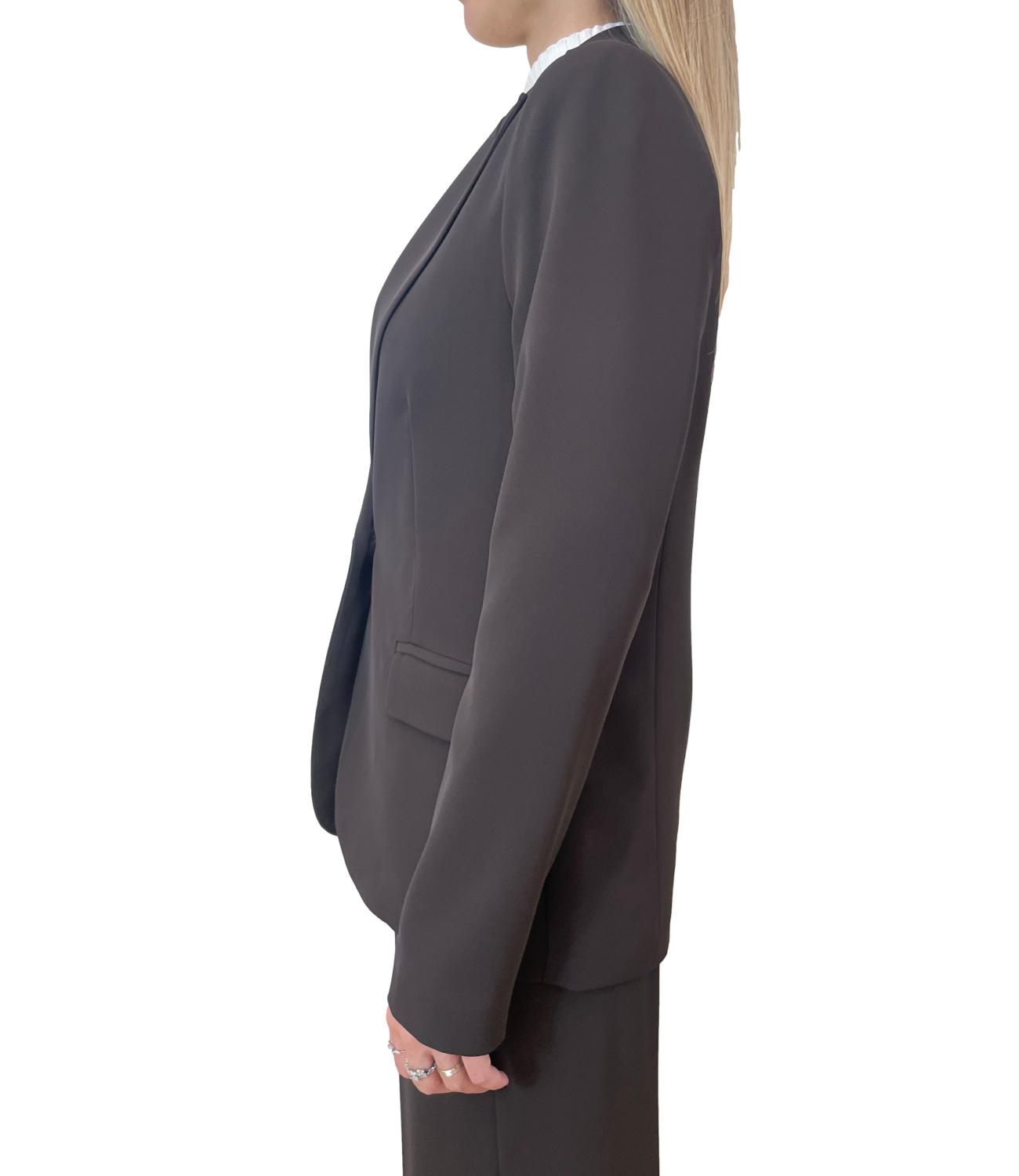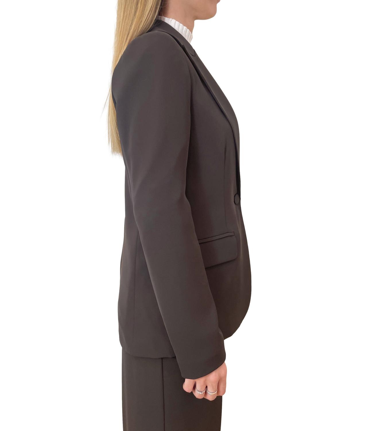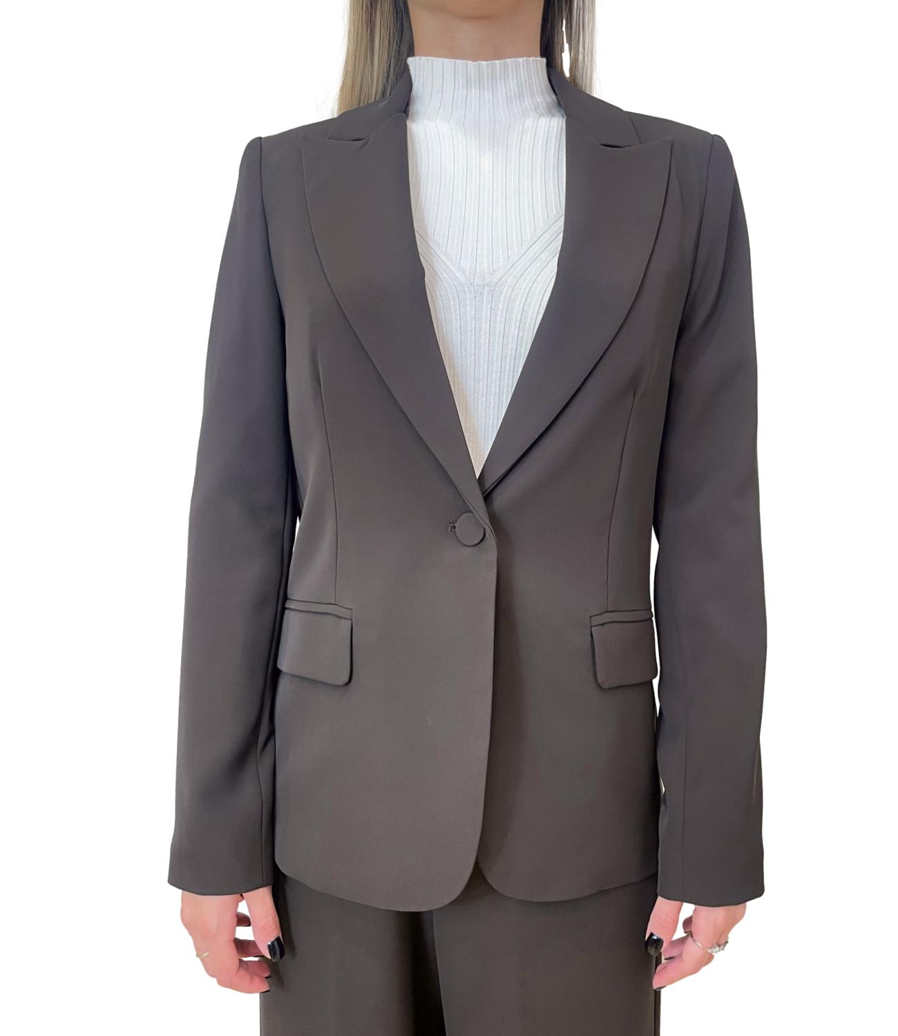 Questo tailleur è composto da una giacca monopetto con collo a rever classico, chiusura a un bottone tono su tono e tasche con patta che ne esaltano la linea strutturata e femminile.