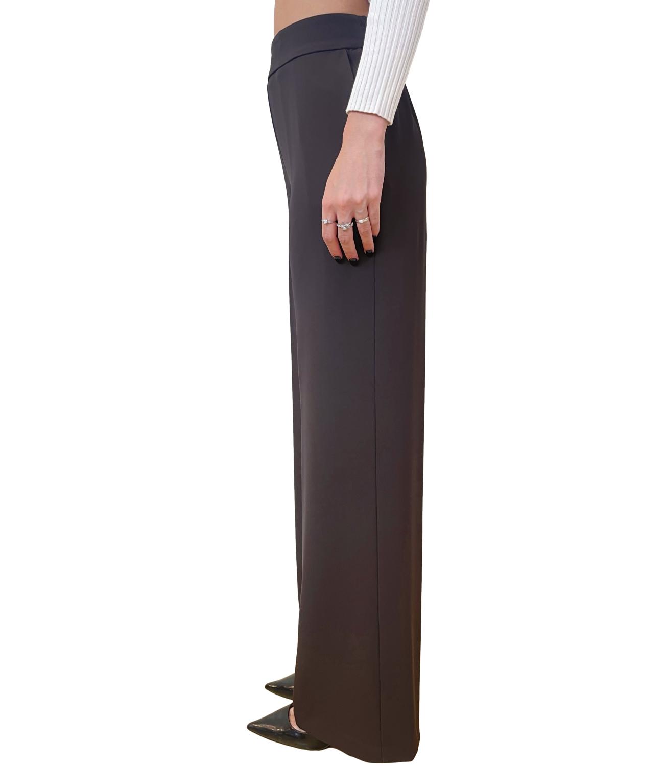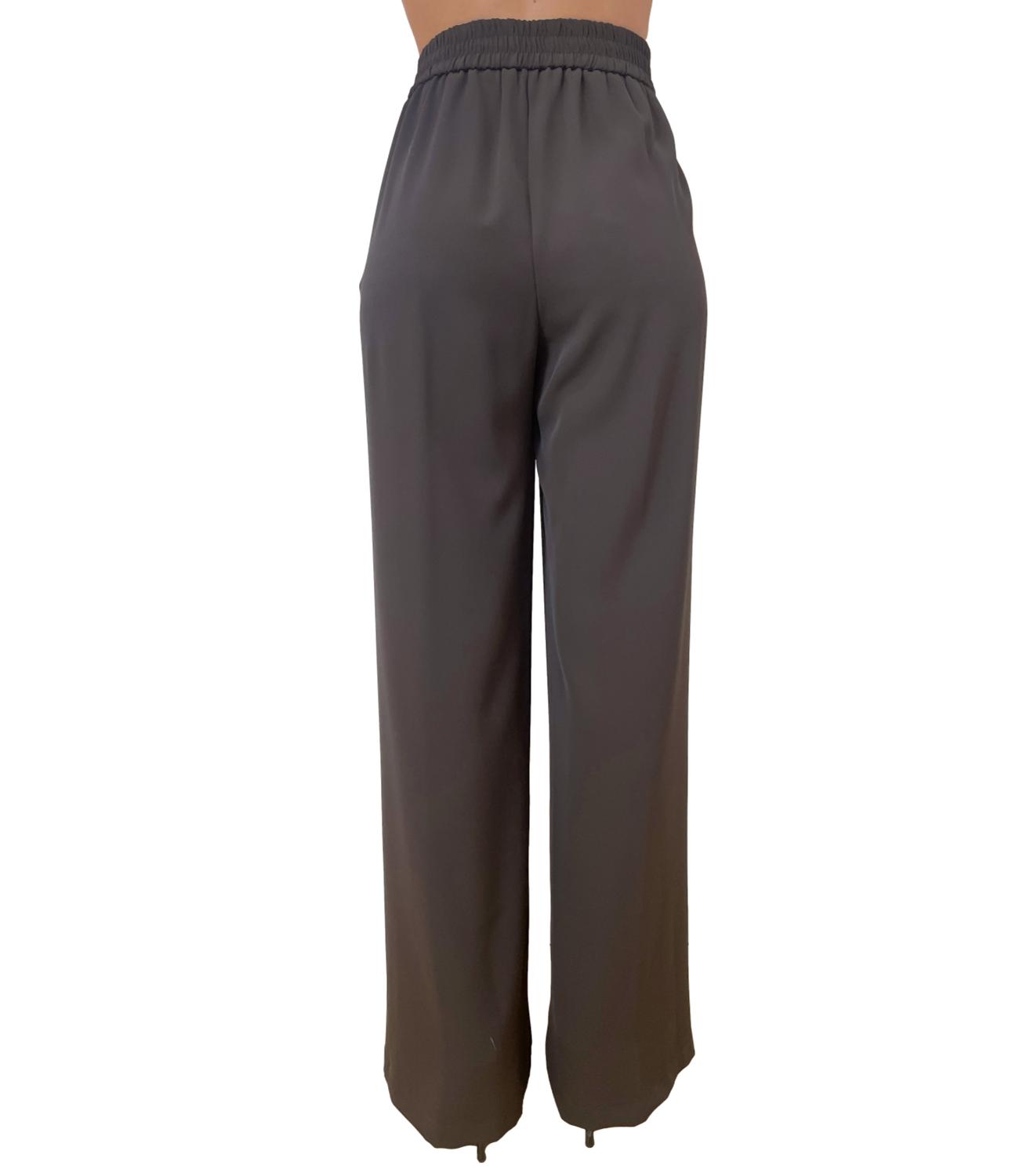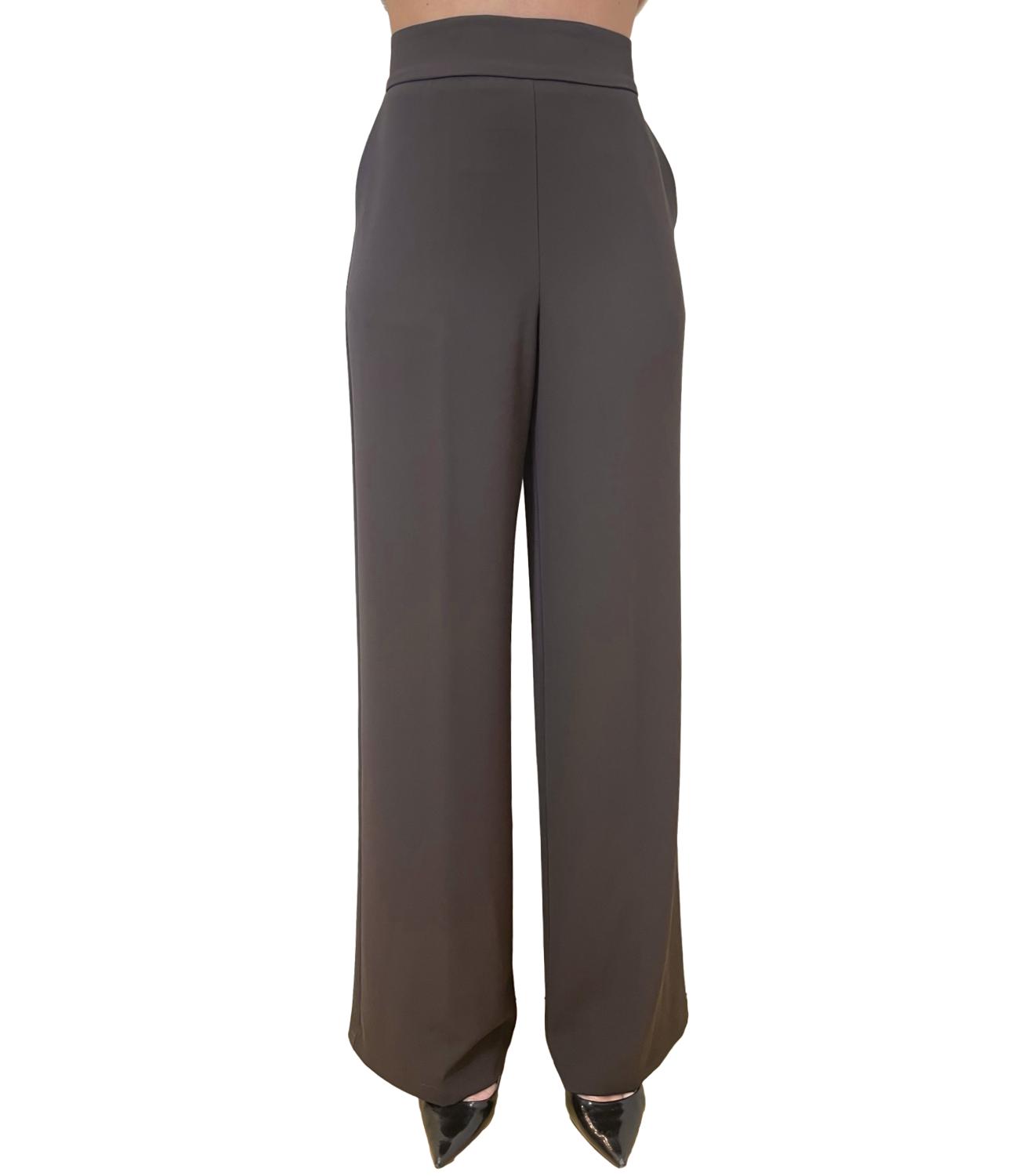 I pantaloni palazzo a vita alta completano l'insieme con una linea ampia e fluida, impreziosita da finta patta anteriore e comodo elastico sul retro, per una vestibilità perfetta. Il taglio pulito e il tessuto fluido donano comfort ed eleganza, ideale sia per l'ufficio che per un'occasione speciale.