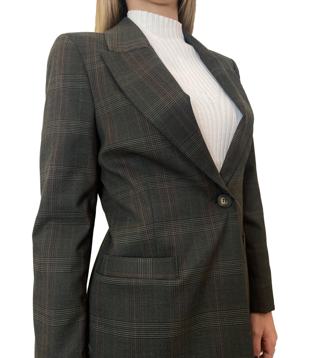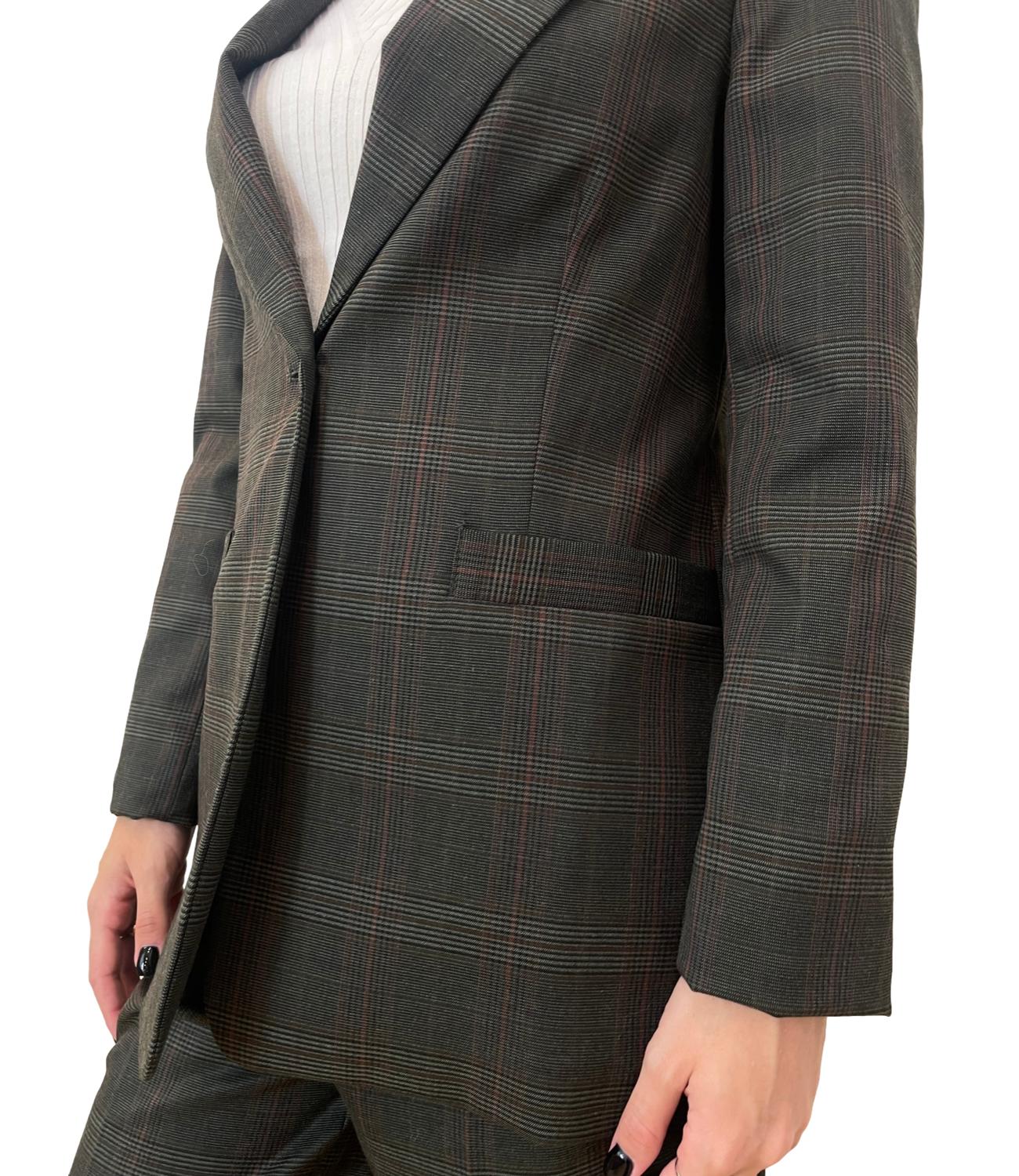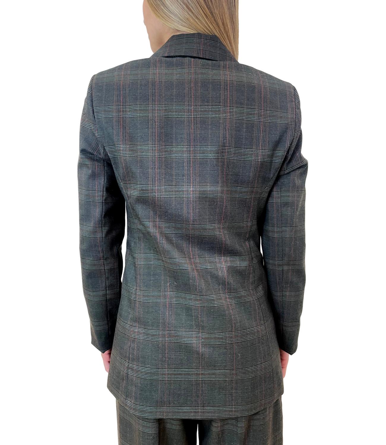 Blazer Kontatto dal taglio dritto con spalle definite, studiato per una silhouette asciutta ma comoda. Tessuto check in misto viscosa dalla mano compatta. Rever a lancia e chiusura monopetto valorizzano il punto vita; tasche a filetto per un finish pulito. Perfetto per l'ufficio e gli aperitivi post-work.