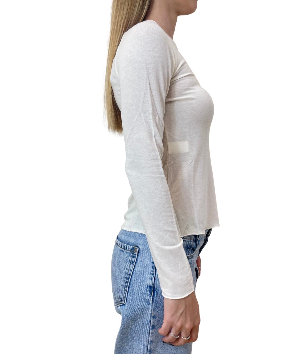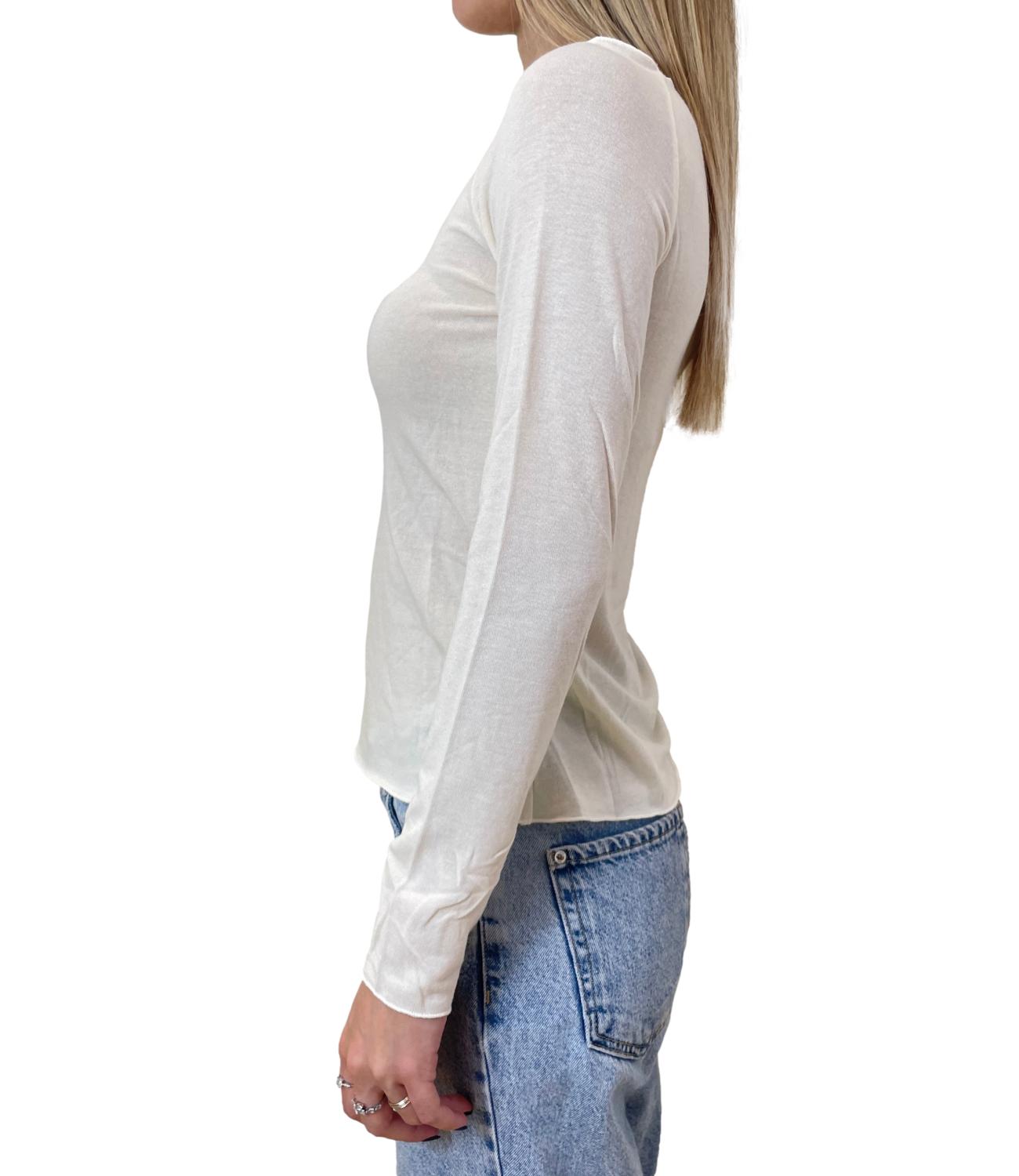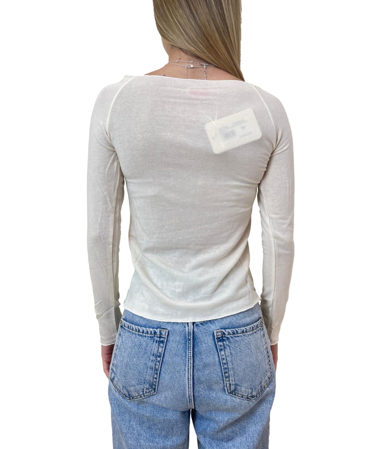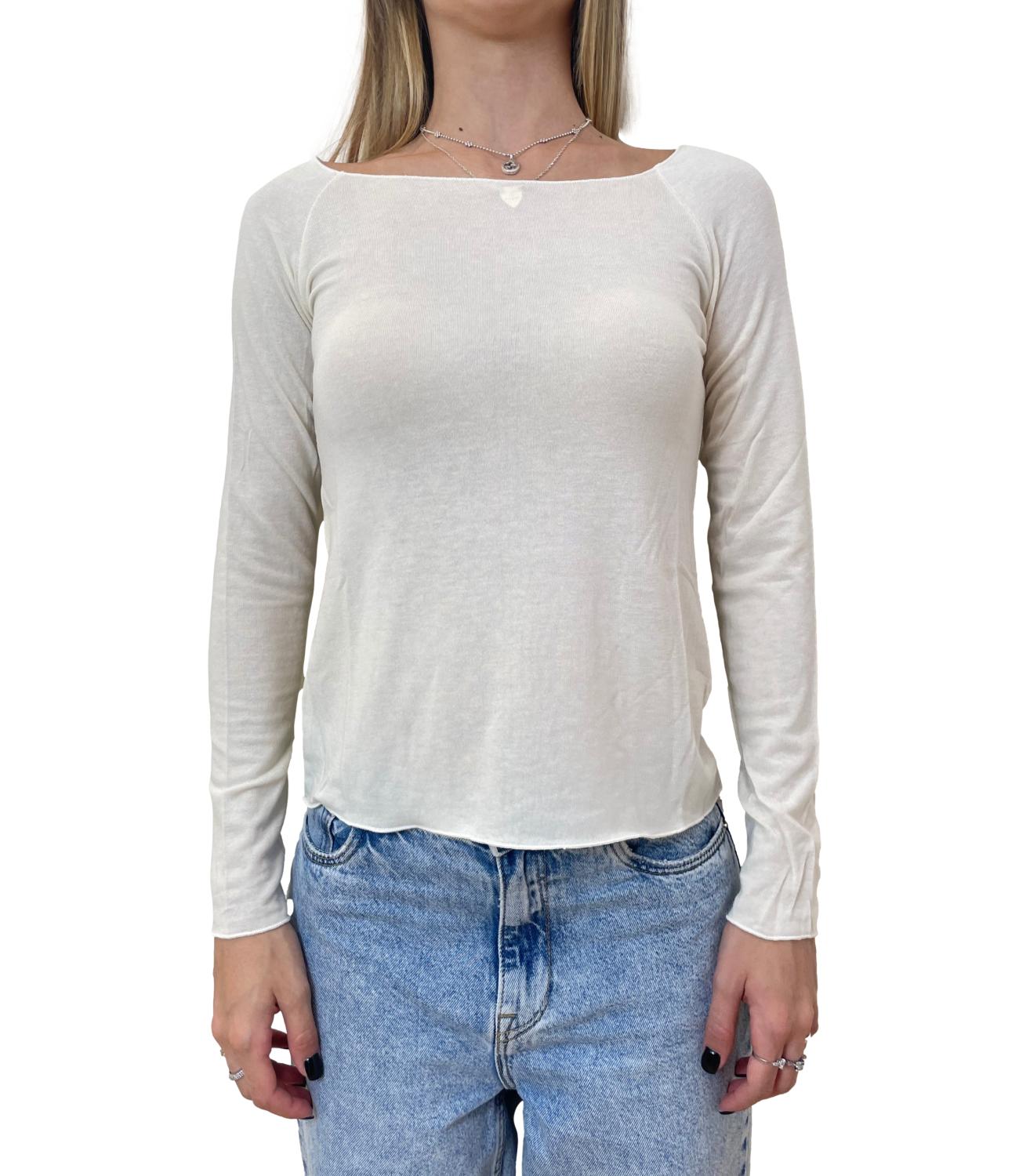 Semplice e raffinato, questo maglione a maniche lunghe dal taglio essenziale esalta la femminilità con una scollatura elegante e linee pulite.