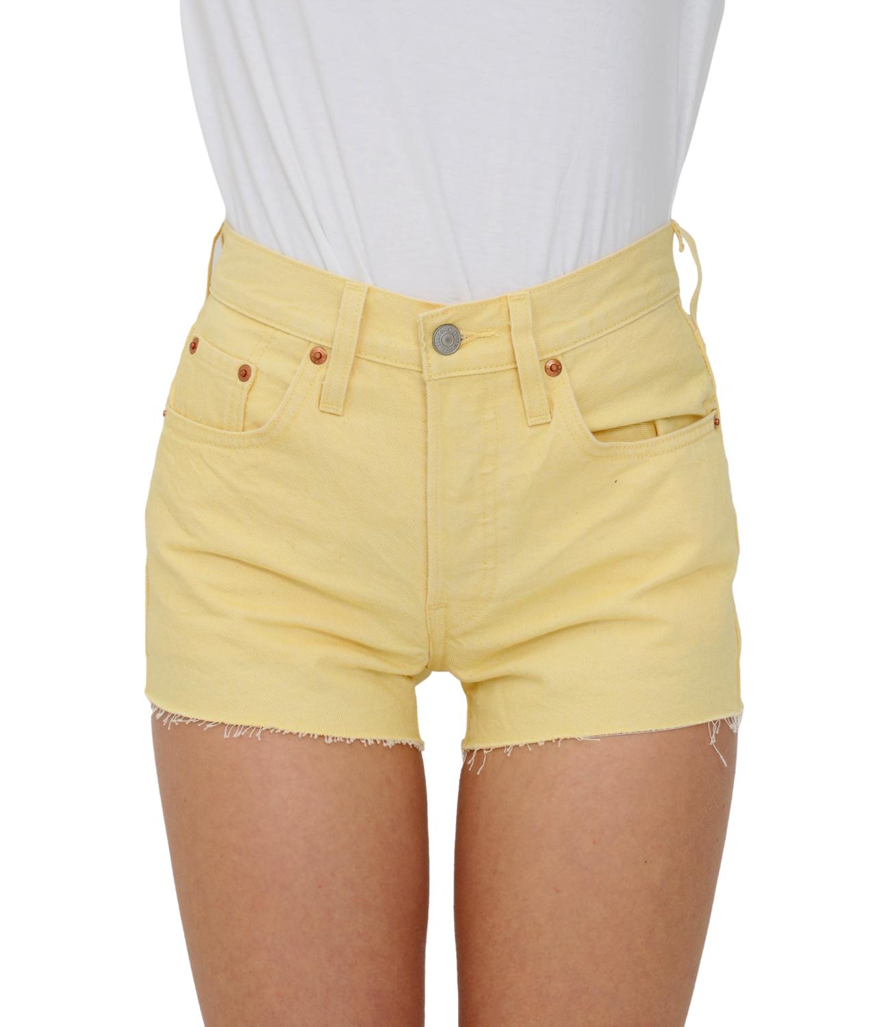 Shorts da donna Levi's con vita media, comode tasche, passanti per cintura e chiusura con zip e bottone. Il jenas giallo la targhetta iconica del brand sul retro.