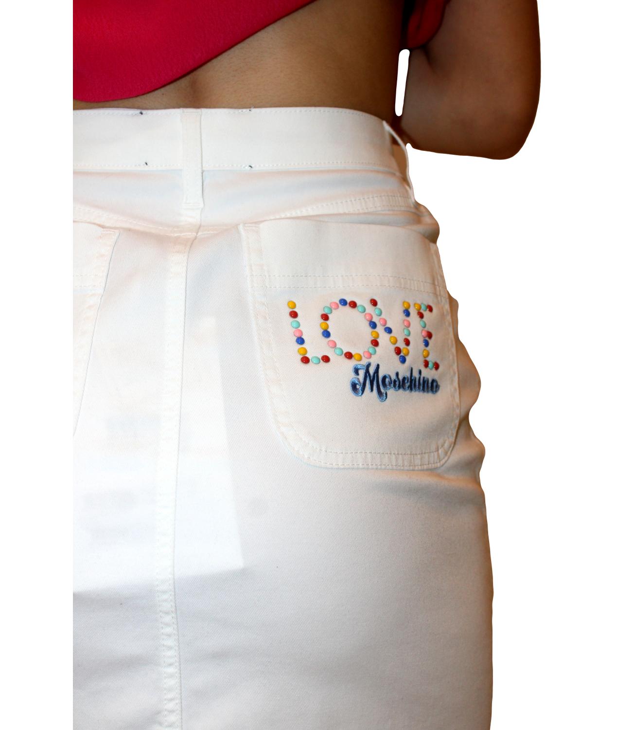 Gonna Love Moschino bianca con bottoni colorati nella zona frontale, lunghezza sopra il ginocchi. Da abbinare con la sua camicietta smanicata per completare il look o con una t-shirt coloratra!