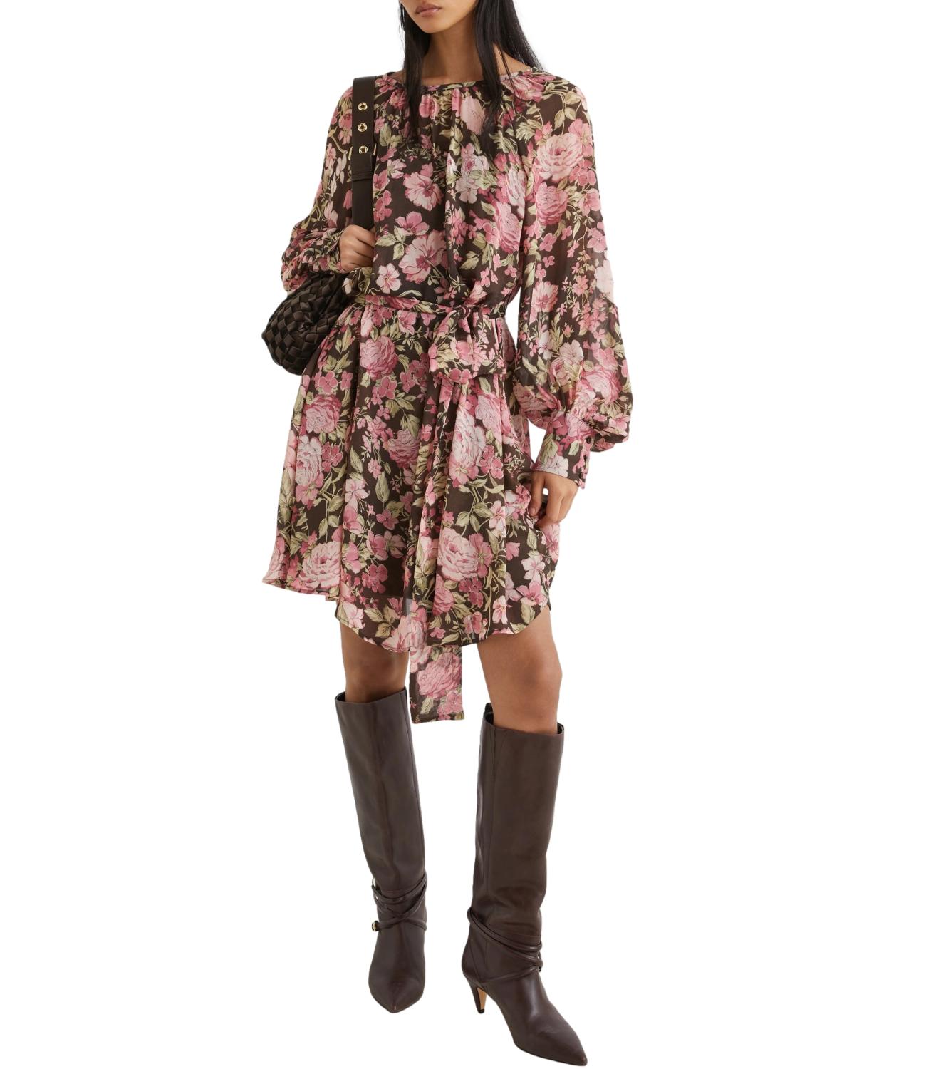 Romantico metropolitano: nuovo abito corto in georgette stampata, con una luminosa fantasia floreale. La fusciacca da annodare in vita mette in risalto la silhouette, enfatizzata anche dal volume a sbuffo delle maniche.