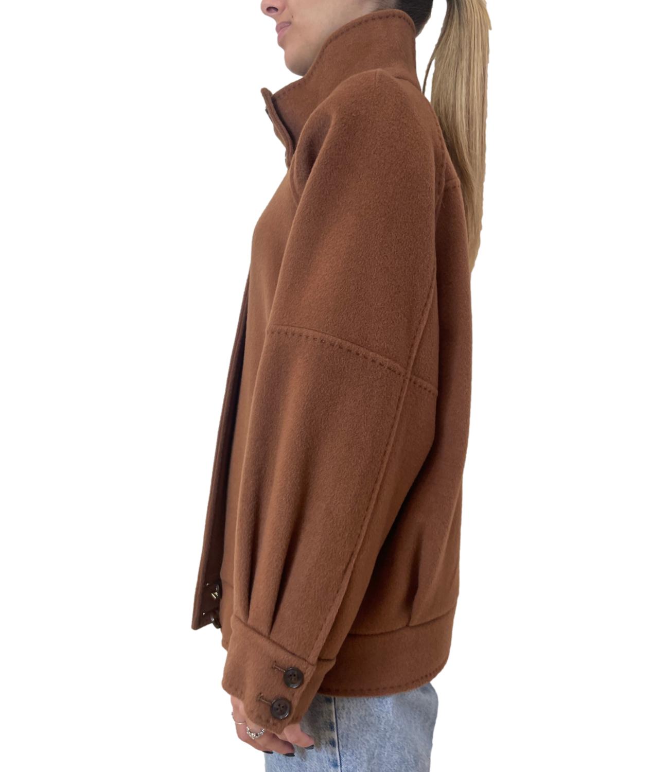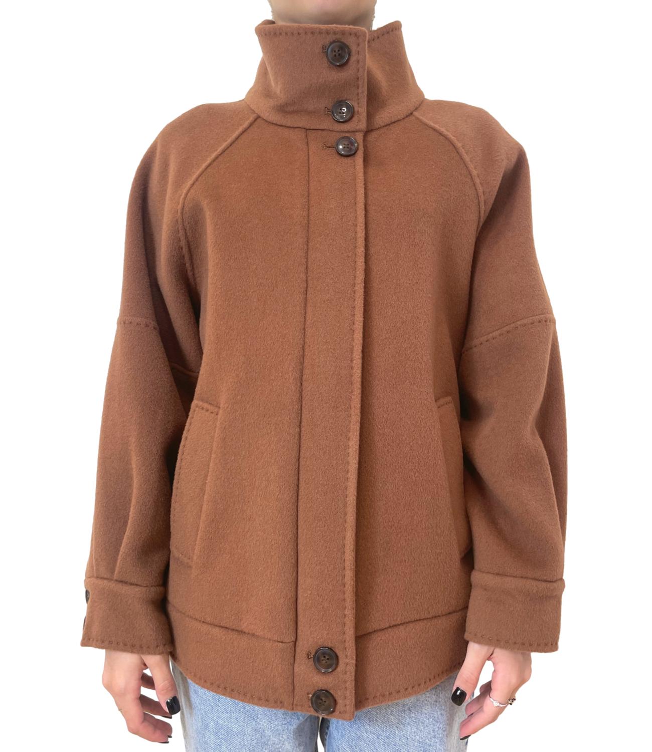 Giaccone in double di lana e cashmere dalla linea over. Collo in piedi con bottoni e maniche raglan. Chiusura a cerniera coperta a doppio cursore e tasche laterali a filettone. Impunture a vista lungo i profili. Polsini con bottoni. Foderato.