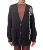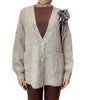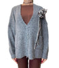 Maxi cardigan con doppia tasca sul fronte e spilla a pon pon con pietrina. Effetto over.