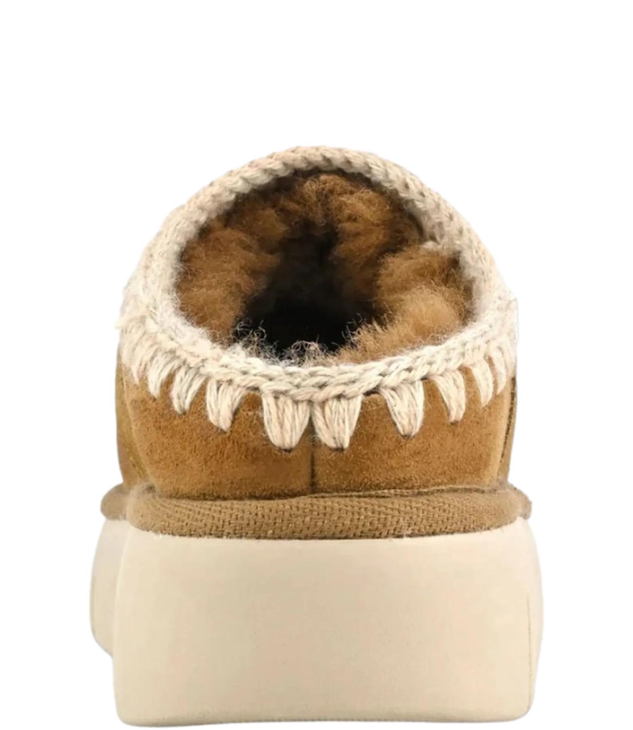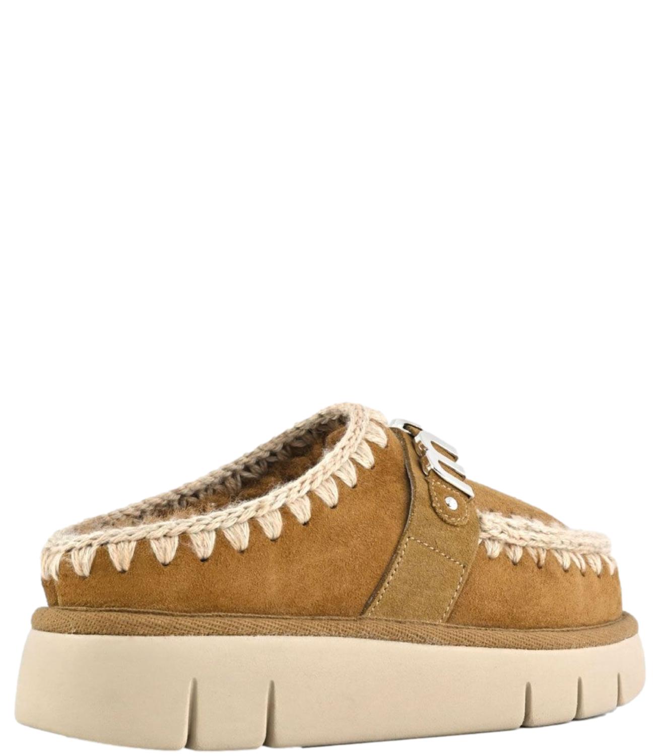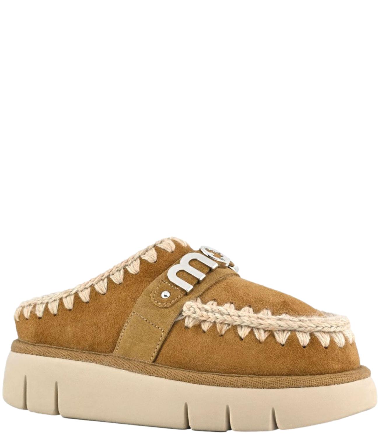 Il bounce clog di mou con logo in metallo è realizzato artigianalmente in vera pelle di montone double-face, con le inconfondibili cuciture in lana all'uncinetto firmate mou. Il plantare in morbido montone e la suola leggera in EVA & gomma rendono questo modello incredibilmente comodo da indossare.