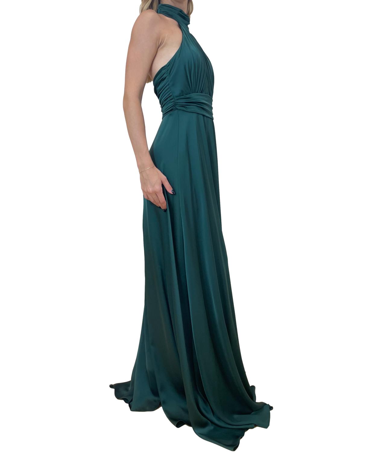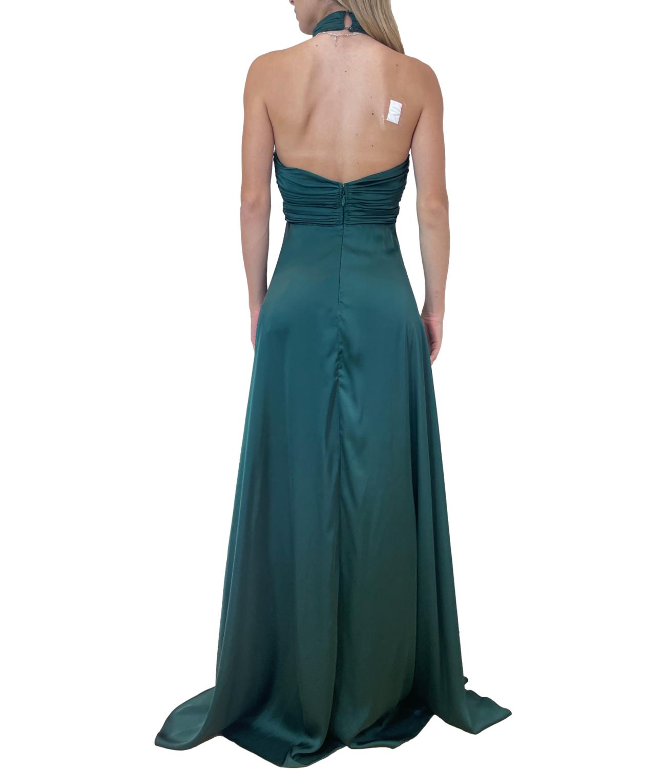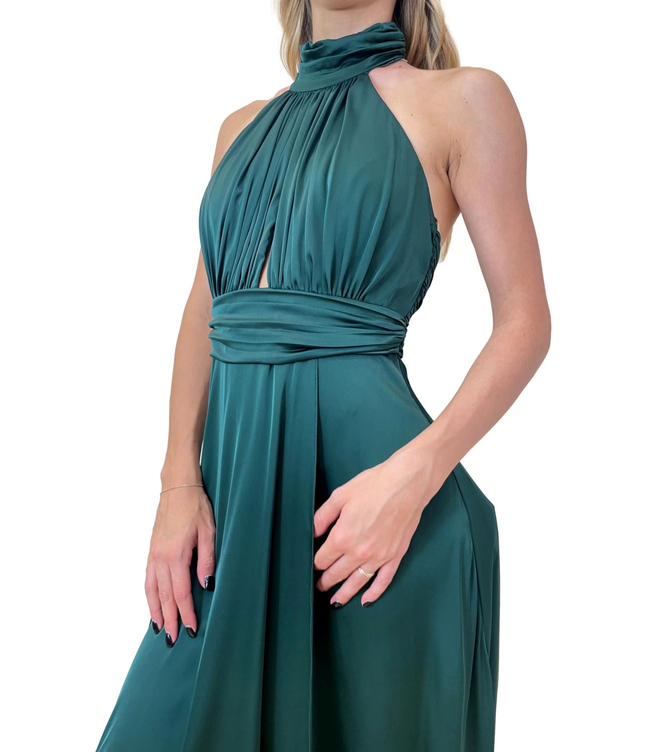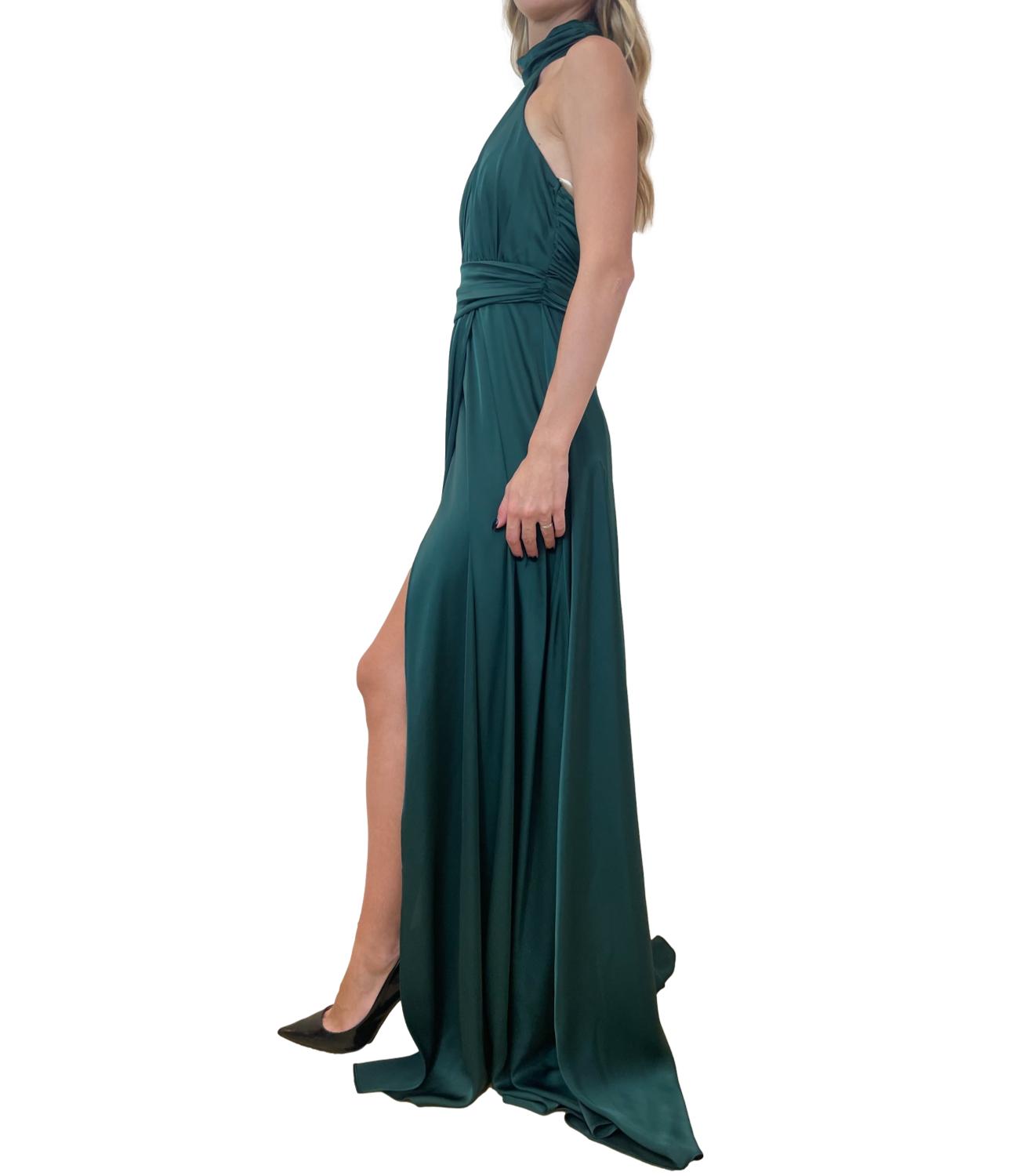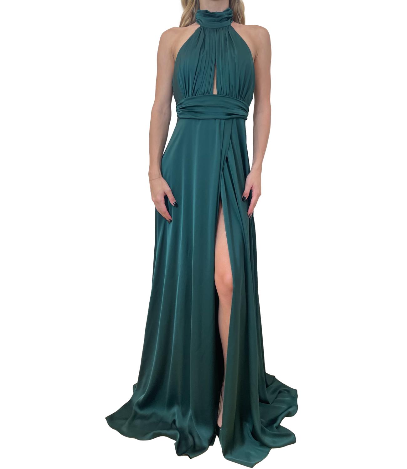 Abito lungo in raso satinato. Il modello scivola con eleganza lungo la figura, caratterizzato da una finitura lucida che riflette delicatamente la luce. Il design è raffinato e sensuale, con uno spacco sormontato, che conferisce movimento e un tocco di audacia.
