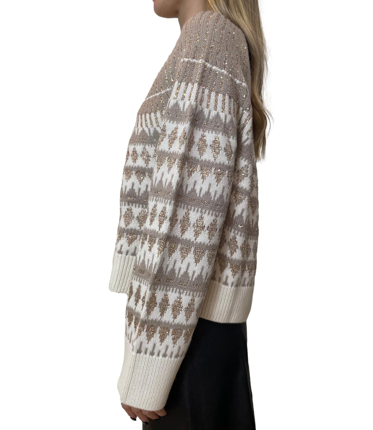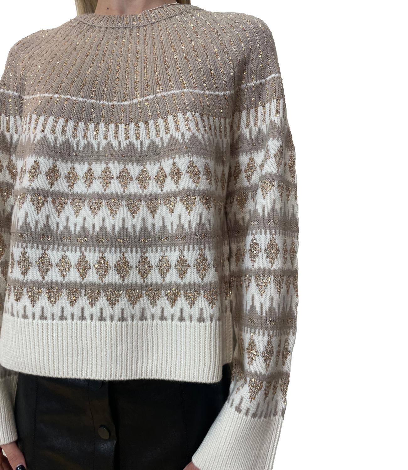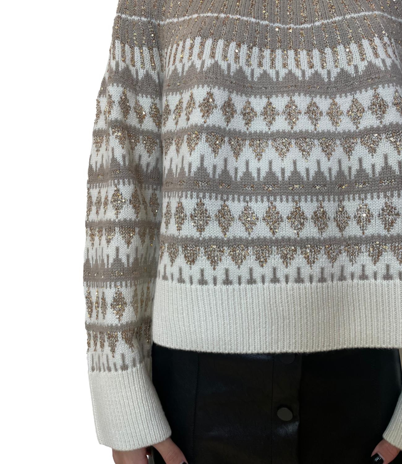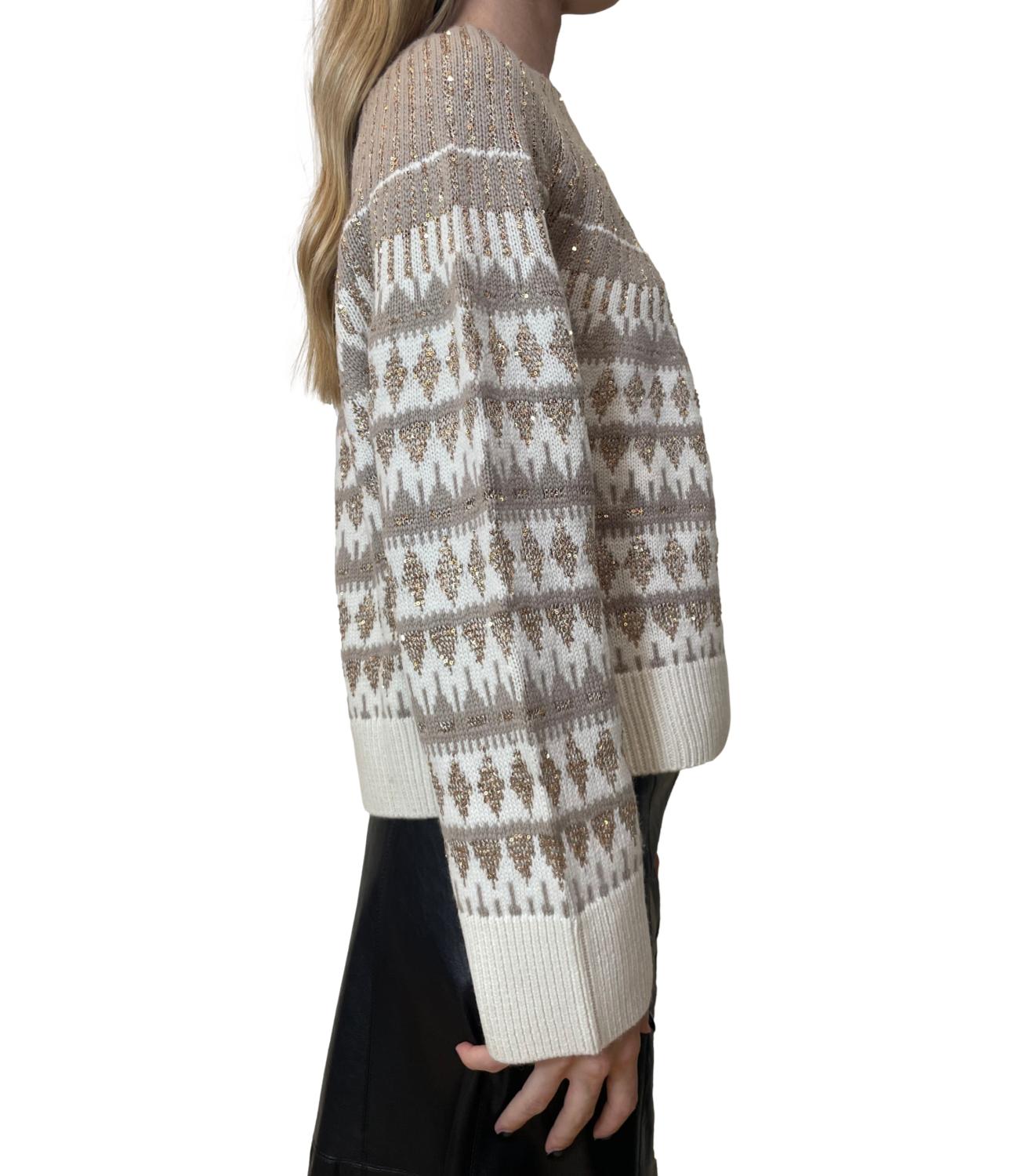 La maglia jacquard a motivi geometrici ha tutto il fascino del tricot nordico e un tocco in più: arricchita da riflessi scintillanti, accenderà ogni look.