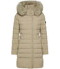 Piumino lungo trapuntato in leggero popeline di nylon e microfibra di poliestere, trattato ad alta temperatura per ottenere una mano sostenuta e un tatto polveroso, poi reso estremamente morbido grazie a un finissaggio al silicone. L'imbottitura in piuma naturale certificata assicura protezione termica con leggerezza, mentre il trattamento idrorepellente mantiene il comfort anche in caso di pioggia leggera. Il design è definito da una zip centrale a doppio cursore, collo avvolgente con bottoni a pressione tono su tono e cappuccio con bordo in pelliccia di volpe, removibile. Le tasche laterali con bottone a pressione completano un capo raffinato e funzionale, perfetto per l'inverno in città. Un modello iconico del brand, reinterpretato con dettagli moderni ed ancora più raffinati.
