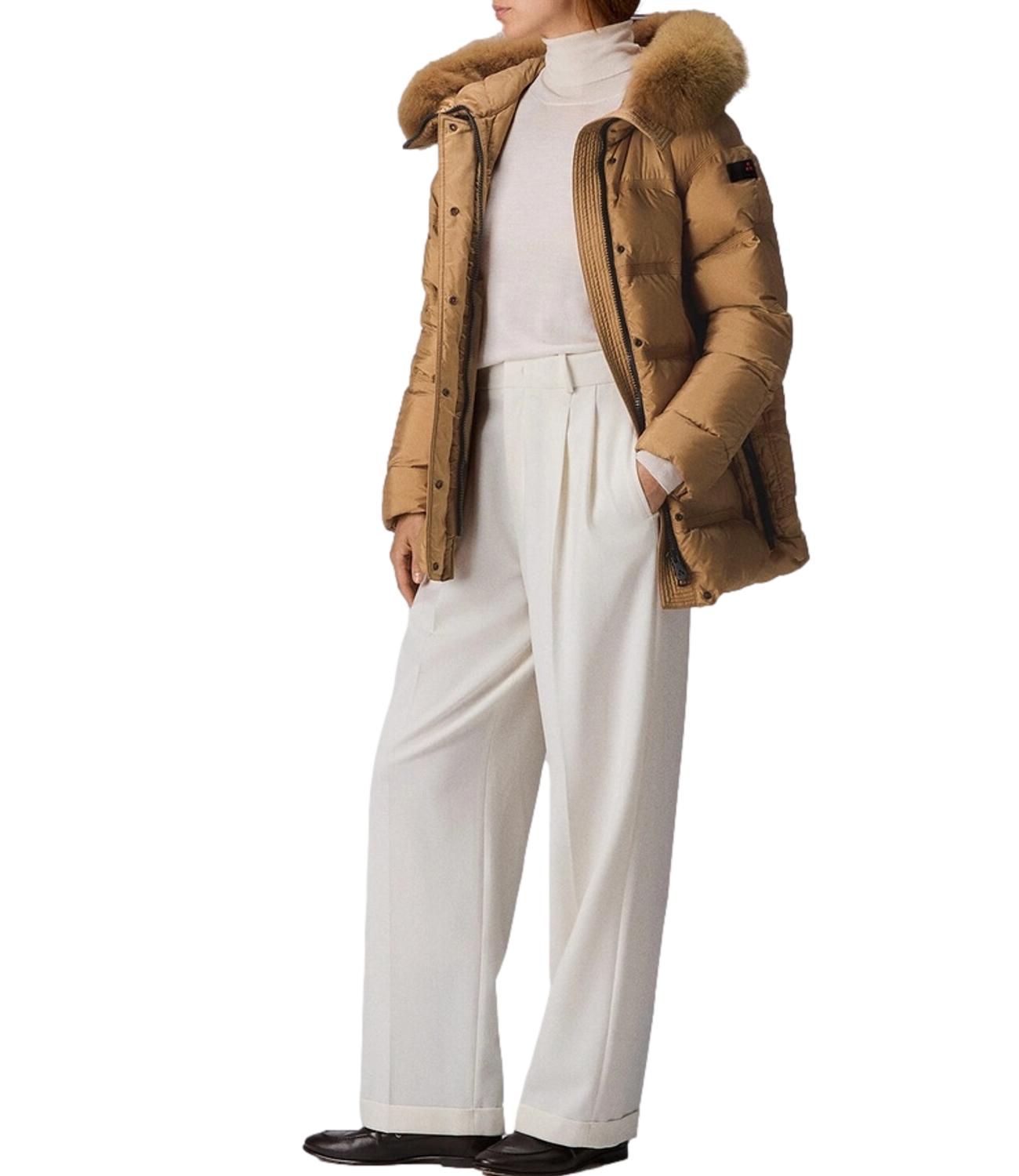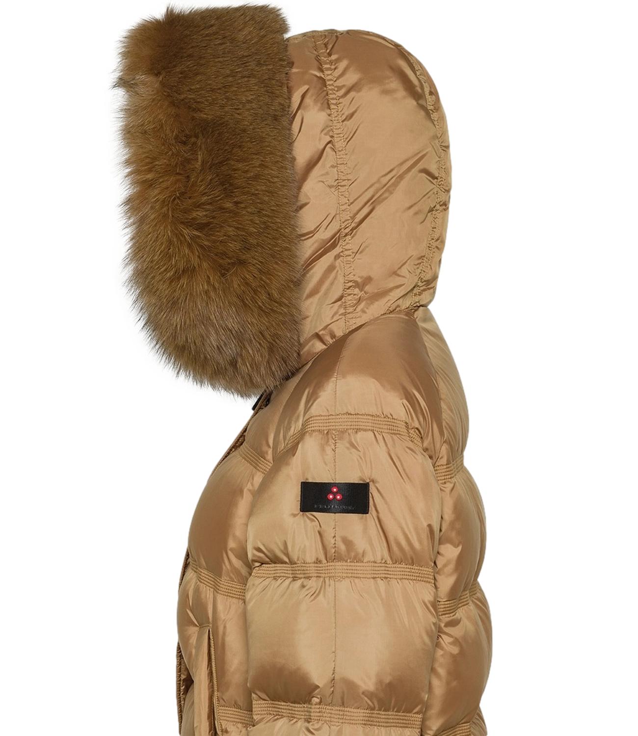 Puffer jacket ad ampie trapunte, in tessuto super-light in 100% poliestere riciclato da materiali post consumo, dalla mano morbida e dalla struttura super compatta. L'imbottitura in piuma d'oca certificata assicura calore elevato e leggerezza, mentre il trattamento idrorepellente PFC Free protegge senza l'uso di sostanze chimiche nocive. Di gusto urban sportswear, la shape ad A è regolabile grazie all'apertura delle zip laterali, mentre il cappuccio fisso è arricchito da un bordo in pelliccia di volpe staccabile in tono colore. Completano il modello le tasche a filetto, la chiusura con patta e bottoni che nasconde una zip a doppio cursore. Il modello, bestseller della collezione invernale di Peuterey, ora nei colori trend della stagione, può essere indossato anche in occasioni eleganti e mondane.