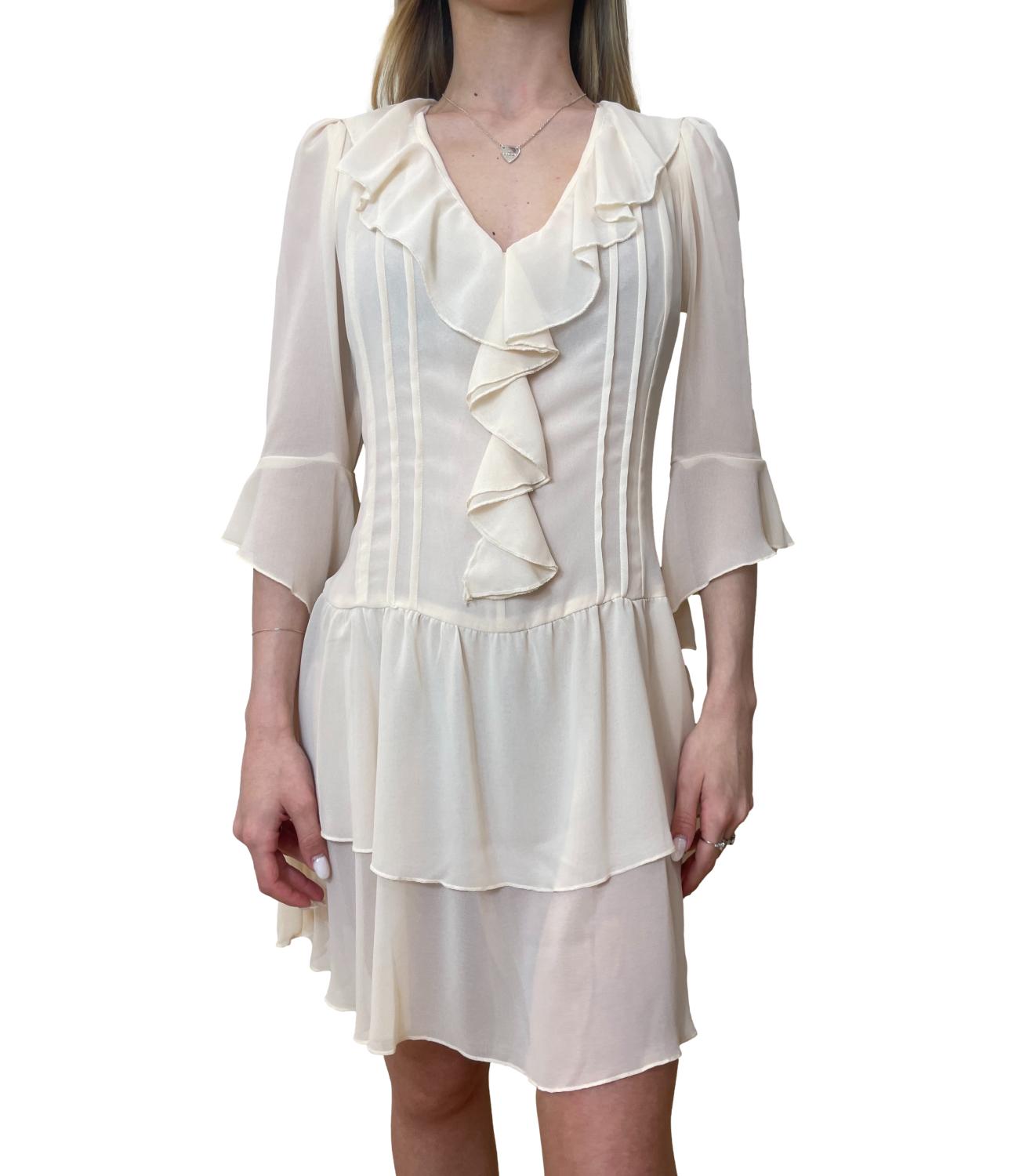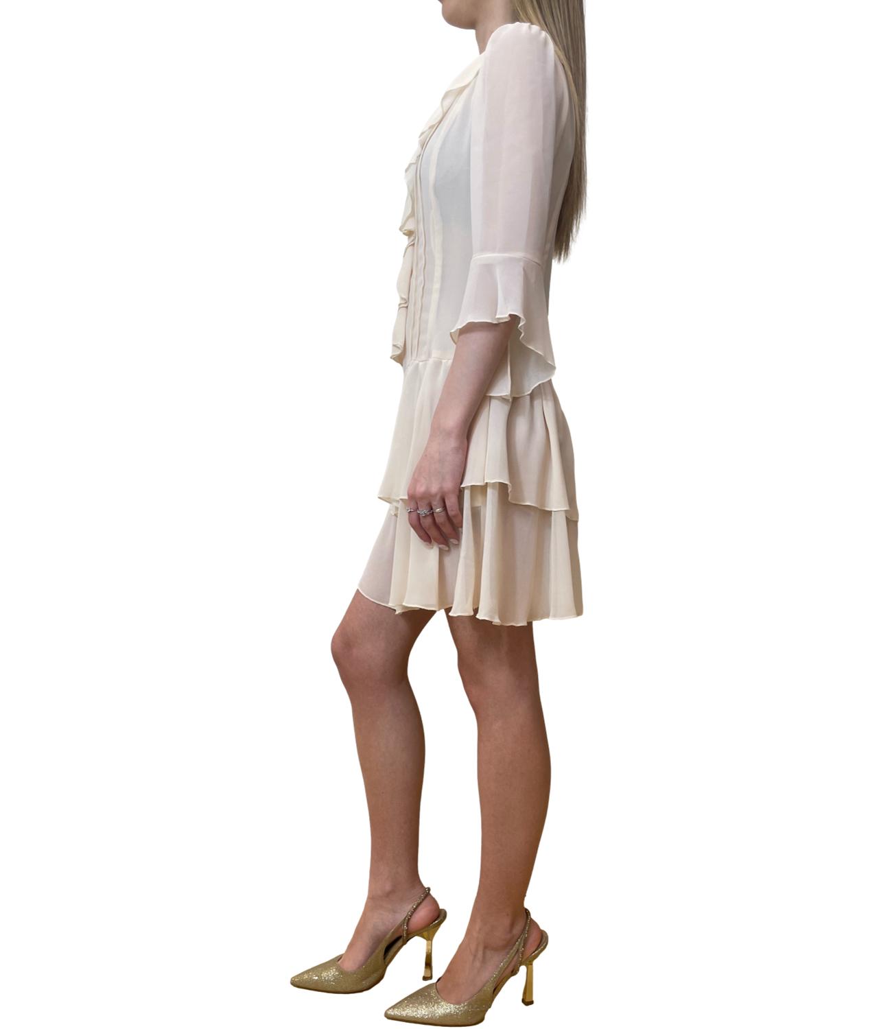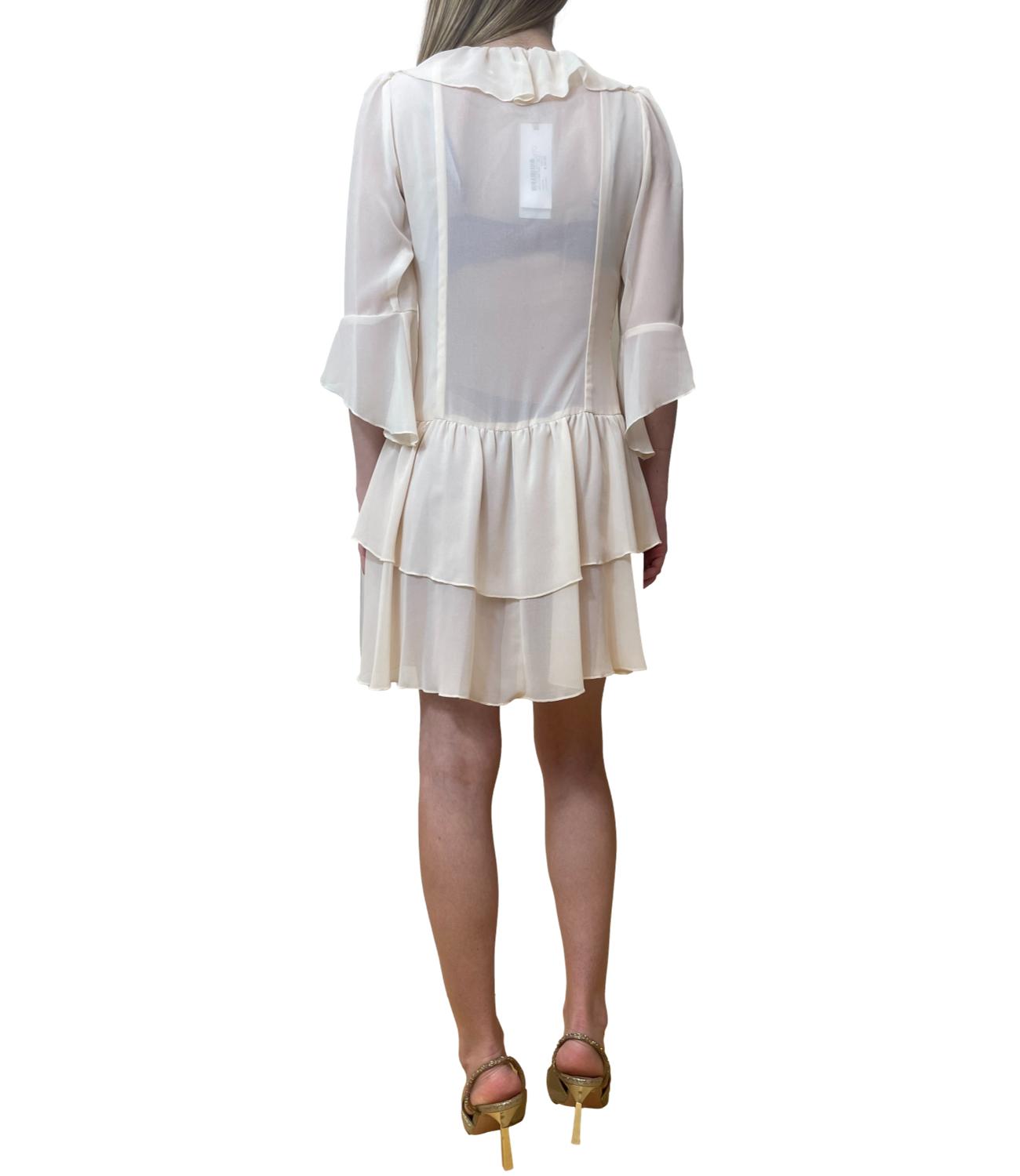 Vestito corto stile bohemien con scollo v e dettaglio di rouches. Maniche scampanate e balze sul fondo.