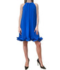 Abito corto smanicato dalla linea dritta e morbida caratterizzato da uno scollo all'americana con catenina regolabile e il fondo composto da piccole balze.