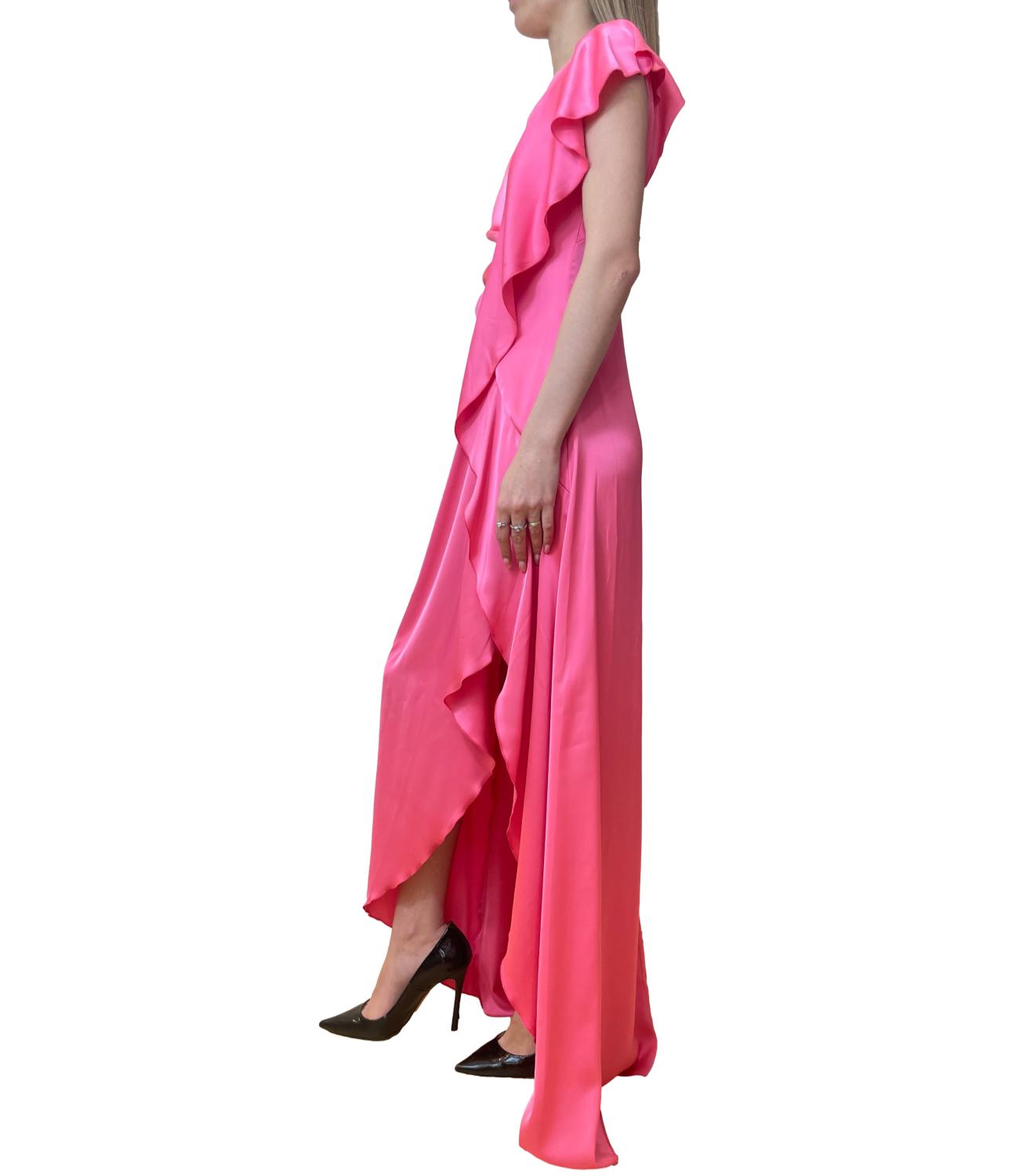 Elegante abito lungo smanicato caratterizzato da una scollatura quadrata e da un volant a cascata sul davanti che aggiunge volume e movimento partendo da una spalla e proseguendo fino all'orlo, mentre sul retro troviamo un cut-out con chiusura a bottoncini sul collo e zip sulla schiena.