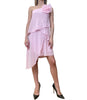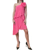 Elegante abito corto monospalla composto da balze incrociate e plissettatura sulla spalla.