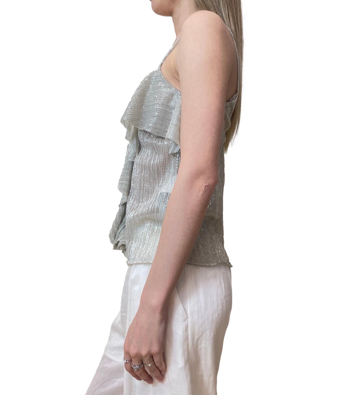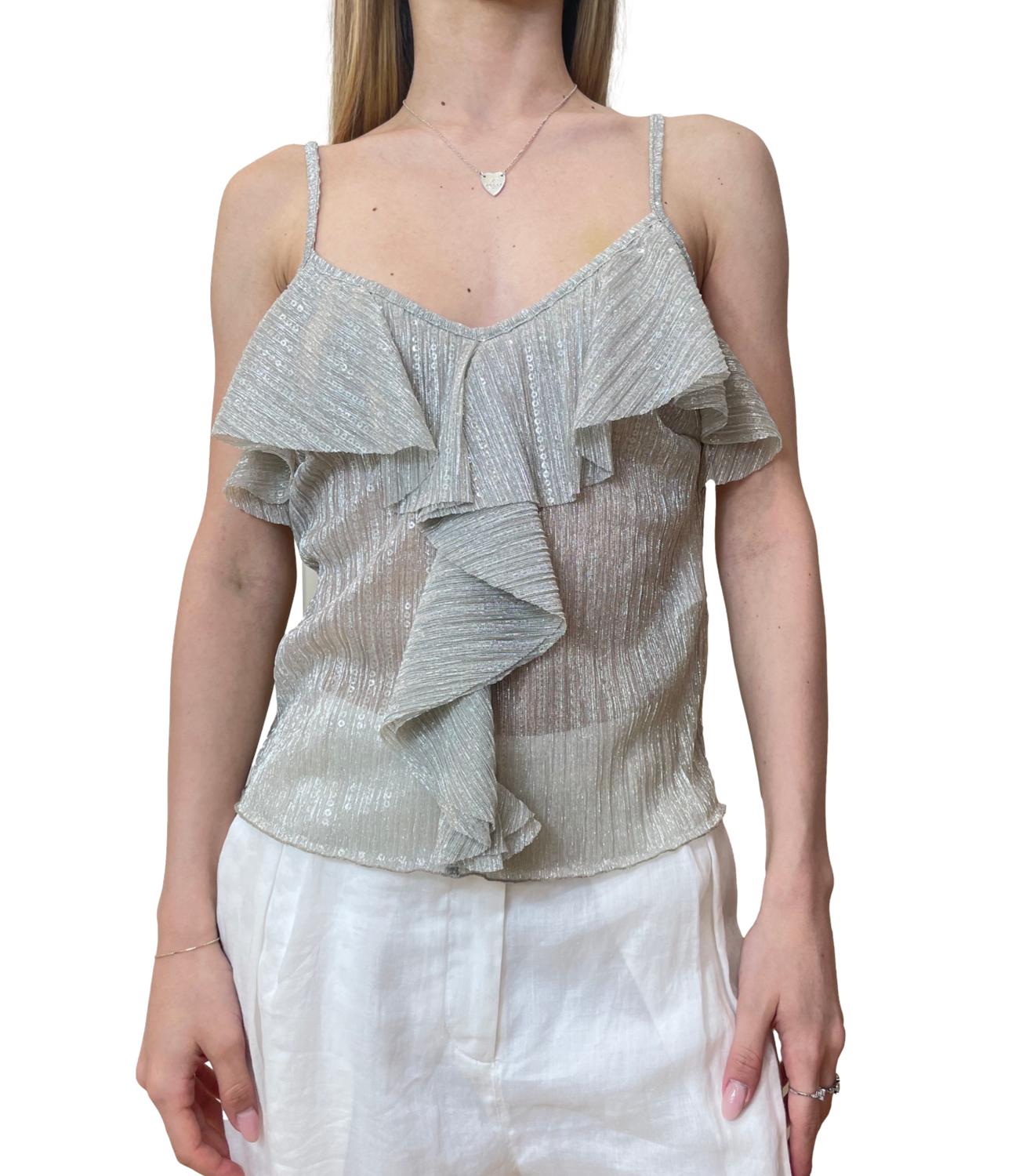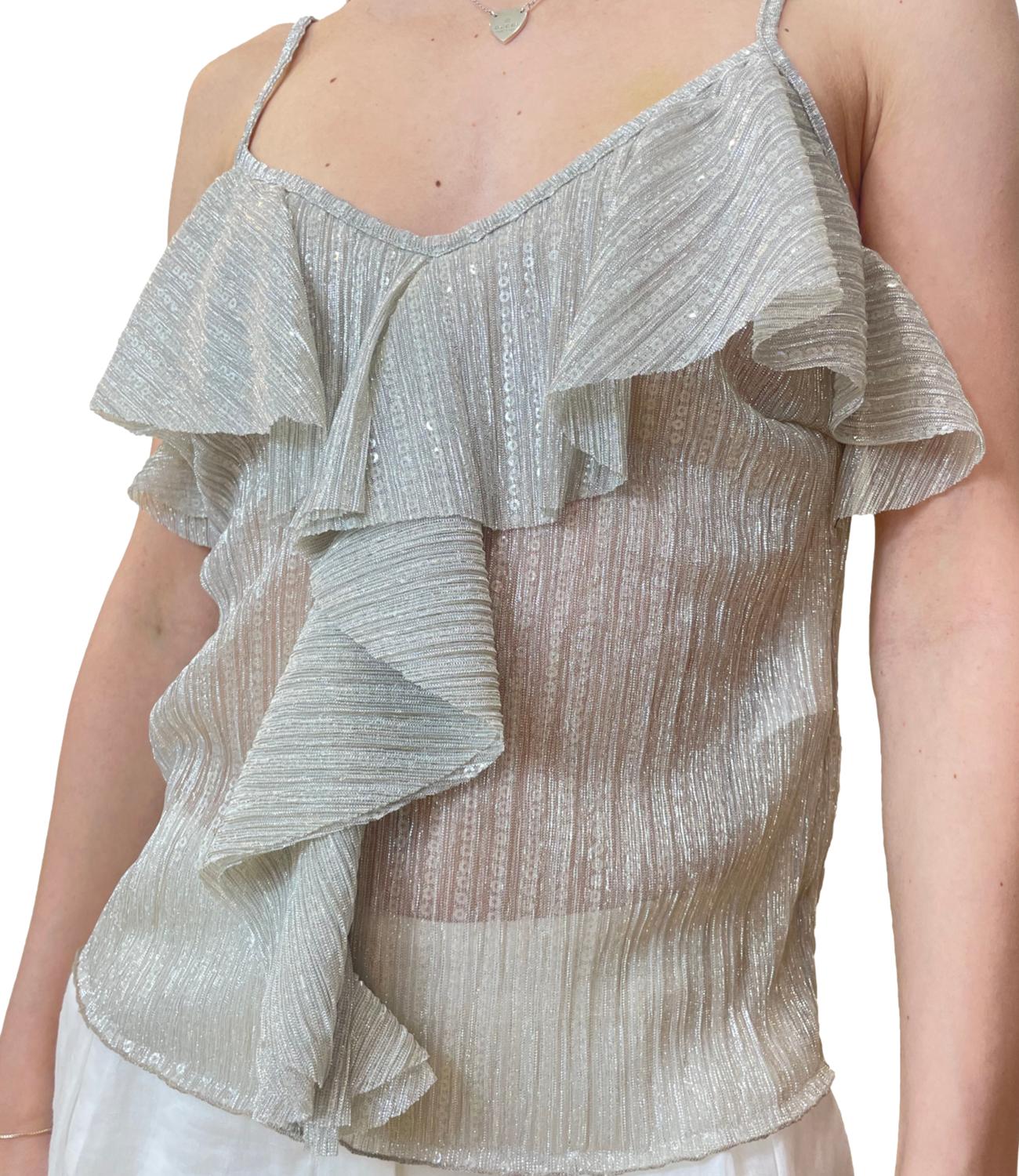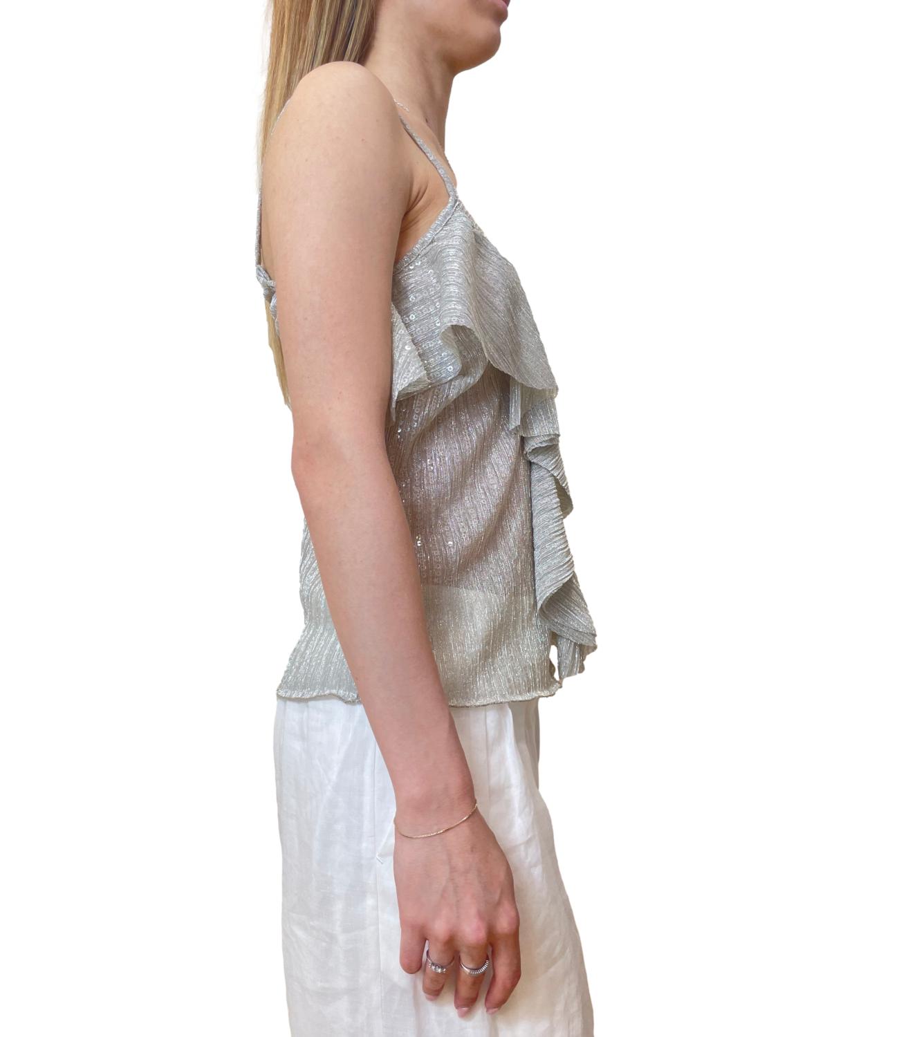 Canotta in tessuto leggero semitrasparente con paillettes caratterizzata da uno scollo a V con spalline sottili e da vaporosi volant sul davanti.