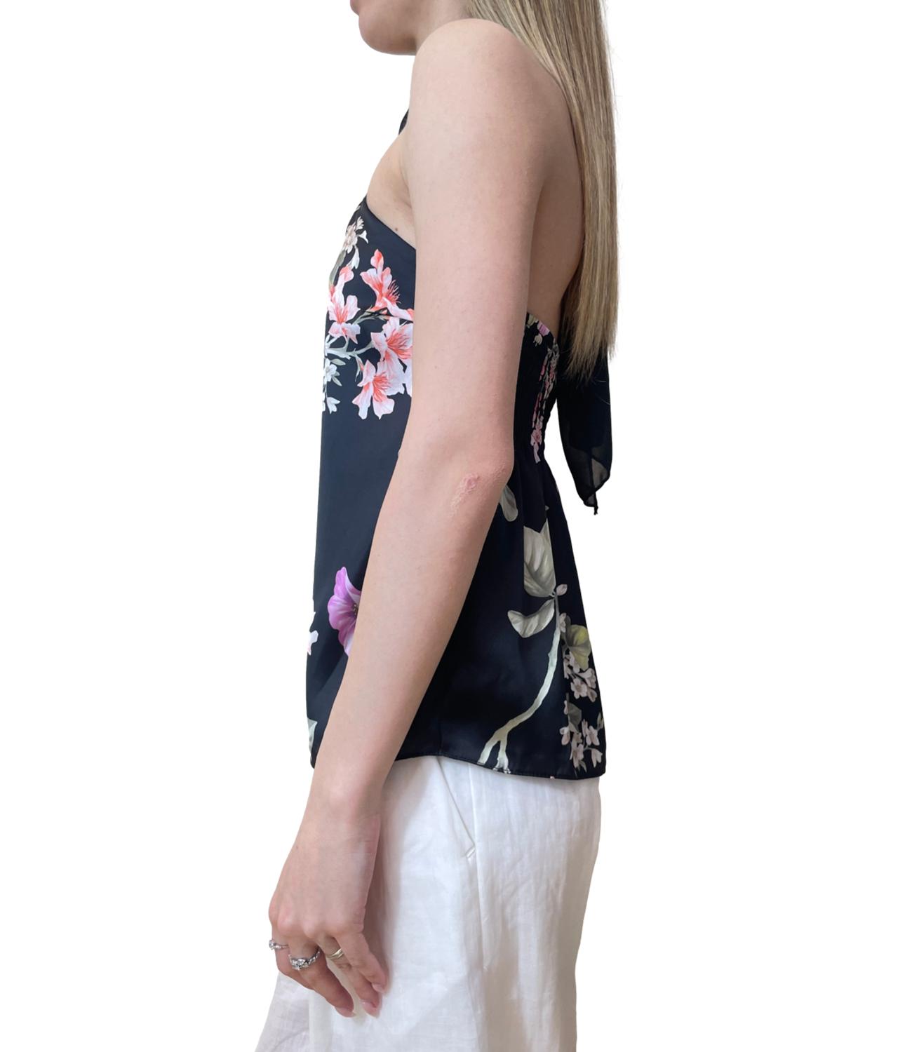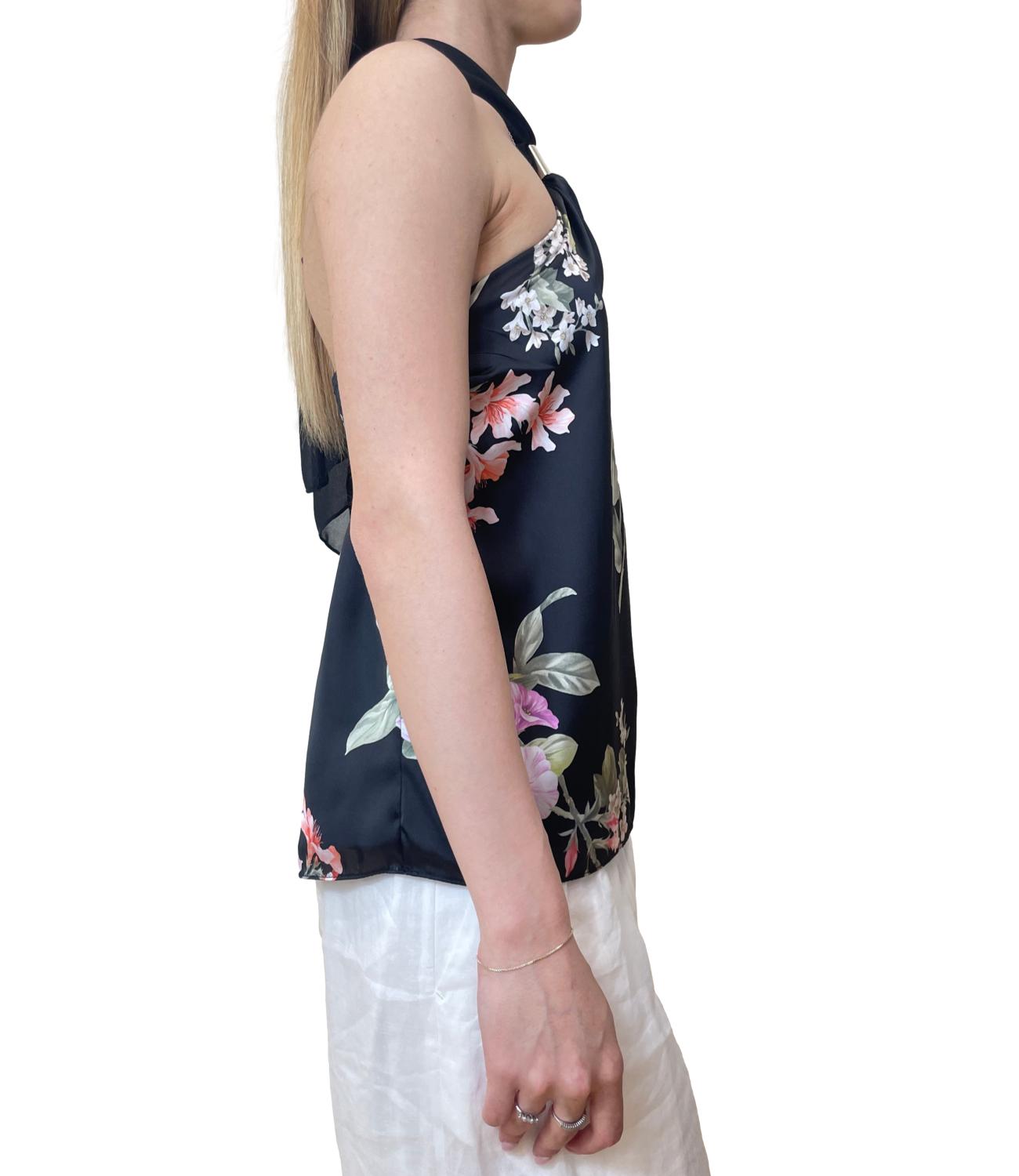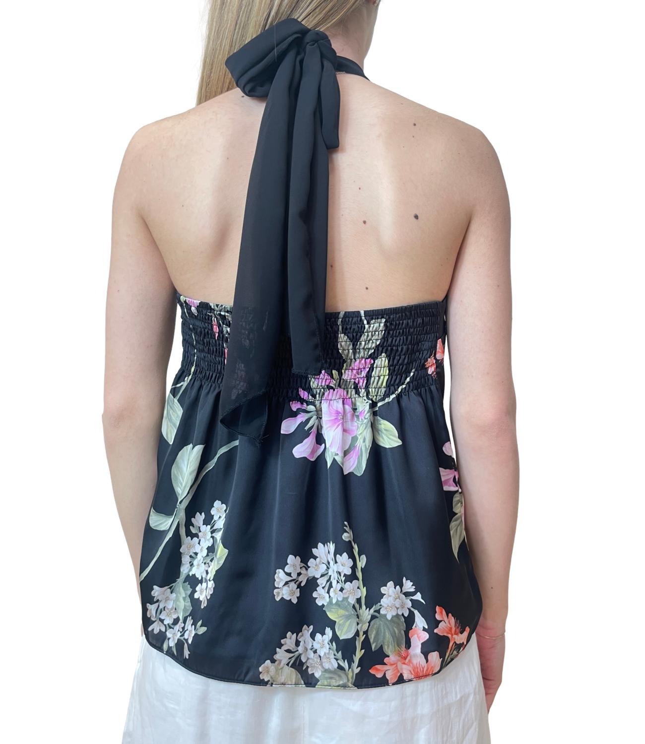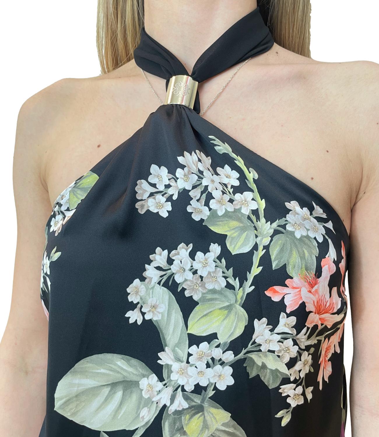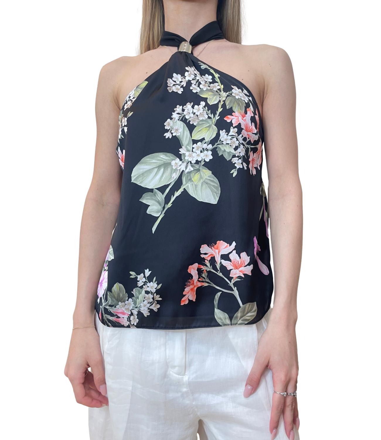 Canotta in fantasia floreale caratterizzata da uno scollo all'americana annodabile sul collo con dettaglio dorato e dal retro elasticizzato.