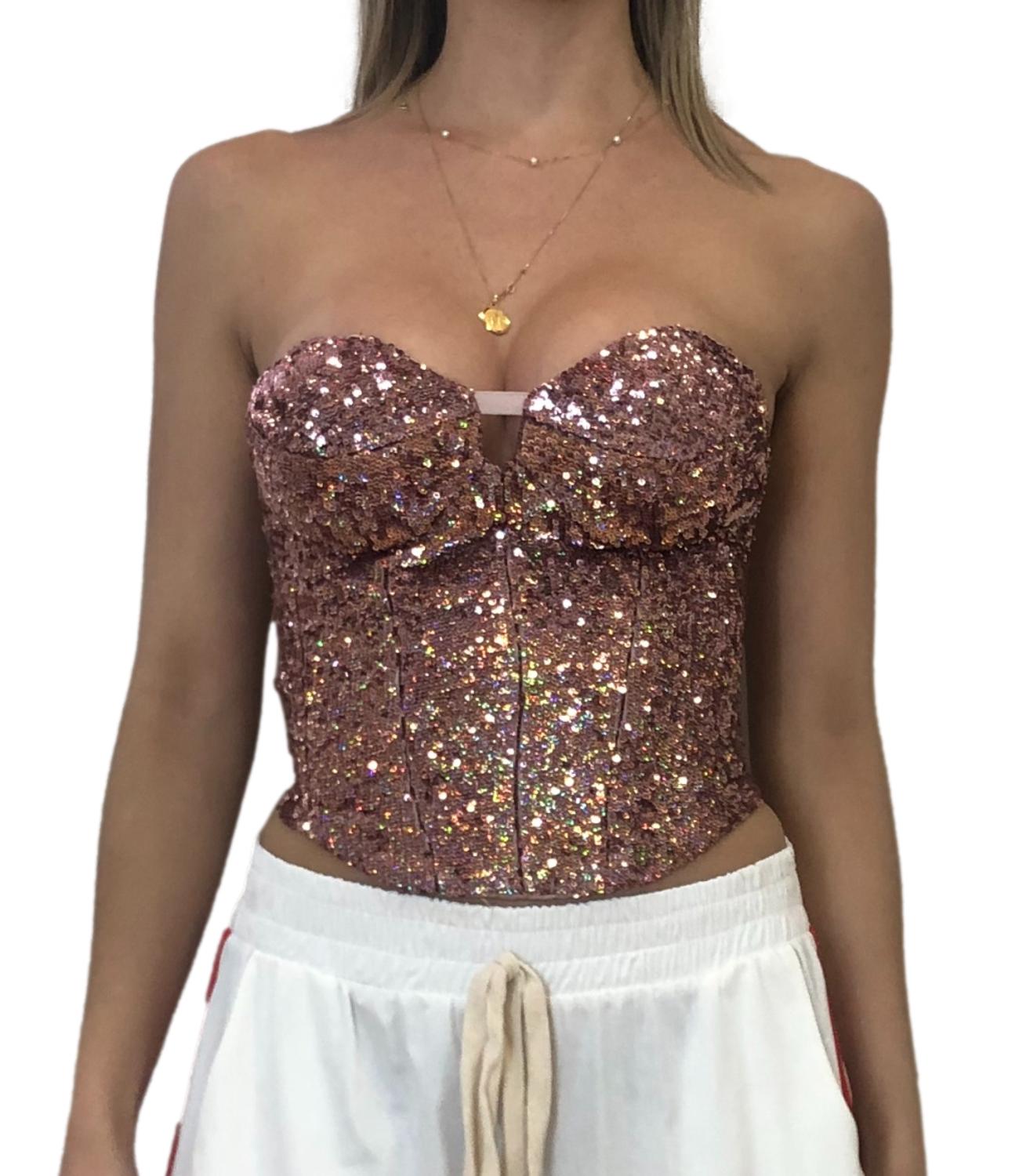 Top Silence Limited di colore verde, modello bustier interamente ricoperto di pailettes, scollo a cuore con coppe preformate leggermente imbottite, chiusura con zip sul retro. La vestibilita' è regolare.