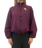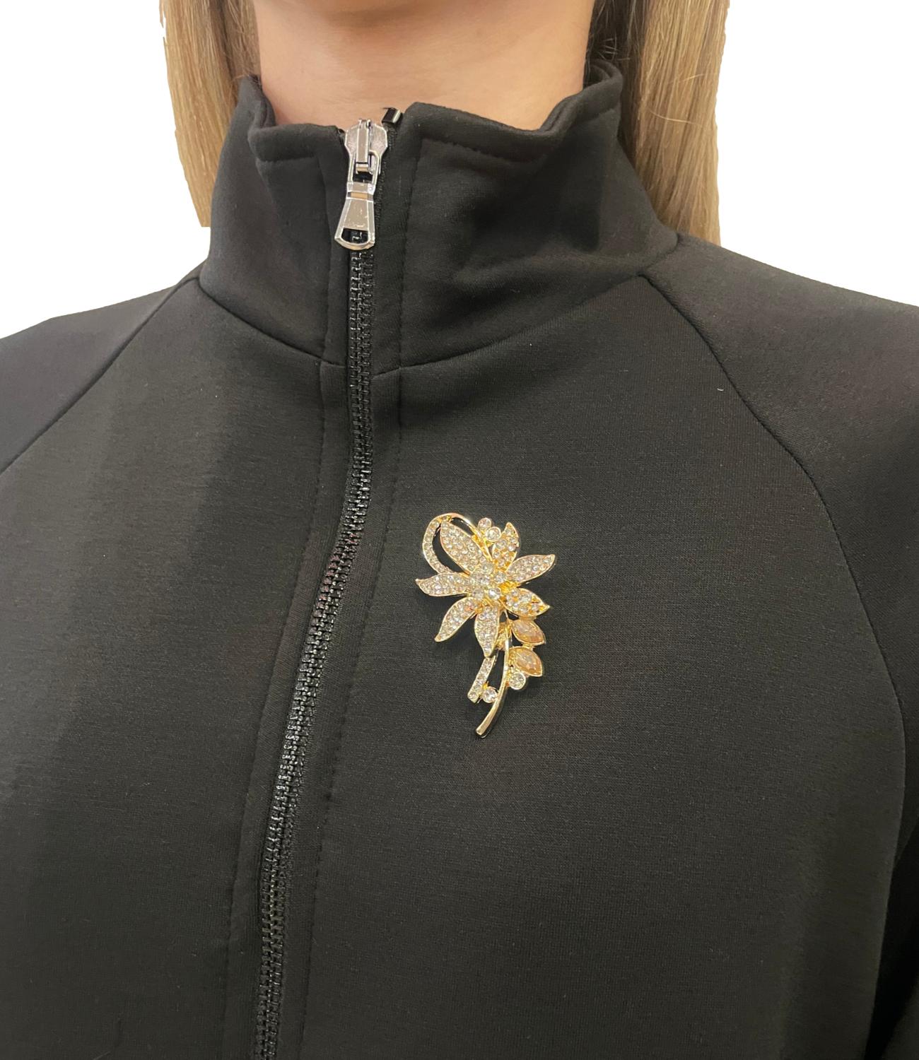 Giubbino in felpa con spilla applicata, chiusura frontale con zip ed elastico sul fondo.