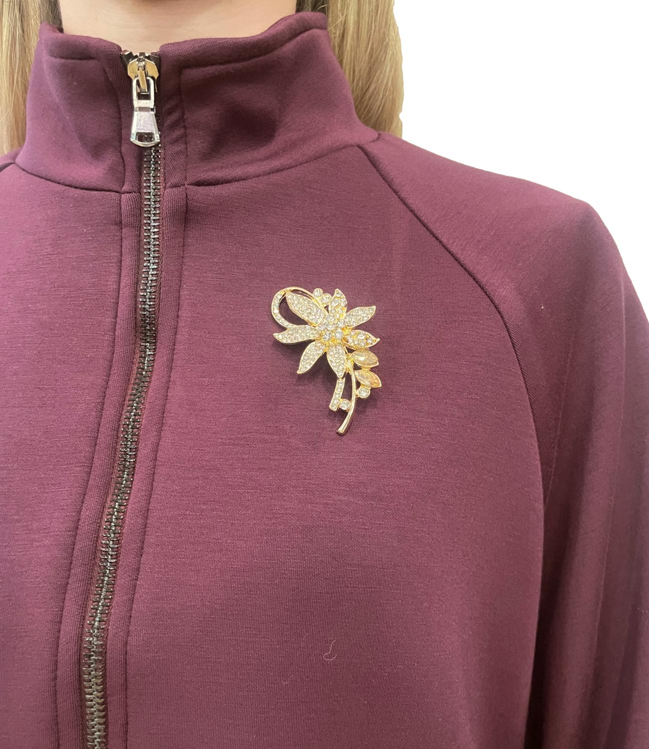 Giubbino in felpa con spilla applicata, chiusura frontale con zip ed elastico sul fondo.